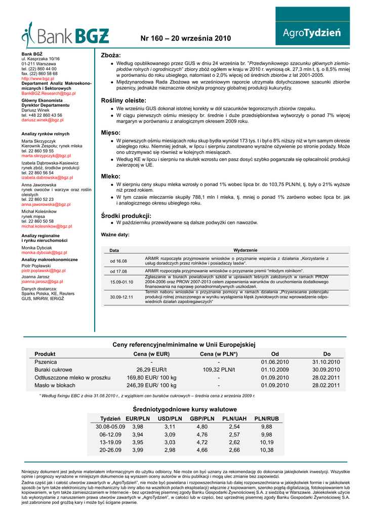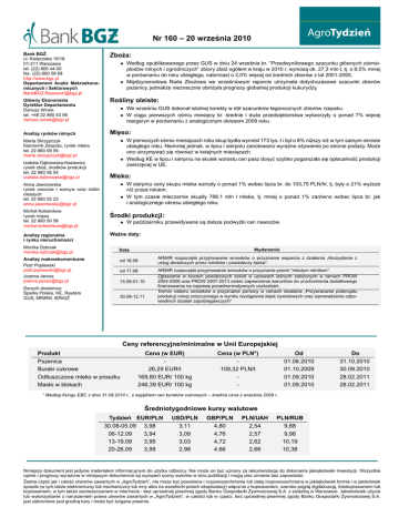 Nr 160 – 20 września 2010 Bank BGŻ ul. Kasprzaka 10/16 01-211 Warszawa tel. (22) 860 44 00 fax. (22) 860 58 68 http://www.bgz.pl Departament Analiz Makroekonomicznych i Sektorowych [email protected] Zboża: Główny Ekonomista Dyrektor Departamentu Dariusz Winek tel. +48 22 860 43 56 [email protected] Rośliny oleiste: Analizy rynków rolnych Mieso: ˛ • Według opublikowanego przez GUS w dniu 24 września br. ”Przedwynikowego szacunku głównych ziemiopłodów rolnych i ogrodniczych” zbiory zbóż ogółem w kraju w 2010 r. wyniosa˛ ok. 27,3 mln t, tj. o 8,5% mniej w porównaniu do roku ubiegłego, natomiast o 2,0% wiecej ˛ od średnich zbiorów z lat 2001-2005. • Miedzynarodowa ˛ Rada Zbożowa we wrześniowym raporcie utrzymała dotychczasowe szacunki zbiorów pszenicy, jednakże nieznacznie obniżyła prognozy globalnej produkcji kukurydzy. • We wrześniu GUS dokonał istotnej korekty w dół szacunków tegorocznych zbiorów rzepaku. • W ciagu ˛ pierwszych ośmiu miesiecy ˛ br. średnie i duże przedsiebiorstwa ˛ wytworzyły o ponad 7% wiecej ˛ margaryn w porównaniu z analogicznym okresem 2009 roku. • W pierwszych ośmiu miesiacach ˛ roku skup bydła wyniósł 173 tys. t i był o 8% niższy niż w tym samym okresie ubiegłego roku. Niemniej jednak, w lipcu i sierpniu zanotowano wyraźne ożywienie po stronie podaży. Może ono utrzymywać sie˛ również w kolejnych miesiacach. ˛ • Według KE w lipcu i sierpniu na skutek wzrostu cen pasz dosyć szybko pogarszała sie˛ opłacalność produkcji zwierz˛ecej w UE. Marta Skrzypczyk Kierownik Zespołu; rynek mleka tel. 22 860 59 55 [email protected] Izabela Dabrowska-Kasiewicz ˛ rynek zbóż, środków produkcji tel. 22 860 56 54 [email protected] Mleko: • W sierpniu ceny skupu mleka wzrosły o ponad 1% wobec lipca br. do 103,75 PLN/hl, tj. były o 21% wyższe niż przed rokiem. • W tym czasie mleczarnie skupiły 788,1 mln l mleka, tj. mniej o ponad 1% zarówno wobec lipca br. jak i analogicznego okresu ubiegłego roku. Anna Jaworowska rynek owoców i warzyw oraz roślin oleistych tel. 22 860 52 23 [email protected] Michał Koleśnikow rynek miesa ˛ tel. 22 860 50 58 [email protected] Analizy regionalne i rynku nieruchomości Monika Dybciak [email protected] Analizy makroekonomiczne Piotr Popławski [email protected] Joanna Jarosz [email protected] Danych dostarcza: Sparks Polska, KE, Reuters GUS, MRiRW, IERiGŻ Środki produkcji: • W październiku przewidywane sa˛ dalsze podwyżki cen nawozów. Ważne daty: Wydarzenie Data ARiMR rozpocz˛eła przyjmowanie wniosków o przyznanie wsparcia z działania „Korzystanie z usług doradczych przez rolników i posiadaczy lasów“. od 16.08 od 17.08 15.09-01.10 30.09-12.11 ARiMR rozpocz˛eła przyjmowanie wniosków o przyznanie premii “młodym rolnikom“. Zgłaszanie w biurach powiatowych szkód w uprawach leśnych założonych w ramach PROW 2004-2006 oraz PROW 2007-2013 celem zapewnienia warunków do uruchomienia dodatkowego finansowania na naprawe˛ ponadnormatywnych uszkodzeń. Termin naboru wniosków o przyznanie pomocy w ramach działania „Przywracanie potencjału produkcji rolnej zniszczonego w wyniku wystapienia ˛ klesk ˛ żywiołowych oraz wprowadzenie odpowiednich działań zapobiegawczych“ Ceny referencyjne/minimalne w Unii Europejskiej Produkt Pszenica Buraki cukrowe Odtłuszczone mleko w proszku Masło w blokach ∗ Cena (w EUR) 26,29 EUR/t 169,80 EUR/ 100 kg 246,39 EUR/ 100 kg Cena (w PLN*) 109,32 PLN/t - Od 01.06.2010 01.10.2009 01.09.2010 01.09.2010 Do 31.10.2010 30.09.2010 28.02.2011 28.02.2011 Według fixingu EBC z dnia 31.08.2010 r., z wyjatkiem ˛ cen buraków cukrowych – średnia cena z września 2009 r. Średniotygodniowe kursy walutowe Tydzień EUR/PLN 30.08-05.09 3,98 06-12.09 3,94 13-19.09 3,95 20-26.09 3,99 USD/PLN 3,11 3,09 3,03 2,98 GBP/PLN 4,80 4,76 4,72 4,66 PLN/UAH 2,54 2,57 2,62 2,66 PLN/RUB 9,88 9,98 10,19 10,38 Niniejszy dokument jest jedynie materiałem informacyjnym do użytku odbiorcy. Nie może on być uznany za rekomendacje˛ do dokonania jakiejkolwiek inwestycji. Wszystkie opinie i prognozy wyrażone w niniejszym dokumencie sa˛ wyrazem oceny autorów w dniu publikacji i moga˛ ulec zmianie bez zapowiedzi. Żadna cz˛eść jak i całość utworów zawartych w „AgroTydzień”, nie może być powielana i rozpowszechniania lub dalej rozpowszechniana w jakiejkolwiek formie i w jakikolwiek sposób (w tym także elektroniczny lub mechaniczny lub inny albo na wszelkich polach eksploatacji) włacznie ˛ z kopiowaniem, szeroko pojet ˛ a˛ digitalizacja, ˛ fotokopiowaniem lub kopiowaniem, w tym także zamieszczaniem w Internecie - bez uprzedniej pisemnej zgody Banku Gospodarki Żywnościowej S.A. z siedziba˛ w Warszawie. Jakiekolwiek użycie lub wykorzystanie z naruszeniem prawa utworów zawartych w „AgroTydzień”, w całości lub w cz˛eści, bez uprzedniej pisemnej zgody Banku Gospodarki Żywnościowej S.A. jest zabronione pod groźba˛ kary i może być ścigane prawnie. Nr 160 – 20 września 2010 Zboża Rynek krajowy Według opublikowanego przez GUS w dniu 24 września br. ”Przedwynikowego szacunku głównych ziemiopłodów rolnych i ogrodniczych” zbiory zbóż ogółem w kraju w 2010 r. wyniosa˛ ok. 27,3 mln t, tj. o 8,5% mniej w porównaniu do roku ubiegłego, natomiast o 2,0% wiecej ˛ od średnich zbiorów z lat 2001-2005. Ponadto, eksperci GUS szacuja, ˛ iż same zbiory zbóż podstawowych z mieszankami zbożowymi wyniosa˛ ok. 25,5 mln t, tj. o 8,9% mniej od uzyskanych w 2009 r., natomiast o 2,9% wiecej ˛ od średnich zbiorów z okresu 2001-2005. Przy czym produkcja pszenicy oceniana jest na ok. 9,5 mln t (-3,3% r/r), żyta na ok.3,3 mln t (-12,1% r/r), a jeczmienia ˛ na ponad 3,5 mln t (-11% r/r). Przecietne ˛ plony zbóż ogółem GUS szacuje w bieża˛ cym sezonie na 32,2 dt/ha, czyli o 7,5% niżej niż w 2009 r.(+ 0,9% od śr. 2001-2005). Informacje˛ te˛ należy uzupełnić uwaga˛ 