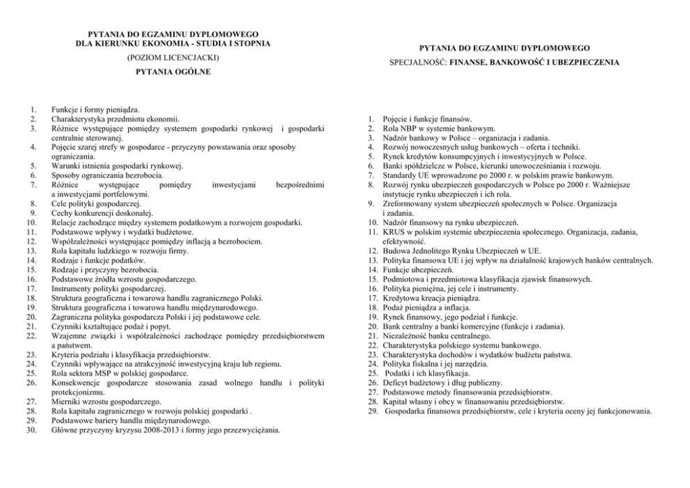 PYTANIA DO EGZAMINU DYPLOMOWEGO DLA KIERUNKU EKONOMIA - STUDIA I STOPNIA PYTANIA DO EGZAMINU DYPLOMOWEGO (POZIOM LICENCJACKI) SPECJALNOŚĆ: FINANSE, BANKOWOŚĆ I UBEZPIECZENIA PYTANIA OGÓLNE 1. 2. 3. 4. 5. 6. 7. 8. 9. 10. 11. 12. 13. 14. 15. 16. 17. 18. 19. 20. 21. 22. 23. 24. 25. 26. 27. 28. 29. 30. Funkcje i formy pieniądza. Charakterystyka przedmiotu ekonomii. Różnice występujące pomiędzy systemem gospodarki rynkowej i gospodarki centralnie sterowanej. Pojęcie szarej strefy w gospodarce - przyczyny powstawania oraz sposoby ograniczania. Warunki istnienia gospodarki rynkowej. Sposoby ograniczania bezrobocia. Różnice występujące pomiędzy inwestycjami bezpośrednimi a inwestycjami portfelowymi. Cele polityki gospodarczej. Cechy konkurencji doskonałej. Relacje zachodzące między systemem podatkowym a rozwojem gospodarki. Podstawowe wpływy i wydatki budżetowe. Współzależności występujące pomiędzy inflacją a bezrobociem. Rola kapitału ludzkiego w rozwoju firmy. Rodzaje i funkcje podatków. Rodzaje i przyczyny bezrobocia. Podstawowe źródła wzrostu gospodarczego. Instrumenty polityki gospodarczej. Struktura geograficzna i towarowa handlu zagranicznego Polski. Struktura geograficzna i towarowa handlu międzynarodowego. Zagraniczna polityka gospodarcza Polski i jej podstawowe cele. Czynniki kształtujące podaż i popyt. Wzajemne związki i współzależności zachodzące pomiędzy przedsiębiorstwem a państwem. Kryteria podziału i klasyfikacja przedsiębiorstw. Czynniki wpływające na atrakcyjność inwestycyjną kraju lub regionu. Rola sektora MSP w polskiej gospodarce. Konsekwencje gospodarcze stosowania zasad wolnego handlu i polityki protekcjonizmu. Mierniki wzrostu gospodarczego. Rola kapitału zagranicznego w rozwoju polskiej gospodarki . Podstawowe bariery handlu międzynarodowego. Główne przyczyny kryzysu 2008-2013 i formy jego przezwyciężania. 1. 2. 3. 4. 5. 6. 7. 8. 9. 10. 11. 12. 13. 14. 15. 16. 17. 18. 19. 20. 21. 22. 23. 24. 25. 26. 27. 28. 29. Pojęcie i funkcje finansów. Rola NBP w systemie bankowym. Nadzór bankowy w Polsce – organizacja i zadania. Rozwój nowoczesnych usług bankowych – oferta i techniki. Rynek kredytów konsumpcyjnych i inwestycyjnych w Polsce. Banki spółdzielcze w Polsce, kierunki unowocześniania i rozwoju. Standardy UE wprowadzone po 2000 r. w polskim prawie bankowym. Rozwój rynku ubezpieczeń gospodarczych w Polsce po 2000 r. Ważniejsze instytucje rynku ubezpieczeń i ich rola. Zreformowany system ubezpieczeń społecznych w Polsce. Organizacja i zadania. Nadzór finansowy na rynku ubezpieczeń. KRUS w polskim systemie ubezpieczenia społecznego. Organizacja, zadania, efektywność. Budowa Jednolitego Rynku Ubezpieczeń w UE. Polityka finansowa UE i jej wpływ na działalność krajowych banków centralnych. Funkcje ubezpieczeń. Podmiotowa i przedmiotowa klasyfikacja zjawisk finansowych. Polityka pieniężna, jej cele i instrumenty. Kredytowa kreacja pieniądza. Podaż pieniądza a inflacja. Rynek finansowy, jego podział i funkcje. Bank centralny a banki komercyjne (funkcje i zadania). Niezależność banku centralnego. Charakterystyka polskiego systemu bankowego. Charakterystyka dochodów i wydatków budżetu państwa. Polityka fiskalna i jej narzędzia. Podatki i ich klasyfikacja. Deficyt budżetowy i dług publiczny. Podstawowe metody finansowania przedsiębiorstw. Kapitał własny i obcy w finansowaniu przedsiębiorstw. Gospodarka finansowa przedsiębiorstw, cele i kryteria oceny jej funkcjonowania.