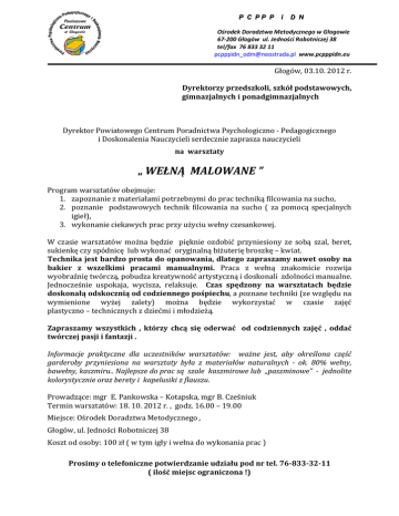 P C PP P i D N Ośrodek Doradztwa Metodycznego w Głogowie 67-200 Głogów ul. Jedności Robotniczej 38 tel/fax 76 833 32 11 [email protected] www.pcpppidn.eu Głogów, 03.10. 2012 r. Dyrektorzy przedszkoli, szkół podstawowych, gimnazjalnych i ponadgimnazjalnych Dyrektor Powiatowego Centrum Poradnictwa Psychologiczno - Pedagogicznego i Doskonalenia Nauczycieli serdecznie zaprasza nauczycieli na warsztaty „ WEŁNĄ MALOWANE ” Program warsztatów obejmuje: 1. zapoznanie z materiałami potrzebnymi do prac techniką filcowania na sucho, 2. poznanie podstawowych technik filcowania na sucho ( za pomocą specjalnych igieł), 3. wykonanie ciekawych prac przy użyciu wełny czesankowej. W czasie warsztatów można będzie pięknie ozdobić przyniesiony ze sobą szal, beret, sukienkę czy spódnicę lub wykonać oryginalną biżuterię broszkę – kwiat. Technika jest bardzo prosta do opanowania, dlatego zapraszamy nawet osoby na bakier z wszelkimi pracami manualnymi. Praca z wełną znakomicie rozwija wyobraźnię twórczą, pobudza kreatywność artystyczną i doskonali zdolności manualne. Jednocześnie uspokaja, wycisza, relaksuje. Czas spędzony na warsztatach będzie doskonałą odskocznią od codziennego pośpiechu, a poznane techniki (ze względu na wymienione wyżej zalety) można będzie wykorzystać w czasie zajęć plastyczno – technicznych z dziećmi i młodzieżą. Zapraszamy wszystkich , którzy chcą się oderwać od codziennych zajęć , oddać twórczej pasji i fantazji . Informacje praktyczne dla uczestników warsztatów: ważne jest, aby określona część garderoby przyniesiona na warsztaty była z materiałów naturalnych - ok. 80% wełny, bawełny, kaszmiru.. Najlepsze do prac są szale kaszmirowe lub „paszminowe” - jednolite kolorystycznie oraz berety i kapelusiki z flauszu. Prowadzące: mgr E. Pankowska – Kotapska, mgr B. Cześniuk Termin warsztatów: 18. 10. 2012 r. , godz. 16.00 – 19.00 Miejsce: Ośrodek Doradztwa Metodycznego , Głogów, ul. Jedności Robotniczej 38 Koszt od osoby: 100 zł ( w tym igły i wełna do wykonania prac ) Prosimy o telefoniczne potwierdzanie udziału pod nr tel. 76-833-32-11 ( ilość miejsc ograniczona !)
