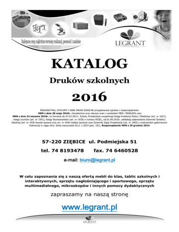 KATALOG Druków szkolnych 2016 ŚWIADECTWA, DYPLOMY I INNE DRUKI SZKOLNE przygotowane zgodnie z rozporządzeniem MEN z dnia 28 maja 2010r. (świadectwa oraz arkusze ocen z symbolem MEN i PESELEM) oraz MEN z dnia 24 sierpnia 2010r. (w terminie do 01.03.2011r. Szkoły, Przedszkola uzupełniają Księgi Ewidencji Dzieci i Młodzieży (art. nr 1627), Księgi Uczniów (art. nr 1591), Księgi Wychowanków (art. nr 1939) o numery PESEL, od 01.09.2010r. zakładają odpowiednio Dzienniki Świetlicy Szkolnej (art. nr 1936 twarda oprawa oraz art. nr 1940 miękka oprawa) oraz Dzienniki Zajęć Przedszkola (art. nr 1565) z rozliczeniem godzinowym frekwencji w ciągu dnia. Karta nauczyciela Dz.U. z 2014 (poz. 191), Rozporządzenie MEN z 29 grudnia 2014 57-220 ZIĘBICE ul. Podmiejska 51 tel. 74 8193478 fax. 74 6460528 e-mail: [email protected] W celu zapoznania się z naszą ofertą mebli do klas, tablic szkolnych i interaktywnych, sprzętu nagłośniającego i sportowego, sprzętu multimedialnego, mikroskopów i innych pomocy dydaktycznych zapraszamy na naszą stronę www.legrant.pl Symbol Przeznaczenie GILOSZE Gilosz do świadectw dwustronnych Gilosz do świadectw dwustronnych z wyróżnieniem Gilosz do świadectw czterostronnych Gilosz do świadectw czterostronnych z wyróżnieniem Format Cena netto A4 A4 A3 A3 0,14 0,15 0,26 0,27 A4 0,17 A4 A4 0,17 0,18 A4 0,17 A4 A4 0,17 0,18 A4 0,17 A4 A4 A4 0,17 0,18 0,17 A4 0,17 A4 A4 A4 0,17 0,18 0,17 A4 0,17 A4 A4 0,17 0,18 A4 A4 0,17 0,18 A4 0,17 A4 0,17 A4 A4 0,17 0,18 A4 A4 0,17 0,18 A3 A3 0,28 0,29 Prosimy podać kolor lub symbol świadectwa, które ma być drukowane MEN I/1/2 MEN I/3a/2 MEN I/3aw/2 MEN I/4/2 MEN I/6a/2 MEN I/6aw/2 MEN I/7/2 MEN I/9/2 MEN I/9w/2 MEN I/10/2 MEN I/11/2 MEN I/13a/2 MEN I/13aw/2 MEN I/14a/2 MEN I/15a/2 MEN I/17a/2 MEN I/17aw/2 MEN I/18a/2 MEN I/18aw/2 MEN I/19/2 MEN I/20/2 MEN I/21a/2 MEN I/21aw/2 MEN I/23a/2 MEN I/23aw/2 MEN I/27a/2 MEN I/27aw/2 ŚWIADECTWA PROMOCYJNE SZKOŁY PODSTAWOWEJ Dla uczniów klas I-III szkoły podstawowej, w tym dla uczniów z upośledzeniem umysłowym w stopniu umiarkowanym lub znacznym Dla uczniów klasy IV i V szkoły podstawowej Dla uczniów klasy IV i V szkoły podstawowej z wyróżnieniem Dla uczniów z upośledzeniem umysłowym w stopniu umiarkowanym lub znacznym do klas IV i V szkoły podstawowej ŚWIADECTWA UKOŃCZENIA SZKOŁY PODSTAWOWEJ Dla uczniów szkoły podstawowej Dla uczniów szkoły podstawowej z wyróżnieniem Dla uczniów z upośledzeniem umysłowym w stopniu umiarkowanym lub znacznym uczęszczających do szkoły podstawowej ŚWIADECTWA PROMOCYJNE GIMNAZJUM Dla uczniów klas I i II gimnazjum Dla uczniów klas I i II gimnazjum z wyróżnieniem Dla uczniów klas I i II oddziałów przysposabiających do pracy organizowanych w gimnazjum Dla uczniów z upośledzeniem umysłowym umiarkowanym lub znacznym uczęszczających do gimnazjum ŚWIADECTWA UKOŃCZENIA GIMNAZJUM Dla uczniów gimnazjum oraz słuchaczy gimnazjum dla dorosłych Dla uczniów gimnazjum z wyróżnieniem Dla uczniów oddziałów przysposabiających do pracy organizowanych w gimnazjum Dla uczniów z upośledzeniem umysłowym umiarkowanym lub znacznym uczęszczających do gimnazjum ŚWIADECTWA PROMOCYJNE ZASADNICZEJ SZKOŁY ZAWODOWEJ Dla uczniów klasy I i II zasadniczej szkoły zawodowej Dla uczniów klasy I i II zasadniczej szkoły zawodowej z wyróżnieniem ŚWIADECTWA UKOŃCZENIA ZASADNICZEJ SZKOŁY ZAWODOWEJ Dla uczniów zasadniczej szkoły zawodowej dla młodzieży Dla uczniów zasadniczej szkoły zawodowej z wyróżnieniem ŚWIADECTWA PROMOCYJNE SZKOŁY SPECJALNEJ Dla uczniów klas I i II szkoły specjalnej przysposabiającej do pracy dla uczniów z upośledzeniem umysłowym w stopniu umiarkowanym lub znacznym oraz dla uczniów z niepełnosprawnościami sprzężonymi ŚWIADECTWA UKOŃCZENIA SZKOŁY SPECJALNEJ Dla uczniów szkoły specjalnej przysposabiającej do pracy dla uczniów z upośledzeniem umysłowym w stopniu umiarkowanym lub znacznym oraz dla uczniów z niepełnosprawnościami sprzężonymi ŚWIADECTWA PROMOCYJNE LICEUM OGÓLNOKSZTAŁCĄCEGO Dla uczniów klasy I i II liceum ogólnokształcącego Dla uczniów klasy I i II liceum ogólnokształcącego z wyróżnieniem ŚWIADECTWA UKOŃCZENIA LICEUM OGÓLNOKSZTAŁCĄCEGO Dla uczniów liceum ogólnokształcącego Dla uczniów liceum ogólnokształcącego z wyróżnieniem ŚWIADECTWA PROMOCYJNE TECHNIKUM Dla uczniów klasy I - III technikum Dla uczniów klasy I - III technikum z wyróżnieniem MEN I/47a/2 ŚWIADECTWA UKOŃCZENIA TECHNIKUM Dla uczniów technikum Dla uczniów technikum z wyróżnieniem ŚWIADECTWA UKOŃCZENIA SZKOŁY POLICEALNEJ Dla uczniów szkoły policealnej Dla słuchaczy szkoły policealnej dla dorosłych ARKUSZE OCEN Dla uczniów szkoły podstawowej dla dzieci i młodzieży oraz słuchaczy szkoły podstawowej dla dorosłych prowadzonej w formie stacjonarnej Dla uczniów z upośledzeniem umysłowym w stopniu umiarkowanym lub znacznym, uczęszczających do szkoły podstawowej Dla uczniów gimnazjum dla dzieci i młodzieży oraz słuchaczy gimnazjum dla dorosłych prowadzonego w formie stacjonarnej Dla uczniów z upośledzeniem umysłowym w stopniu umiarkowanym lub znacznym, uczęszczających do gimnazjum Dla uczniów z upośledzeniem umysłowym w stopniu umiarkowanym lub znacznym oraz dla uczniów ze sprzężonymi niepełnosprawnościami, uczęszczających do szkoły specjalnej przysposabiającej do pracy Dla uczniów liceum ogólnokształcącego i uzupełniającego liceum ogólnokształcącego dla młodzieży oraz słuchaczy liceum ogólnokształcącego i uzupełniającego liceum ogólnokształcącego dla dorosłych prowadzonych w formie stacjonarnej Dla uczniów technikum i technikum uzupełniającego oraz słuchaczy technikum i technikum uzupełniającego dla dorosłych prowadzonych w formie stacjonarnej Dla uczniów zasadniczej szkoły zawodowej dla młodzieży I słuchaczy zasadniczej szkoły zawodowej dla dorosłych prowadzonej w form
