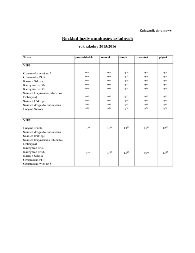 Załącznik do umowy Rozkład jazdy autobusów szkolnych rok szkolny 2015/2016 Trasa poniedziałek wtorek środa czwartek piątek VII/1 Czarnuszka wieś nr 5 Czarnuszka PGR Karmin Szkoła Kaczyniec nr 56 Kaczyniec nr 53 Sośnica krzyżówka(IzbicznoDobrzyca) Sośnica k/sklepu Sośnica droga do Fabianowa Lutynia Szkoła 720 725 730 733 734 720 725 730 733 734 720 725 730 733 734 720 725 730 733 734 720 725 730 733 734 737 740 741 750 737 740 741 750 737 740 741 750 737 740 741 750 737 740 741 750 1330 1330 1330 1330 1250 1345 1345 1345 1345 1345 VII/2 Lutynia szkoła Sośnica droga do Fabianowa Sośnica k/sklepu Sośnica krzyżówka (IzbicznoDobrzyca) Kaczyniec nr 53 Kaczyniec nr 56 Karmin Szkoła Czarnuszka PGR Czarnuszka wieś nr 5 Załącznik do umowy Rozkład jazdy autobusów szkolnych rok szkolny 2015/2016 Trasa V/1 Olesie Galew parcele wschodnie nr 90 Galew parcele zachodnie nr 115 Galew krzyżówka (dawniej PKS) Trzebin nr 24 Trzebin nr 4(dawniej PKS) Dobrzyca, ul. Parkowa nr 19 Dobrzyca ul. Szkolna ( hala sportowa) V/2 Dobrzyca ul. Szkolna ( hala sportowa) Olesie Galew parcele wschodnie nr 90 Galew parcele zachodnie nr 115 Galew krzyżówka (dawniej PKS) Trzebin nr 24 Trzebin nr 4 (dawniej PKS) Dobrzyca, ul. Parkowa nr 19 poniedziałek wtorek środa czwartek piątek 715 718 723 728 730 735 737 740 715 718 723 728 730 735 737 740 715 718 723 728 730 735 737 740 715 718 723 728 730 735 737 740 715 718 723 728 730 735 737 740 1430 1515 1430 1430 1335 Załącznik do umowy Rozkład jazdy autobusów szkolnych rok szkolny 2015/2016 poniedziałek Trasa III/1 Izbiczno k/sali Karminiec szkoła Gustawów (pomiędzy nr 10-9) Karminek osiedle ok. nr 20 Karminek k/sklepu Karmin szkoła Karminiec szkoła Koźminiec (krzyżówka Ostrów- Budy-Dobrzyca) Koźminiec sklep Dobrzyca ul. Szkolna (hala sportowa) wtorek środa czwartek piątek 715 718 720 715 718 720 715 718 720 715 718 720 715 718 720 722 726 735 740 745 722 726 735 740 745 722 726 735 740 745 722 726 735 740 745 722 726 735 740 745 746 750 746 750 746 750 746 750 746 750 1435 1515 1435 1435 1335 III/2 Dobrzyca ul. Szkolna (hala sportowa) Izbiczno nr 7 Izbiczno k/sali Koźminiec k/sklepu Koźminiec (krzyżówka Ostrów- Budy-Dobrzyca) Załącznik do umowy Rozkład jazdy autobusów szkolnych rok szkolny 2015/2016 Trasa poniedziałek wtorek środa czwartek piątek IV/1 Fabianów k/sklepu Ruda nr 6 Lutynia szkoła Dobrzyca ul. Szkolna (hala sportowa) 720 727 733 735 750 720 727 733 735 750 720 727 733 735 750 720 727 733 735 750 720 727 733 735 750 1430 1515 1430 1430 1335 IV/2 Dobrzyca ul. Szkolna (hala sportowa) Fabianów k/sklepu Lutynia szkoła Rozkład jazdy autobusów szkolnych Załącznik do umowy rok szkolny 2015/2016 Zadanie /Trasa I/1 poniedziałek wtorek środa czwartek piątek Polskie Olędry nr 84 Polskie Olędry przystanek przy bocznej drodze nr 72 Polskie Olędry - Cegielnia Polskie Olędry /krzyżówka Polskie Olędry k/szkoły Polskie Olędry nr 49 k/figury Polskie Olędry nr 68 Polskie Olędry krzyżówka k/lasu Dobrzyca ul. Szkolna (hala sportowa) Dobrzyca ul. Krotoszyńska – przedszkole Nowy Świat 725 725 725 725 725 726 728 731 733 736 738 740 745 726 728 731 733 736 738 740 745 726 728 731 733 736 738 740 745 726 728 731 733 736 738 740 745 726 728 731 733 736 738 740 745 750 750 750 750 750 Dobrzyca ul. Krotoszyńska – przedszkole Nowy Świat Dobrzyca ul. Szkolna (hala sportowa Polskie Olędry krzyżówka k/lasu Polskie Olędry nr 84 Polskie Olędry przystanek przy bocznej drodze nr 72 Polskie Olędry - Cegielnia Polskie Olędry krzyżówka Polskie Olędry k/szkoły Polskie Olędry nr 49 k/figury Polskie Olędry nr 68 1330 1330 1330 1330 1235 Dobrzyca ul. Krotoszyńska – przedszkole Nowy Świat Dobrzyca ul. Szkolna (hala sportowa Polskie Olędry krzyżówka k/lasu Polskie Olędry nr 84 Polskie Olędry przystanek przy bocznej drodze nr 72 Polskie Olędry - Cegielnia Polskie Olędry krzyżówka Polskie Olędry k/szkoły Polskie Olędry nr 49 k/figury Polskie Olędry nr 68 1440 1515 1440 1440 1335 I/2 I/3 Rozkład jazdy autobusów szkolnych Załącznik do umowy rok szkolny 2015/2016 Zadanie /Trasa II/ 1 Sośnica k/sklepu Sośnica –Kaczyniec nr 56 Sośnica k/ Jankowskiego Sośnica krzyżówka Izbiczno-Dobrzyca Sośniczka nr 14 sala Izbiczno k/sali Izbiczno nr 7 Izbiczno k/lasu Nowy Świat k/przedszkola Dobrzyca ul. Szkolna (hala sportowa) poniedziałek wtorek środa czwartek piątek 715 718 720 722 726 731 735 737 743 748 715 718 720 722 726 731 735 737 743 748 715 718 720 722 726 731 735 737 743 748 715 718 720 722 726 731 735 737 743 748 715 718 720 722 726 731 735 737 743 748 Dobrzyca ul. Szkolna (hala sportowa) Nowy Świat k/ przedszkola Izbiczno k/lasu Izbiczno nr 7 Izbiczno k/sali Sośniczka nr 14 sala Sośnica krzyżówka Izbiczno-Dobrzyca Sośnica k/sklepu Sośnica –Kaczyniec 56 Karmin Szkoła Karminek osiedle ok. nr 20 Karminek k/sklepu Gustawów (pomiędzy nr 10-9) Karminiec szkoła Izbiczno k/sali II/3 1310 1313 1310 1313 1310 1313 1310 1313 1310 1313 1330 1330 1330 1330 1330 Dobrzyca ul. Szkolna (hala sportowa) Sośnica (krzyżówka Izbiczno-Dobrzyca) Sośnica k/sklepu Karmin – szkoła Karminek osiedle ok. nr 20 Karminek k/sklepu Gustawów (pomiędzy nr 10-9) Karminiec szkoła Sośniczka nr 14 k/sali 1435 1515 1435 1435 1335 1445 1525 1445 1445 1345 II/2