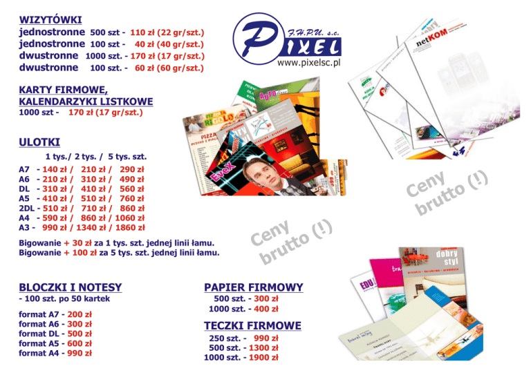 WIZYTÓWKI jednostronne 500 szt - 110 zł (22 gr/szt.) jednostronne 100 szt - 40 zł (40 gr/szt.) dwustronne 1000 szt. - 170 zł (17 gr/szt.) dwustronne 100 szt. - 60 zł (60 gr/szt.) www.pixelsc.pl KARTY FIRMOWE, KALENDARZYKI LISTKOWE 1000 szt - 170 zł (17 gr/szt.) ULOTKI 1 tys./ 2 tys. / 5 tys. szt. A7 - 140 zł / 210 zł / 290 zł A6 - 210 zł / 310 zł / 490 zł DL - 310 zł / 410 zł / 560 zł A5 - 410 zł / 510 zł / 760 zł 2DL - 510 zł / 710 zł / 860 zł A4 - 590 zł / 860 zł / 1060 zł A3 - 990 zł / 1340 zł / 1860 zł Bigowanie + 30 zł za 1 tys. szt. jednej linii łamu. Bigowanie + 100 zł za 5 tys. szt. jednej linii łamu. BLOCZKI I NOTESY - 100 szt. po 50 kartek format A7 - 200 zł format A6 - 300 zł format DL - 500 zł format A5 - 600 zł format A4 - 990 zł y (!) n Ce tto u r b PAPIER FIRMOWY 500 szt. - 300 zł 1000 szt. - 400 zł TECZKI FIRMOWE 250 szt. - 990 zł 500 szt. - 1300 zł 1000 szt. - 1900 zł y (!) n Ce tto u r b