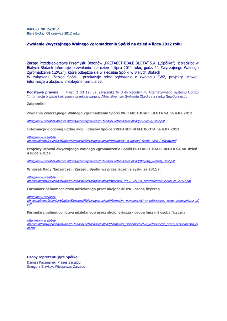 RAPORT NR 15/2012 Białe Błota, 08 czerwca 2012 roku Zwołanie Zwyczajnego Walnego Zgromadzenia Spółki na dzień 4 lipca 2012 roku Zarząd Przedsiębiorstwa Przemysłu Betonów „PREFABET-BIAŁE BŁOTA” S.A. („Spółka”) z siedzibą w Białych Błotach informuje o zwołaniu na dzień 4 lipca 2011 roku, godz. 11 Zwyczajnego Walnego Zgromadzenia („ZWZ”), które odbędzie się w siedzibie Spółki w Białych Błotach W załączeniu Zarząd Spółki przekazuje tekst ogłoszenia o zwołaniu ZWZ, projekty uchwał, informację o akcjach, niezbędne formularze. Podstawa prawna: § 4 ust. 2 pkt 1) i 3) Załącznika Nr 3 do Regulaminu Alternatywnego Systemu Obrotu "Informacje bieżące i okresowe przekazywane w Alternatywnym Systemie Obrotu na rynku NewConnect". Załączniki: Zwołanie Zwyczajnego Walnego Zgromadzenia Spółki PREFABET-BIAŁE BŁOTA SA na 4.07.2012 http://www.prefabet-bb.com.pl/cms/js/xinha/plugins/ExtendedFileManager/upload/Zwolanie_ZWZ.pdf Informacja o ogólnej liczbie akcji i głosów Spółce PREFABET-BIAŁE BŁOTA na 4.07.2012 http://www.prefabetbb.com.pl/cms/js/xinha/plugins/ExtendedFileManager/upload/Informacja_o_ogolnej_liczbie_akcji_i_glosow.pdf Projekty uchwał Zwyczajnego Walnego Zgromadzenia Spólki PREFABET-BIAŁE BŁOTA SA na dzień 4 lipca 2012 r. http://www.prefabet-bb.com.pl/cms/js/xinha/plugins/ExtendedFileManager/upload/Projekty_uchwal_ZWZ.pdf Wniosek Rady Nadzorczej i Zarządu Spółki ws przeznaczenia zysku za 2011 r. http://www.prefabetbb.com.pl/cms/js/xinha/plugins/ExtendedFileManager/upload/Wniosek_RN_i__ZS_ws_przeznaczenia_zysku_za_2011r.pdf Formularz pełnomocnictwa udzielanego przez akcjonariusza - osobę fizyczną http://www.prefabetbb.com.pl/cms/js/xinha/plugins/ExtendedFileManager/upload/Formularz_pelnomocnictwa_udzielanego_przez_akcjonariusza_of. pdf Formularz pełnomocnictwa udzielanego przez akcjonariusza - osobę inną niż osoba fizyczna http://www.prefabetbb.com.pl/cms/js/xinha/plugins/ExtendedFileManager/upload/Formularz_pelnomocnictwa_udzielanego_przez_akcjonariusza_oi nf.pdf Osoby reprezentujące Spółkę: Dariusz Kaczmarek, Prezes Zarządu Grzegorz Brzykcy, Wiceprezes Zarządu