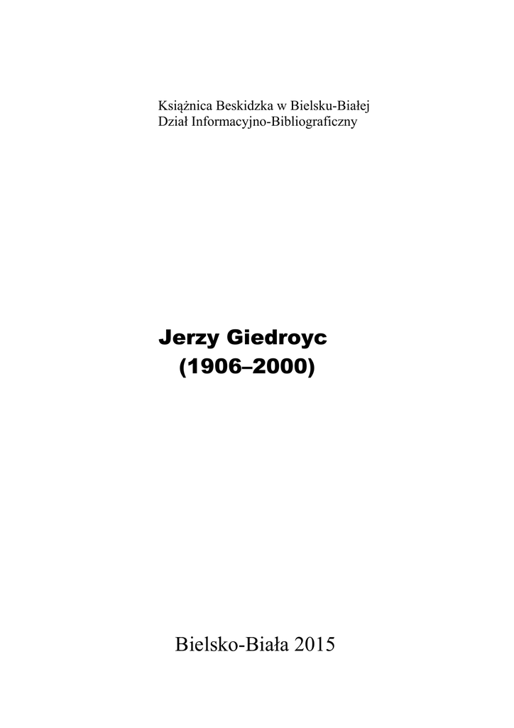 Książnica Beskidzka w Bielsku-Białej Dział Informacyjno-Bibliograficzny Jerzy Giedroyc (1906–2000) Bielsko-Biała 2015 Prezentowane zestawienie bibliograficzne Jerzy Giedroyc (1906–2000) opracowane przez Dział Informacyjno-Bibliograficzny i Zbiorów Regionalnych Książnicy Beskidzkiej w Bielsku-Białej poświęcone zostało Jerzemu Giedroyciowi z okazji przypadającej w 2016 roku 110 rocznicy urodzin publicysty, polityka, twórcy i redaktora paryskiej „Kultury”. Zestawienie bibliograficzne przygotowane zostało z myślą o bibliotekarzach, polonistach, uczniach szkół ponadgimnazjalnych, maturzystach, studentach, którzy informacje o życiu i twórczości pisarza, będą mogli wykorzystać do pogłębienia wiedzy o jego pisarstwie. Opracowanie ma formę podmiotowoprzedmiotową. Część podmiotowa zawiera pozycje z twórczości Jerzego Giedroycia, w części przedmiotowej umieszczono publikacje, artykuły odnoszące się do jego twórczości. Przy opracowaniu zestawienia korzystano ze słownika Współcześni polscy pisarze i badacze literatury, Bibliografii Zawartości Czasopism, Przewodnika Bibliograficznego. Opracowanie powstało w oparciu o zbiory własne Książnicy Beskidzkiej. Dorota Czyż Jerzy Giedroyc (1906–2000) Publicysta, polityk, twórca i redaktor paryskiej „Kultury”. Pracował jako referent prasowy i parlamentarny w Ministerstwie Rolnictwa (1929–1935), naczelnik wydziału prezydialnego w Ministerstwie Przemysłu i Handlu (1935–1939), redaktor „Dnia Akademickiego” i dwutygodnika „Bunt Młodych” przekształconego w tygodnik „Polityka”. Po wybuchu II wojny światowej przedostał się do Rumunii. Był sekretarzem ambasadora polskiego w Rumunii R. Raczyńskiego (1939–1940), kierownikiem wydziału polskiego przy poselstwie chilijskim w Bukareszcie (1940), współpracownikiem poselstwa angielskiego zajmującego się sprawami polskimi w Rumunii (1941). Jako żołnierz Samodzielnej Brygady Strzelców Karpackich uczestniczył w kampanii libijskiej i w bitwie o Tobruk. Kierował Wydziałem Czasopism i Wydawnictw Wojskowych Biura Propagandy II Korpusu Polskiego (1941–1944), następnie Departamentem Europejskim Ministerstwa Informacji Rządu RP w Londynie (1945). W 1946 założył Instytut Literacki w Rzymie. Od 1947 wydawał „Kulturę”, której był redaktorem naczelnym. W październiku 1947 przeniósł wydawnictwo do Maisons Laffitte pod Paryżem i rozwinął rozległą działalność wydawniczą, współpracując z wybitnymi polskimi publicystami i pisarzami emigracyjnymi m.in. Józefem Czapskim, Jerzym Stempowskim, Czesławem Miłoszem, Witoldem Gombrowiczem, Gustawem Herlingiem-Grudzińskim. W 1953 zainicjował wydawanie serii Biblioteki Kultury oraz „Zeszytów Historycznych”. Współredagował pismo rosyjskich dysydentów „Kontynent” oraz ukraiński kwartalnik „Widnowa”. Współtworzył w 1982 Fundusz Pomocy Niezależnej Literaturze i Nauce Polskiej. Laureat nagrody Polskiego Pen Clubu (1989), nagrody im. św. Brata Alberta (1993), nagrody Polityki (1995) oraz nagrody „Złotego Berła” Fundacji Kultury Polskiej (1999). Odznaczony został m.in. orderem Krzyżem Oficerskim Legii Honorowej (1996). Wyrażając swoje krytyczne stanowisko wobec stosunków panujących w Polsce po 1989, odmówił przyjęcia najwyższego polskiego odznaczenia Orderu Orła Białego. Zmarł we Francji. Twórczość Autobiografia na cztery ręce. Warszawa, Czytelnik 1994, 1999 Listy 1945–1963. Warszawa, Czytelnik 2000 Listy 1946–1961. Warszawa, Czytelnik 1997, 1999 Listy 1946–1969. Warszawa, Czytelnik 1998 Listy 1949–1956. Warszawa, Czytelnik 1999 Listy 1950–1969. Warszawa, Czytelnik 1993, 2006 Listy 1950–1987. Warszawa, Czytelnik 1995 Listy 1952–1998. Wrocław, Towarzystwo Przyjaciół Ossolineum 2001 Opracowania dotyczące twórczości BERBERYUSZ Ewa: Książę z Maisons-Laffitte. Warszawa, Rytm 2000 BERBERYUSZ Ewa: Książę z Maisons-Laffitte. Warszawa, Marabut 1995 GROCHOWSKA Magdalena: Jerzy Giedroyc : do Polski ze snu .Warszawa, Świat Książki 2009 Jerzy Giedroyc - redaktor, polityk, człowiek. Lublin, Wydawnictwo Uniwersytetu Marii Curie-Skłodowskiej ; [Warszawa], Towarzystwo Opieki nad Archiwum Instytutu Literackiego w Paryżu 2001 KOWALCZYK Andrzej Stanisław: Giedroyc i „Kultura”. Wrocław, Wydawnictwo Dolnośląskie 1999 W 4 oczy ze […] rozmawiają dziennikarze „Faktów”. [B.m], [B.w.] 1998 WĘGRZECKI Kazimierz: Czarne plamy historii. Londyn, Verites 1990 ŻEBROWSKI Marek: Jerzy Giedroyc : życie przed „Kulturą”. Kraków, Wydawnictwo Literackie 2012 Artykuły z czasopism AB: Kronika życia Jerzego Giedroycia. „Gazeta Wyborcza” 2000, nr 217, s. 14–15 ABE: Dziwna pomyłka Jerzego Stempowskiego. „Twórczość” 1998 nr 11, s. 134–135 ABRAMOW-NEWERLY Jarosław: Z pamiętnika stołownika. „Tygodnik Powszechny” 1996, nr 30, s. III BERBERYUSZ Ewa: Alfabet Giedroycia. „Tygodnik Powszechny” 1994, nr 46, s. 1, 5 BERBERYUSZ Ewa: Polak drugiego piętra. „Tygodnik Powszechny” 1993, nr 27, s. 1, 5–7 BERDYCHOWSKA Bogumiła: Ukraiński krąg „Kultury”. „Więź” 2004, nr 8/9, s. 104–114 BIELECKI Czesław: Jakiego Giedroycia Polacy potrzebują. „Rzeczpospolita” 2005, nr 264, s. 7 BIELECKI Czesław: Wolność i twardość. „Zeszyty Literackie” 1996, nr 4, s. 53–54 BONIECKI Adam: Ostatnie spotkanie w Maisons-Laffitte : pogrzeb Jerzego Giedroycia. „Tygodnik Powszechny” 2000, nr 40, s. 3 BONIECKI Adam: Spotkania z „Kulturą”. „Tygodnik Powszechny” 2013, nr 1, dod. „Kultura Paryska”, s. 6 BONIECKI Adam: W stulecie urodzin Jerzego Giedroycia : homilia. „Zeszyty Literackie” 2006, nr 3, s. 92–93 BURNATOWSKI Jan: Wokół Kisielewskiego: Pankowski i Giedroyc. „Twórczość” 2014, nr 9, s. 139–142 BURNETKO Krzysztof: Paryskiej „Kultury” numer pierwszy i ostatni : bez redaktora. „Tygodnik Powszechny” 2000, nr 50, s. 12 CHRUŚLIŃSKA Iza: Pierwszeństwo w