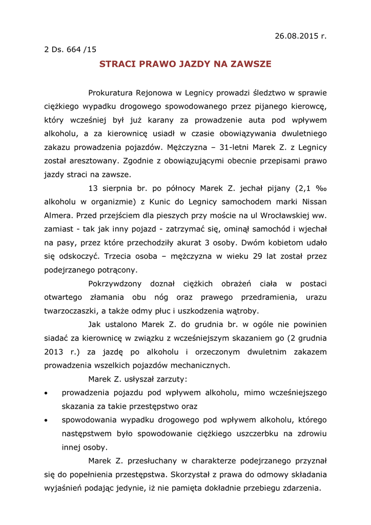 26.08.2015 r. 2 Ds. 664 /15 STRACI PRAWO JAZDY NA ZAWSZE Prokuratura Rejonowa w Legnicy prowadzi śledztwo w sprawie ciężkiego wypadku drogowego spowodowanego przez pijanego kierowcę, który wcześniej był już karany za prowadzenie auta pod wpływem alkoholu, a za kierownicę usiadł w czasie obowiązywania dwuletniego zakazu prowadzenia pojazdów. Mężczyzna – 31-letni Marek Z. z Legnicy został aresztowany. Zgodnie z obowiązującymi obecnie przepisami prawo jazdy straci na zawsze. 13 sierpnia br. po północy Marek Z. jechał pijany (2,1 ‰ alkoholu w organizmie) z Kunic do Legnicy samochodem marki Nissan Almera. Przed przejściem dla pieszych przy moście na ul Wrocławskiej ww. zamiast - tak jak inny pojazd - zatrzymać się, ominął samochód i wjechał na pasy, przez które przechodziły akurat 3 osoby. Dwóm kobietom udało się odskoczyć. Trzecia osoba – mężczyzna w wieku 29 lat został przez podejrzanego potrącony. Pokrzywdzony otwartego złamania obu doznał nóg ciężkich oraz obrażeń prawego ciała w przedramienia, postaci urazu twarzoczaszki, a także odmy płuc i uszkodzenia wątroby. Jak ustalono Marek Z. do grudnia br. w ogóle nie powinien siadać za kierownicę w związku z wcześniejszym skazaniem go (2 grudnia 2013 r.) za jazdę po alkoholu i orzeczonym dwuletnim zakazem prowadzenia wszelkich pojazdów mechanicznych. Marek Z. usłyszał zarzuty: prowadzenia pojazdu pod wpływem alkoholu, mimo wcześniejszego skazania za takie przestępstwo oraz spowodowania wypadku drogowego pod wpływem alkoholu, którego następstwem było spowodowanie ciężkiego uszczerbku na zdrowiu innej osoby. Marek Z. przesłuchany w charakterze podejrzanego przyznał się do popełnienia przestępstwa. Skorzystał z prawa do odmowy składania wyjaśnień podając jedynie, iż nie pamięta dokładnie przebiegu zdarzenia. 2 Prokurator z uwagi na surowość grożącej podejrzanemu kary i w związku z tym obawę matactwa, skierował do sądu wniosek o aresztowanie Marka Z. Sąd podzielił to stanowisko stosując ten najsurowszy środek izolacyjny. Markowi Z. za zarzucone czyny grozi kara od 9 miesięcy do 12 lat pozbawienia wolności (sprawcy trzeźwemu od 6 miesięcy do 8 lat). Po wejściu w życie z dniem 18 maja br. zmodyfikowanych przepisów m.in. kodeksu karnego mających na celu zapewnienie poprawy bezpieczeństwa w ruchu drogowym i zaostrzających odpowiedzialność nietrzeźwych sprawców przestępstw drogowych sąd - skazując Marka Z. zobligowany będzie do orzeczenia wobec niego zakazu prowadzenia wszelkich pojazdów mechanicznych dożywotnio. Nadto w sytuacji, gdy ww. był już wcześniej prawomocnie karany za jazdę po pijanemu, sąd będzie musiał orzec wobec niego świadczenie pieniężne na rzecz Funduszu Pomocy Pokrzywdzonym w wysokości co najmniej 10.000 zł. Za spowodowanie wypadku pod wpływem alkoholu z tak ciężkimi dla pokrzywdzonego skutkami, zgodnie z nowymi przepisami, sąd będzie musiał też orzec nawiązkę na rzecz ofiary również w kwocie co najmniej 10.000 zł. Postępowanie jest w toku. Informacja prawna Z dniem 18 maja 2015 r. weszły w życie zmiany w kodeksie karnym, kodeksie wykroczeń i kodeksie karnym wykonawczym mające na celu zapewnienie poprawy bezpieczeństwa w ruchu drogowym. Zmiany dotyczą zasad stosowania środka karnego w postaci zakazu prowadzenia pojazdów mechanicznych, nawiązki i świadczeń pieniężnych wobec sprawców lub przestępstwa narkotyków, prowadzenia spowodowania pojazdu pod wpływem wypadku drogowego pod jego alkoholu wpływem, pod wpływem środków odurzających lub gdy sprawca ucieknie z miejsca zdarzenia. Zakaz prowadzenia pojazdów mechanicznych (art. 42 § 2, 3 i 4 kk) Obecnie sąd musi orzec zakaz prowadzenia wszelkich pojazdów mechanicznych dożywotnio: 3 w razie ponownego prowadzenia auta po pijanemu, jeżeli kierowca był już wcześniej karany za takie przestępstwo, jeżeli kierowca spowodował katastrofę w ruchu drogowym (art. 173 kk), sprowadził bezpośrednie niebezpieczeństwo sprowadzenia takiej katastrofy (art. 174 kk), której następstwem jest śmierć innej osoby lub ciężki uszczerbek na zdrowiu, lub też wypadek drogowy ze skutkiem śmiertelnym lub powodujący ciężki uszczerbek na zdrowiu (art. 177 § 2 kk), a był wówczas w stanie nietrzeźwości lub pod wpływem środka odurzającego lub zbiegł z miejsca zdarzenia. Podniesiono też do 3 lat (poprzednio od 1 roku) dolną granicę zakazu prowadzenia wszelkich pojazdów, jeżeli sprawca w czasie popełnienia przestępstwa był w stanie nietrzeźwości, pod wpływem środka odurzającego lub zbiegł z miejsca wypadku (gdy nie było ofiar śmiertelnych lub z ciężkimi obrażeniami). Obowiązkowa nawiązka (art. 47 § 3 i 4 kk) Zmiany polegają też na wprowadzeniu obligatoryjnej nawiązki. Jeżeli sprawca popełniając przestępstwo z art. 173 kk, art. 174 kk, art. 177 kk. był w stanie nietrzeźwości lub pod wpływem środka odurzającego lub zbiegł z miejsca zdarzenia sąd musi orzec dla pokrzywdzonego nawiązkę w wysokości co najmniej 10.000 zł. W razie śmierci pokrzywdzonego nawiązkę orzeka się na rzecz osoby najbliższej, której sytuacja życiowa wskutek tego uległa znacznemu pogorszeniu, a w przypadku braku możliwości ustalenia takiej osoby na rzecz Funduszu Pomocy Pokrzywdzonym oraz Pomocy Postpenitencjarnej. Przepisu tego nie stosuje się tylko wtedy, gdy sąd orzekł obowiązek naprawienia szkody lub zadośćuczynienie za doznaną krzywdę w wysokości wyższej niż 10.000 zł. Świadczenie pieniężne (art. 49 § 2 kk) Obecnie, jeżeli kierowca prowadził pojazd pod wpływem alkoholu lub środków odurzających, sąd musi orzec (wcześniej nie musiał) świadczenie pieniężne na rzecz Funduszu Pomocy Pokrzywdzonym i Pomocy Postpenitencjarnej. Dolna granica takiego świadczenia to co najmniej 5.000 zł, a w przypadku pijanych lub odurzonych kierowców, którzy popełniają takie przestępstwo ponownie (z 