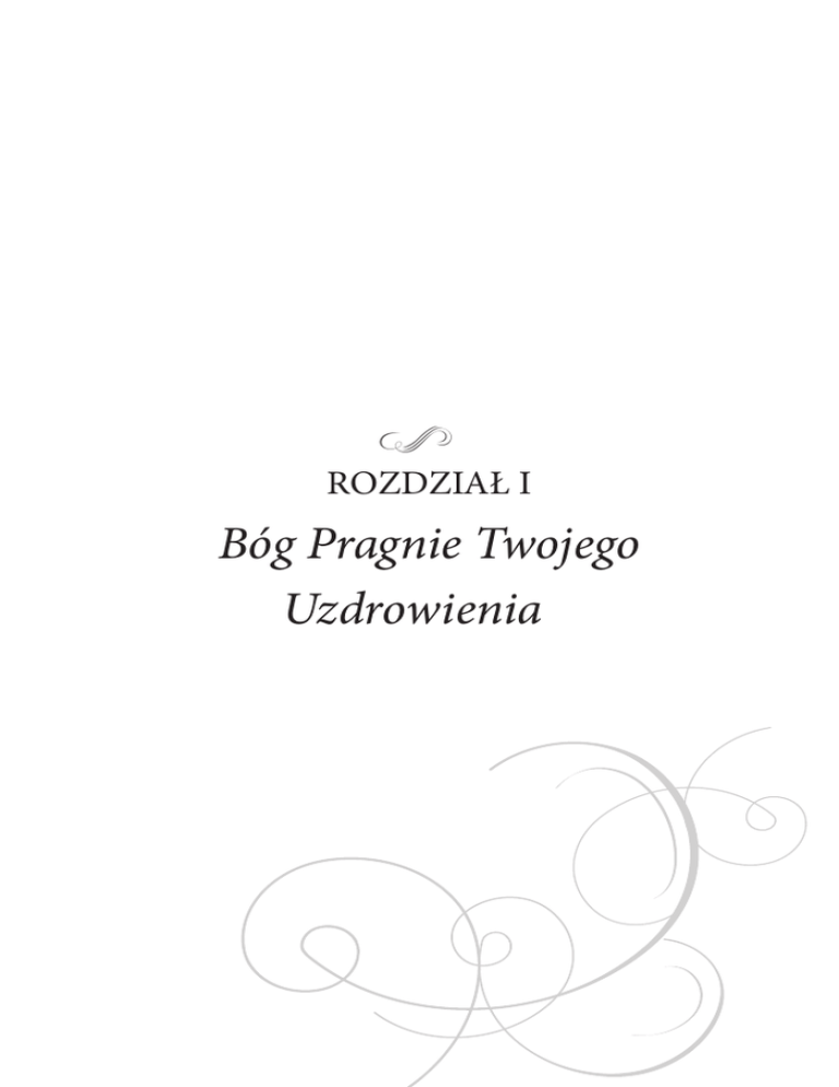 p ROZDZIAŁ I Bóg Pragnie Twojego Uzdrowienia OBIETNICE UZDROWIENIA Bowiem Bóg tak umiłował świat, że dał swego jednorodzonego Syna, aby każdy, kto w niego wierzy, nie zginął, ale miał życie wieczne. Gdyż Bóg nie posłał na świat swojego Syna, aby świat sądził, lecz aby świat mógł przez niego zostać zbawiony. J 3,16-17 (NBG) h Ale Bóg okazał swoją wielką miłość ku nam przez posłanie Chrystusa na świat, aby za nas umarł, gdy byliśmy jeszcze grzesznikami. Rz 5,8 [tłumaczenie z NLT] 14 BÓG PRAGNIE TWOJEGO UZDROWIENIA B Bóg tak bardzo cię kocha Jezus był źrenicą Bożego oka. Jezus był umiłowanym Synem Boga. Był Jego nieskończoną radością i rozkoszą. A jednak Bóg wydał Jezusa za ciebie. Oto jak bardzo Bóg cię kocha. Pomyśl tylko. Gdybyś wiedział, że możesz uratować kogoś od śmierci, poświęcając coś, co jest dla ciebie najcenniejsze, to czy posunąłbyś się aż do ofiarowania za tę osobę swojego jedynego dziecka, które tak bardzo kochasz? A jednak Bóg uczynił właśnie to, aby cię zbawić. Jego umiłowany Syn, Jezus, umarł na krzyżu, aby cię oczyścić, uzdrowić i odkupić twoją duszę i ciało! Oto jak cenny jesteś dla Boga! 15 OBIETNICE UZDROWIENIA a On, który nawet własnego Syna nie oszczędził, ale go za nas wszystkich wydał, jakżeby nie miał z nim darować nam wszystkiego? Rz 8,32 (BW) 16 BÓG PRAGNIE TWOJEGO UZDROWIENIA T Twoje uzdrowienie jest częścią odkupienia Kiedy już zdasz sobie sprawę z tego, jak bardzo Bóg kocha swojego umiłowanego Syna, zadaj sobie następujące pytanie: jeśli Bóg dobrowolnie oddał za mnie Jezusa, to czy mógłby odmówić mi uzdrowienia? Gdyby Bóg odmówił ci uzdrowienia już po tym, jak ofiarował ci Jezusa, znaczyłoby to, że twoje uzdrowienie jest cenniejsze niż Jezus. Nie, przyjacielu. Bóg ofiarował ci już to, co w niebie najkosztowniejsze. Jakże więc nie miałby dać ci za darmo wszystkiego, również uzdrowienia i pełni zdrowia, których pragniesz? 17 OBIETNICE UZDROWIENIA BÓG nie pożałował Jeśli dla ciebie tego, co najcenniejsze w niebie (JEZUSA)… 18 BÓG PRAGNIE TWOJEGO UZDROWIENIA T …to nie pożałuje dla ciebie uzdrowienia. 19 OBIETNICE UZDROWIENIA s Z pewnością On poniósł nasze nieszczęścia (choroby, słabości i rozpacze) i nosił nasze smutki i bóle [naszej kary]. Jednak my [w niewiedzy] uznaliśmy Go za dotkniętego chorobą i porażonego nieszczęściem, [niczym trądem] przez Boga. Ale On został zraniony za nasze grzechy, był zgnieciony za nasze winy i nieprawości, a chłosta [którą musiał otrzymać] dla naszego pokoju i pomyślności była na Nim. Zaś Jego sińcami [które zraniły] Go, zostaliśmy uzdrowieni i uczynieni kompletnymi. Iz 53,4-5 [tłumaczenie z AMP] 20 J BÓG PRAGNIE TWOJEGO UZDROWIENIA Jego sińce uleczyły was Rozdział 53. Księgi Izajasza stanowi odwieczny dowód Bożej miłości do ciebie oraz Jego pragnienia, abyś był uzdrowiony. Jak ważne jest dla Niego twoje uzdrowienie i zdrowie? Tak ważne, że sam Jezus zapłacił za twoje uzdrowienie najwyższą i bolesną cenę. Kiedy „Pasja” Mela Gibsona trafiła na ekrany, ludzie wyrażali swoje niezadowolenie, stwierdzając, że scena biczowania jest zbyt dosadna i drastyczna. W rzeczywistości ukazuje ona zaledwie w niewielkim stopniu to, co nasz Pan naprawdę wycierpiał w zastępstwie za nas. Chrystus był nieludzko i bestialsko biczowany przy pomocy rzymskich narzędzi tortur. Jego ciało było rozrywane na strzępy, aż w końcu pomiędzy krwią i mięśniami bielały nagie kości. Jezus poniósł sińce, abyśmy my nie musieli ich nieść. Jego ciało zostało złamane, aby nasze ciała mogły być uzdrowione. Jego sińce uleczyły nas! 21 OBIETNICE UZDROWIENIA a Tej nocy, kiedy został zdradzony, Pan Jezus wziął trochę chleba i podziękował Bogu za niego. Potem połamał go na kawałki i powiedział: „To jest moje ciało, które jest dawane za was. Róbcie to, żeby mnie pamiętać”. W ten sam sposób wziął kubek wina po kolacji, mówiąc: „Ten kubek jest nowym przymierzem pomiędzy Bogiem a Jego ludźmi – umową potwierdzoną moją krwią. Róbcie to, żeby mnie pamiętać, ile razy będziecie go pić”. 1 Kor 11,23-25 [tłumaczenie z NLT] 22 M BÓG PRAGNIE TWOJEGO UZDROWIENIA Miej udział w drodze do Bożego uzdrowienia Gdy rozpamiętujesz fakt, że Jezus dobrowolnie przyszedł na ziemię, by Cię zbawić oraz cierpiał na krzyżu dla twojego uzdrowienia, to wszelka obawa o to, że On cię nie uzdrowi, zostanie usunięta. Na tym właśnie polega udział w Wieczerzy Pańskiej. Trzymając w ręku chleb, pamiętaj po prostu o tym, że ciało Jezusa zostało złamane na krzyżu, aby twoje ciało mogło zostać uzdrowione i być w pełni zdrowe. Mów: „Panie Jezu, dziękuję Ci, że na swoim własnym ciele poniosłeś moją chorobę na krzyż. Kiedy razy bicza spadały na Twoje plecy, moja choroba została uśmiercona. Nie ma więc prawa pozostać w moim ciele”. Podobnie, mając udział w kielichu, pamiętaj, że Jezus przelał swoją krew, aby Cię zbawić. Mów: „Panie Jezu, dziękuję Ci za Twą przelaną krew, która obmyła mnie z grzechu i uczyniła mnie sprawiedliwym w Twoich oczach”. Uzdrowienie należy do mnie. Przyjmuję teraz Twoje uzdrowienie oraz Twoje zmartwychwstałe życie dla mojego ciała”. Umiłowany, pamiętaj o Panu i miej udział w drodze do Bożego uzdrowienia! 23 OBIETNICE UZDROWIENIA A oto zbliżył się trędowaty, upadł przed Nim i prosił Go: „Panie, jeśli chcesz, możesz mnie oczyścić”. Jezus wyciągnął rękę, dotknął go i rzekł: „Chcę, bądź oczyszczony!”. I natychmiast został oczyszczony z trądu. Mt 8,2-3 (BT) h „Zwrócę ci twoje zdrowie i uleczę twoje rany” – mówi Pan. Jr 30,17 [tłumaczenie z NLT] 24 B BÓG PRAGNIE TWOJEGO UZDROWIENIA Bóg może i chce cię uzdrowić Pewnego razu przyszedł do Jezusa trędowaty i powiedział: „Panie, jeśli chcesz, możes
