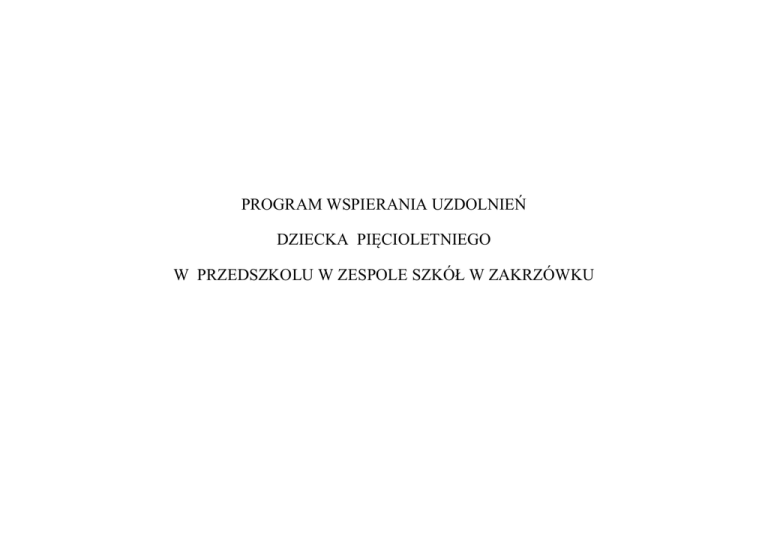PROGRAM WSPIERANIA UZDOLNIEŃ DZIECKA PIĘCIOLETNIEGO W PRZEDSZKOLU W ZESPOLE SZKÓŁ W ZAKRZÓWKU PROGRAM WSPIERANIA UZDOLNIEŃ DZIECKA ZOSTAŁ OPRACOWANY NA PODSTAWIE Przeprowadzenia wstępnej obserwacji pod kątem wyłonienia z grupy dziecka zdolnego zgodnie z przyjętymi kryteriami umiejętności, zachowania dziecka. Systematycznej obserwacji ,która pozwoliła wyłonić z grupy dziecko przejawiające różnorodne zdolności. Arkusza obserwacji cech rozwojowych dziecka. Kart pracy dziecka. Indywidualnych konsultacji z rodzicami dziecka dotyczących wstępnych spostrzeżeń, propozycji form pracy z dzieckiem uwzględniających jego predyspozycje i zdolności. Kryteria umiejętności, zachowania dziecka zdolnego: szybko zapamiętuje, prawidłowo kojarzy i rozumuje; rozumie polecenia i zadania; posiada dar bystrej obserwacji otoczenia; jest dociekliwe, zadaje dużo pytań; ma różnorodne zainteresowania, bogatą wiedzę, pasje, uzdolnienia; uczy się z przyjemnością i wyraźnym zainteresowaniem; umie skupić uwagę przez dłuższy czas na wybranym obiekcie zainteresowania; jest bardzo spostrzegawcze; posiada bogatą wyobraźnię oraz ciekawe i oryginalne pomysły; wymyśla nowe zabawy, opowiadania, sytuacje realne i abstrakcyjne; wyraża swoje myśli i emocje w różnej formie np. werbalnej, plastycznej, muzycznej; broni swoich racji i poglądów, jest niezależne; wiadomości samo podaje pomysły nowych zadań, nie polega na innych przez cały czas; woli samo rozwiązywać problemy; najczęściej posiada poczucie humoru; a jednocześnie często dziecko zdolne: ma trudności w przystosowaniu się do grupy (potrzeba rywalizacji, imponowania, dominacji); jest często uznawane za zarozumiałe; bywa, że lekceważy rówieśników, nauczyciela lub jego zdanie; prezentuje egocentryzm, koncentrację na sobie; miewa trudności z przechodzeniem do umiejętności, niekiedy charakteryzuje się lękliwością lub nadpobudliwością. Posiadanie przynajmniej kilku spośród wymienionych cech pozytywnych oznacza, że dziecko jest jednostką wybitną. „ Dokonać z łatwością czegoś, co jest trudne dla innych to talent, móc uczynić coś, co dla talentu jest niemożliwe to geniusz” Amel Henri Frederi CELE OGÓLNE: Praca z dzieckiem zdolnym ukierunkowana jest na rozwijanie jego zdolności indywidualnych oraz zainteresowań. Stwarzanie warunków do odkrywania, eksperymentowania, poznawania, działania, przeżywania w różnych formach. Kształtowanie u dzieci wiary we własne możliwości. Rozwijanie u dziecka możliwości umysłowych oraz szczególnych uzdolnień do uczenia się matematyki. Stwarzanie sytuacji doskonalących pamięć, umiejętność skupienia uwagi, zdolność kojarzenia, logicznego, twórczego i oryginalnego myślenia a także działania. Rozbudzanie ciekawości poznawczej, twórczego działania oraz samodzielności. Tworzenie warunków, w których dziecko rozwija nabyte doświadczenia językowe, ze szczególnym uwzględnieniem umiejętności czytania i pisania. Kształtowanie i rozwijanie ekspresji, twórczej postawy, wrażliwości na piękno, wrażliwości estetycznej, pomysłowość, wyobraźni i muzykalności. Ewaluacja w oparciu o: Arkusz obserwacyjny cech rozwojowych dziecka pięcioletniego, Arkusz diagnozy dojrzałości szkolnej dziecka pięcioletniego, Obserwację całościową. PRACA Z DZIECKIEM W ZAKRESIE: I. II. MOWA I MYŚLENIE CZYTANIE III. PISANIE IV. KSIĄŻKA V. VI. VII. VIII. IX. MATEMATYKA PRZYRODA MUZYKA – RUCH PLASTYKA I KONSTRUOWANIE TEATR MOWA I MYŚLENIE, I. PRZYKŁADY DZIAŁAŃ PRAKTYCZNYCH: Archiwum – wymienianie słów spełniających określone wymogi treściowe, np. obiekty białe, Podobieństwa – losujemy 2 obrazki i pytamy o ich cechy wspólne (potem 3obrazki itd..), Pomyśl o rzeczy w tej sali – zgadujemy zadając pytania, czyli poprzez wykluczenie, eliminację, 1000 definicji – jak nazwać inaczej np. krzesło, lub co to jest krzesło? Zagadki - np. "ma dziób, choć nie jest ptakiem", "co wpada przez okno i nie tłucze szyby, itd. Inne wyrazy z liter SMOK: sok, oko, kok, koks, Część ciała na 5 liter, Skojarzenia – pokazujemy obrazek i pytamy o wolne skojarzenia z nim związane, Łańcuszek skojarzeń: podajemy wyraz, a dziecko kolejny, drugie następny, Wyliczanki: np. "człowiek może mieszkać w ..." , Określenia – wymienianie określeń, jaki może być: dom, las itp. Praca z: …………………………………………………………………………………………………………………………………… II. CZYTANIE PRZYKŁADY DZIAŁAŃ PRAKTYCZNYCH: Układanie wyrazów z sylab, Czytanie zdań, opowiadań, Czytanie tekstu z podziałem na role, Układanie zdań z rozsypanki wyrazowej, Dobieranie podpisów do obrazków, Korzystanie z encyklopedii. Praca z: …………………………………………………………………………………………………………………………………… III. PISANIE PRZYKŁADY DZIAŁAŃ PRAKTYCZNYCH: Rozwiązywanie krzyżówek literowo obrazkowych z hasłem, rebusów, łamigłówek. Pisanie wyrazów, prostych zdań w liniaturze. Kreślenie znaków literopodobnych w sposób płynny i ciągły. Poznawanie zasad ortograficznych w pisowni wyrazów z «ó», «rz», «ż», Wdrażanie zasad interpunkcyjnych (rola ,.?!). Zwrócenie uwagi za zdania orzekające, pytające i rozkazujące . Praktyczne zastosowanie materiału dydaktycznego w w/w formie. Praca z: …………………………………………………………………………………………………………………………………… IV. KSIĄŻKA PRZYKŁADY DZIAŁAŃ PRAKTYCZNYCH: Tworzenie książek na dowolny temat, Układanie podpisów do obrazków, Korzystanie z literatury dziecięcej, dostępnej w biblioteczce przedszkolnej, szkolnej, Próby samodzielnego czytania, Układanie wierszy, opowiadań i zagadek, Układanie zakończeń wierszy, opowiadań, Nadawanie tytułów usłyszany