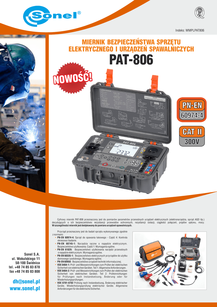 Indeks: WMPLPAT806 MIERNIK BEZPIECZEŃSTWA SPRZĘTU ELEKTRYCZNEGO I URZĄDZEŃ SPAWALNICZYCH PAT-806 NOWOŚĆ! 300V Cyfrowy miernik PAT-806 przeznaczony jest do pomiarów parametrów przenośnych urządzeń elektrycznych (elektronarzędzia, sprzęt AGD itp.) decydujących o ich bezpieczeństwie: rezystancji przewodów ochronnych, rezystancji izolacji, ciągłości połączeń, prądów upływu, mocy. W szczególności miernik jest dedykowany do pomiaru urządzeń spawalniczych. Sonel S.A. ul. Wokulskiego 11 58-100 Świdnica tel. +48 74 85 83 878 fax +48 74 85 83 808 [email protected] www.sonel.pl Przyrząd przeznaczony jest do badań sprzętu wykonywanego zgodnie z normami: · PN-EN 60974-4: Sprzęt do spawania łukowego - Część 4: Kontrola okresowa i badanie. · PN-EN 60745-1: Narzędzia ręczne o napędzie elektrycznym. Bezpieczeństwo użytkowania. Część 1: Wymagania ogólne. · PN-EN 61029: Bezpieczeństwo użytkowania narzędzi przenośnych o napędzie elektrycznym. Wymagania ogólne. · PN-EN 60335-1: Bezpieczeństwo elektrycznych przyrządów do użytku domowego i podobnego. Wymagania ogólne. · PN-EN 60950: Bezpieczeństwo urządzeń techniki informatycznej. · VDE 0404-1: Prüf- und Messeinrichtungen zum Prüfen der elektrischen Sicherheit von elektrischen Geräten. Teil 1: Allgemeine Anforderungen. · VDE 0404-2: Prüf- und Messeinrichtungen zum Prüfen der elektrischen Sicherheit von elektrischen Geräten. Teil 2: Prüfeinrichtungen für Prüfungen nach Instandsetzung, Änderung oder für Wiederholungsprüfungen. · VDE 0701-0702 Prüfung nach Instandsetzung, Änderung elektrischer Geräte. Wiederholungsprüfung elektrischer Geräte. Allgemeine Anforderungen für die elektrische Sicherhei. PAT-806 Podstawowe funkcje przyrządu: · pomiar parametrów urządzeń do spawania łukowego wg PN-EN 60974-4: - pomiar znamionowego napięcia urządzeń spawalniczych w stanie bez obciążenia, - pomiar prądu upływu obwodu spawania IL - pomiar pierwotnego prądu upływu. · pomiar rezystancji przewodu ochronnego prądem: 200 mA, 10 A, 25 A (I klasa ochronności), automatyczny trzypunktowy pomiar rezystancji izolacji - trzy napięcia pomiarowe: 100 V, 250 V i 500 V, pomiar zastępczego prądu upływu, pomiar prądu upływu PE, pomiar różnicowego prądu upływu, pomiar dotykowego prądu upływu, pomiar mocy, pomiar poboru prądu, test przewodu IEC, sprawdzenie bezpiecznika, sprawdzenie rezystancji obwodu L-N, pomiar napięcia i częstotliwości sieci. · · · · · · · · · · · Dodatkowo: · · · · · · · automatyczny wybór zakresu pomiarowego, 990 komórek pamięci wyników pomiaru z możliwością ich przesłania do komputera PC, przez łącze USB lub wydrukowania, profesjonalne oprogramowanie do obróbki danych i tworzenia raportów, współpraca z czytnikiem kodu kreskowego i drukarką, współpraca z pamięcią przenośną pendrive, duży, czytelny wyświetlacz z możliwością podświetlenia, ergonomiczna obsługa. Wyposażenie standardowe: - przewód zasilający - przewód pomiarowy banan/banan, czarny 1,2 m, 2,5 mm2 ,2 szt. - przewód 1,2m dwużyłowy (10/25 A) U2/I2 - krokodyl czarny 1 kV 2 szt. - krokodyl Kelvina - sonda 1 kV czarna - sonda silnoprądowa 1 kV - przewód USB - bezpiecznik 0314 015.VXP 15A 250VAC 6.3x32mm Littlefuse 2 szt - futerał – L5 - instrukcja obsługi WAPRZZAS1 WAPRZ1X2BLBB2X5 WAPRZ1X2DZBB2 WAKROBL30K03 WAKROKELK06 WASONBLOGB3 WASONSPGB1 WAPRZUSB WAPOZB15PAT WAFUTL5 Wyposażenie dodatkowe: - przewód 1,2m dwużyłowy (10/25 A) U1/I1 - krokodyl czarny 1 kV - sonda czarna 1 kV - przewód pomiarowy banan/banan 1,2 m, czarny - przewód - adapter shuko/IEC (do testowania przedłużaczy) - adapter gniazd trójfazowych 16A - adapter gniazd trójfazowych 16A przełączany - adapter gniazd trójfazowych 32A - adapter gniazd trójfazowych 32A przełączany - adapter gniazd przemysłowych 16A - adapter gniazd przemysłowych 32A - przejściówka IEC do testowania przew. IEC zakończonych „koniczynką” - czytnik kodów kreskowych USB - drukarka raportów/kodów USB, przenośna - naklejki na badane urządzenia: SPRAWNE (rolka – 50szt. naklejek) - naklejki na badane urządzenia: NIESPRAWNE (rolka – 50szt. naklejek) - naklejki z kodami kreskowymi (rolka – 100 szt. naklejek) - program Sonel PAT WAPRZ1X2DZBB1 WAKROBL20K01 WASONBLOGB3 WAPRZ1X2BLBB WAADAPATIEC2 WAADAPAT16P WAADAPAT16PR WAADAPAT32P WAADAPAT32PR WAADAPAT16F1 WAADAPAT32F1 WAADAPATIEC1 WAADACK1 WAADAD1 WANAKSPR WANAKNSPR WANAKKODPAS WAPROSONPAT1 Wyrób spełnia wymagania EMC wg norm PN-EN 61326-1:2009 i PN-EN 61326-2-2:2006 Bezpieczeństwo elektryczne: - rodzaj izolacji zgodnie z PN-EN 61010-1 i IEC 61557 - kategoria pomiarowa II 300 V wg PN-EN 61010-1 - stopień ochrony obudowy wg PN-EN 60529 IP40 Pozostałe dane techniczne: - zasilanie miernika 187...265 V, 50 Hz - prąd obciążenia max. 16 A (230 V) - pamięć wyników pomiarów 990 komórek - transmisja danych do komputera PC łącze USB - wymiary 330 x 235 x 120 mm - masa miernika ok. 4,75 kg - temperatura pracy 0...+40°C - temperatura przechowywania -20...+70°C - wilgotność 20...80% PAT-806 Pomiar rezystancji przewodu uziemienia I=200mA (tylko I klasa ochronności) Zakres wyświetlania Rozdzielczość 0,00...0,99 Ω 0,01 Ω 1,00...19,99 Ω Błąd podstawowy Zakres wyświetlania Rozdzielczość ±(4% w.m. + 2 cyfry) 0,00...3,99 mA 0,01 mA ±(4% w.m. + 3 cyfry) 4,0...19,9 mA 0,1 mA · napięcie na nieobciążonym wyjsciu 4...12 V AC, · prąd pomiarowy: ł200 mA dla R= 0,2...1,99 Ω · ustawialny limit górny w zakresie: 10 mΩ …1,99 Ω z rozdzielczością 0,01 Ω · regulowany czas pomiaru 1...60 s z rozdzielczością 1 s i pozycją CONT (pomiar ciągły) Pomiar rezystancji przewodu uziemienia I=10 A (tylko I klasa ochronności) Zakres wyświetlania Rozdzielczość Błąd podstawowy 0...999 mΩ 1 mΩ 1,00...1,99 Ω 0,01 Ω ±(3% w.m. + 4 cyfry) ±(3% w.m. + 40 cyfr)* * dla pomiaru dwuprzewodowego · napięcie na nieobci