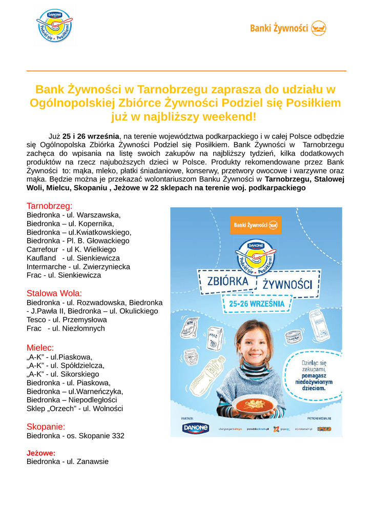 Bank Żywności w Tarnobrzegu zaprasza do udziału w Ogólnopolskiej Zbiórce Żywności Podziel się Posiłkiem już w najbliższy weekend! Już 25 i 26 września, na terenie województwa podkarpackiego i w całej Polsce odbędzie się Ogólnopolska Zbiórka Żywności Podziel się Posiłkiem. Bank Żywności w Tarnobrzegu zachęca do wpisania na listę swoich zakupów na najbliższy tydzień, kilka dodatkowych produktów na rzecz najuboższych dzieci w Polsce. Produkty rekomendowane przez Bank Żywności to: mąka, mleko, płatki śniadaniowe, konserwy, przetwory owocowe i warzywne oraz mąka. Będzie można je przekazać wolontariuszom Banku Żywności w Tarnobrzegu, Stalowej Woli, Mielcu, Skopaniu , Jeżowe w 22 sklepach na terenie woj. podkarpackiego Tarnobrzeg: Biedronka - ul. Warszawska, Biedronka – ul. Kopernika, Biedronka – ul.Kwiatkowskiego, Biedronka - Pl. B. Głowackiego Carrefour - ul K. Wielkiego Kaufland - ul. Sienkiewicza Intermarche - ul. Zwierzyniecka Frac - ul. Sienkiewicza Stalowa Wola: Biedronka - ul. Rozwadowska, Biedronka - J.Pawła II, Biedronka – ul. Okulickiego Tesco - ul. Przemysłowa Frac - ul. Niezłomnych Mielec: „A-K” - ul.Piaskowa, „A-K” - ul. Spółdzielcza, „A-K” - ul. Sikorskiego Biedronka - ul. Piaskowa, Biedronka – ul.Warneńczyka, Biedronka – Niepodległości Sklep „Orzech” - ul. Wolności Skopanie: Biedronka - os. Skopanie 332 Jeżowe: Biedronka - ul. Zanawsie Produkty przekazane podczas zbiórki żywności Podziel się Posiłkiem trafią do magazynu Banku Żywności. Tam zostaną posortowane, zważone i policzone. Następnie produkty będą przekazane podopiecznym organizacji charytatywnych, które systematycznie wspierają dzieci z najuboższych rodzin. - Dokładnie podczas zbiorki ” Podziel się Posiłkiem” w 2014 roku na terenie Tarnobrzega, Mielca, Stalowej Woli, Niska, Skopania, Jeżowe, Rudnika n/Sanem łącznie zebrano 6079,72 kg produktów spożywczych .Dzięki temu udało się dotrzeć z pomocą do niemal do 1500 najuboższych dzieci. Zbiórka Żywności Podziel się Posiłkiem już po raz 12 odbędzie się na terenie całej Polski. 45 000 wolontariuszy Banków Żywności, w niemal w 540 miejscowościach będzie zachęcać klientów sklepów spożywczych do dzielenia się zakupami. W naszym województwie zaangażowało się aż 750 wolontariuszy. Podziel się Posiłkiem na charytatywni.allegro.pl Od dziś do końca października na portalu charytatywni.allegro.pl/podzielsieposilkiem możemy kupować paczki z żywnością za 5, 10, 15 i 50 zł. Każda paczka to odpowiednio 3, 6, 7 lub 15 posiłków dla dzieci. Bankom Żywności udało się wynegocjować specjalną cenę na produkty spożywcze. Dzięki uprzejmości Auchan Direct, każda paczka zawiera od kilku do kilkunastu produktów spożywczych. Milion dzieci w Polsce żyje w skrajnym ubóstwie! - W 2014 r. 7,4 % Polaków żyło poniżej granicy skrajnego ubóstwa w Polsce. 1 To tak, jakby całą Warszawę zamieszkiwały wyłącznie osoby żyjące za kwotę poniżej 551 zł miesięcznie. Problem ten dotyczy także polskich dzieci. W skrajnym ubóstwie żyje 10% dzieci i młodzieży do 18 roku życia, to jest prawie milion. Dlatego bardzo zachęcam do wzięcia udziału w zbiórce i dzielenia się zakupami. – podkreśla skalę ubóstwa w Polsce Marek Borowski – Prezes Zarządu Federacji Polskich Banków Żywności. O programie Podziel się Posiłkiem Od 2003 roku program Podziel się Posiłkiem realizuje misję zmniejszenia poziomu niedożywienia wśród dzieci. Dzięki takim działaniom jak Zbiórka Żywności Podziel się Posiłkiem czy Program Grantowy, do tej pory udało się przekazać ponad 15 000 000 posiłków najmłodszym Polakom. W tym roku akcję można wesprzeć również on-line poprzez serwis charytatywni.allegro.pl. Inicjatorem programu jest firma Danone, Partnerem Strategicznym i Organizatorem Zbiórek Żywności są Banki Żywności. Więcej informacji o Programie Podziel się Posiłkiem znajdziesz na stronie internetowej www.podzielsieposilkiem.pl. *Źródło danych: platforma badawcza Brand Fibres, sierpień 2015 rok **Badanie Millward Brown przeprowadzone w 2013 roku na zlecenie Danone i Banków Żywności, na reprezentacyjnej próbie wychowawców klas I-VI. ----------------------------------------------------------------------------------------------------------------O Danone Firma Danone Sp. z o.o. jest obecna w Polsce 20 lat. Jest liderem w branży świeżych produktów mlecznych. Misją firmy Danone jest, by poprzez żywność niesiemy zdrowie tak wielu ludziom, jak to możliwe.Firma od lat walczy z niedożywieniem dzieci w Polsce poprzez program Podziel się Posiłkiem i Partnerstwo dla Zdrowia (produkty Mleczny Start). Więcej www.danone.pl O Bankach Żywności Federacja Polskich Banków Żywności jest organizacją pożytku publicznego (KRS 0000063599), której misją jest przeciwdziałanie marnowaniu żywności i niedożywieniu w Polsce. Federacja Polskich Banków Żywności zrzesza 32 Banki Żywności działające na terenie całego kraju. Banki Żywności udzielają codziennej, bezpłatnej pomocy żywnościowej blisko 3 800 organizacjom i instytucjom społecznym, za pośrednictwem których trafia ona do 1 300 000 osób najbardziej potrzebujących. www.bankizywnosci.pl O charytatywni.allegro.pl Serwis charytatywni.allegro.pl to miejsce, które łączy zakupy online z dobroczynnością. Ta strona ułatwia internautom pomaganie, a organizacjom pozarządowym zbieranie środków na cele statutowe. Przedmioty wystawione za pośrednictwem serwisu charytatywni.allegro.pl pojawiają się na stronach allegro.pl. To największa platforma handlowa w polskim internecie, którą każdego miesiąca odwiedza średnio 12 mln użytkowników wybierających spośród 32,5 mln wystawionych ofert. Przy okazji zakupów online mogą też wesprzeć szczytny cel. 1 GUS 2015