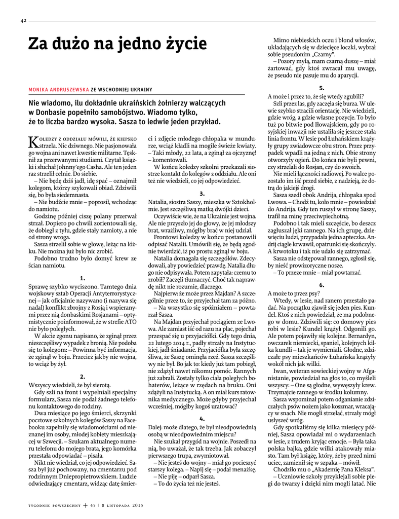 42 Za dużo na jedno życie MONIKA ANDRUSZEWSKA ZE WSCHODNIEJ UKRAINY Nie wiadomo, ilu dokładnie ukraińskich żołnierzy walczących w Donbasie popełniło samobójstwo. Wiadomo tylko, że to liczba bardzo wysoka. Sasza to ledwie jeden przykład. K oledzy z oddziału mówili, że kiepsko strzela. Nic dziwnego. Nie pasjonowała go wojna ani nawet kwestie militarne. Tęsknił za przerwanymi studiami. Czytał książki i słuchał Johnny’ego Casha. Ale ten jeden raz strzelił celnie. Do siebie. – Nie będę dziś jadł, idę spać – oznajmił kolegom, którzy szykowali obiad. Zdziwili się, bo była siedemnasta. – Nie budźcie mnie – poprosił, wchodząc do namiotu. Godzinę później ciszę polany przerwał strzał. Dopiero po chwili zorientowali się, że dobiegł z tyłu, gdzie stały namioty, a nie od strony wroga. Sasza strzelił sobie w głowę, leżąc na łóżku. Nie można już było nic zrobić. Podobno trudno było domyć krew ze ścian namiotu. 1. Sprawę szybko wyciszono. Tamtego dnia wojskowy sztab Operacji Antyterrorystycznej – jak oficjalnie nazywano (i nazywa się nadal) konflikt zbrojny z Rosją i wspieranymi przez nią donbaskimi Rosjanami – optymistycznie poinformował, że w strefie ATO nie było poległych. W akcie zgonu napisano, że zginął przez nieszczęśliwy wypadek z bronią. Nie podoba się to kolegom: – Powinna być informacja, że zginął w boju. Przecież jakby nie wojna, to wciąż by żył. 2. Wszyscy wiedzieli, że był sierotą. Gdy szli na front i wypełniali specjalny formularz, Sasza nie podał żadnego telefonu kontaktowego do rodziny. Dwa miesiące po jego śmierci, skrzynki pocztowe szkolnych kolegów Saszy na Facebooku zapełniły się wiadomościami od nieznanej im osoby, młodej kobiety mieszkającej w Szwecji. – Szukam aktualnego numeru telefonu do mojego brata, jego komórka przestała odpowiadać – pisała. Nikt nie wiedział, co jej odpowiedzieć. Sasza był już pochowany, na cmentarzu pod rodzinnym Dniepropietrowskiem. Ludzie odwiedzający cmentarz, widząc datę śmiertygodnik powszechny 45 | 8 listopada 2015 ci i zdjęcie młodego chłopaka w mundurze, wciąż kładli na mogile świeże kwiaty. – Taki młody, 22 lata, a zginął za ojczyznę! – komentowali. W końcu koledzy szkolni przekazali siostrze kontakt do kolegów z oddziału. Ale oni też nie wiedzieli, co jej odpowiedzieć. 3. Natalia, siostra Saszy, mieszka w Sztokholmie. Jest szczęśliwą matką dwójki dzieci. Oczywiście wie, że na Ukrainie jest wojna. Ale nie przyszło jej do głowy, że jej młodszy brat, wrażliwy, mógłby brać w niej udział. Frontowi koledzy w końcu postanowili odpisać Natalii. Umówili się, że będą zgodnie twierdzić, iż po prostu zginął w boju. Natalia domagała się szczegółów. Zdecydowali, aby powiedzieć prawdę. Natalia długo nie odpisywała. Potem zapytała: czemu to zrobił? Zaczęli tłumaczyć. Choć tak naprawdę nikt nie rozumie, dlaczego. Najpierw: że może przez Majdan? A szczególnie przez to, że przyjechał tam za późno. – Na wszystko się spóźniałem – powtarzał Sasza. Na Majdan przyjechał pociągiem ze Lwowa. Ale zamiast iść od razu na plac, pojechał przespać się u przyjaciółki. Gdy tego dnia, 22 lutego 2014 r., padły strzały na Instytuckiej, jadł śniadanie. Przyjaciółka była szczęśliwa, że Saszę ominęła rzeź. Sasza szczęśliwy nie był. Bo jak to: kiedy już tam pobiegł, nie zdążył nawet nikomu pomóc. Rannych już zabrali. Zostały tylko ciała poległych bohaterów, leżące w rzędach na bruku. Oni zdążyli na Instytucką. A on miał kurs ratownika medycznego. Może gdyby przyjechał wcześniej, mógłby kogoś uratować? 4. Dalej: może dlatego, że był nieodpowiednią osobą w nieodpowiednim miejscu? Nie szukał przygód na wojnie. Poszedł na nią, bo uważał, że tak trzeba. Jak zobaczył pierwszego trupa, zwymiotował. – Nie jesteś do wojny – miał go pocieszyć starszy kolega. – Napij się – podał menażkę. – Nie piję – odparł Sasza. – To do życia też nie jesteś. Mimo niebieskich oczu i blond włosów, układających się w dziecięce loczki, wybrał sobie pseudonim „Czarny”. – Pozory mylą, mam czarną duszę – miał żartować, gdy ktoś zwracał mu uwagę, że pseudo nie pasuje mu do aparycji. 5. A może i przez to, że się wtedy zgubili? Szli przez las, gdy zaczęła się burza. W ulewie szybko stracili orientację. Nie wiedzieli, gdzie wróg, a gdzie własne pozycje. To było tuż po bitwie pod Iłowajskiem, gdy po rosyjskiej inwazji nie ustaliła się jeszcze stała linia frontu. W lesie pod Łuhańskiem krążyły grupy zwiadowcze obu stron. Przez przypadek wpadli na jedną z nich. Obie strony otworzyły ogień. Do końca nie byli pewni, czy strzelali do Rosjan, czy do swoich. Nie mieli łączności radiowej. Po walce pozostało im iść przed siebie, z nadzieją, że dotrą do jakiejś drogi. Sasza szedł obok Andrija, chłopaka spod Lwowa. – Chodź tu, koło mnie – powiedział do Andrija. Gdy ten ruszył w stronę Saszy, trafił na minę przeciwpiechotną. Podobno i tak mieli szczęście, bo deszcz zagłuszał jęki rannego. Na ich grupę, dziewięciu ludzi, przypadała jedna apteczka. Andrij ciągle krwawił, opatrunki się skończyły. A krwotoku i tak nie udało się zatrzymać. Sasza nie odstępował rannego, zgłosił się, by nieść prowizoryczne nosze. – To przeze mnie – miał powtarzać. 6. A może to przez psy? Wtedy, w lesie, nad ranem przestało padać. Na początku zjawił się jeden pies. Kundel. Ktoś z nich powiedział, że ma podobnego w domu. Zdziwili się: co domowy pies robi w lesie? Kundel krążył. Odgonili go. Ale potem pojawiły się kolejne. Bernardyn, owczarek niemiecki, spaniel, kolejnych kilka kundli – tak je wymieniali. Głodne, zdziczałe psy mieszkańców Łuhańska krążyły wokół nich jak wilki. Iwan, weteran sowieckiej wojny w Afganistanie, powiedział n