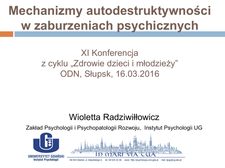 Mechanizmy autodestruktywności w zaburzeniach psychicznych XI Konferencja z cyklu „Zdrowie dzieci i młodzieży” ODN, Słupsk, 16.03.2016 Wioletta Radziwiłłowicz Zakład Psychologii i Psychopatologii Rozwoju, Instytut Psychologii UG Autodestruktywność bezpośrednia i pośrednia A. bezpośrednia - akty samobójcze oraz samouszkodzenia A. pośrednia - uzależnienia, zaburzenia odżywiania się; zaniedbania, również zdrowotne Tzw. impulsywny podtyp bulimii (u ponad 70% badanych) zawiera uzależnienia, depresję, tendencje samobójcze, lęk, zachowania impulsywne i osobowość antyspołeczną, drugi zaś tylko zaburzenia depresyjne (Duncan i in., 2005) Uszkodzenie ciała, będące intencjonalnym atakiem na własne życie, zdrowie lub ciało, w którym występuje mały dystans między działaniem i skutkiem; działanie nieakceptowane społecznie i Biologia uzależnienia Związek pomiędzy: ryzykiem rozwoju zaburzeń związanych z używaniem substancji (np. alkoholu, kanabinoli, psychostymulantów, dopalaczy, leków dostępnych bez recepty) i zachowaniami problemowymi (np. wycofanie, lęk, depresja, impulsywność, agresywność) a czynnikami społecznymi (np. formy aktywności pozaszkolnej) i cechami temperamentu (poziom poszukiwania nowości, unikania przykrości, uzależnienia od nagrody, wytrwałości) (psychobiologiczna koncepcja osobowości R. Cloningera) oraz markerami biologicznymi (polimorfizmy genów układu dopaminergicznego DRD2, DRD4, receptorów transportera serotoniny 5-HTT oraz genach mózgowego geny ryzyko uzależnienia aktywność pozaszkolna temperament problemowe zachowania Czynniki genetyczne Czynniki genetyczne stanowią istotny predyktor uzależnień (Jabłoński in., 2013; Samochowiec i in., 2014) Zróżnicowany poziom podatności na uzależnienie wynika z odmienności w aktywności neurotransmisji dopaminowej (Nacak i in., 2012; Ziauddeen i in., 2012) U osób uzależnionych zachodzi mniejsza ekspresja receptorów dopaminowych, co wiąże się z wyższą wrażliwością na nagradzające działanie substancji Istnieje silna korelacja między długością fragmentów genów kodujących receptory serotoninowe (5-HTTLPR), a poziomem unikania szkody (Becker i in., 2007), związanym z różnymi zaburzeniami psychicznymi (Serretti i in., 2011) Temperament Temperament można traktować jako endofenotyp, czyli konstrukt służący wyjaśnianiu wpływu czynników genetycznych na powstawanie zaburzenia, nawet gdy udział genów jest słaby lub trudny do zaobserwowania (Oniszczenko, 2002) Zatem można intepretować go jako czynnik pośredniczący między genami a zaburzeniem lub też jego ryzykiem (Bearden i in., 2006) Osoby uzależnione przejawiają wyższy poziom poszukiwania nowości, a także unikania szkody (Le Bon i in., 2004) Uzależnienie od nagrody łączy się z używaniem substancji i uzależnieniem od narkotyków (Evren i in., 2007) Istnieje związek między wysokim poziomem poszukiwania nowości a zachowaniami eksternalizacyjnymi (Kuo i in., 2004), problemami antysocjalnymi oraz zaburzeniami zachowania (Rettew i in., 2004) Budowanie własnej tożsamości Czucie się jako podmiot, jako „ja” 1. Stawanie się właścicielem swojego ciała Posiadanie dojrzałego seksualnego ciała męskiego lub kobiecego i porzucenie iluzji o możliwości posiadania ciała ani k. ani m. lub zarówno k. i m. 2. Stawanie się właścicielem własnych myśli Przejście od uczucia, że rodzice wiedzą, co myślę do uczucia, że jestem jedynym właścicielem aparatu swego myślenia 3. Stawanie się właścicielem własnych popędów Poczucie, że moje uczucia seksualne są moje i moja agresywność jest moja i ja mogę z nich zrobić użytek w zgodzie z moim superego Konstrukcja dorosłej tożsamości zakłada proces różnicowania między: Self i obiektem Mężczyzną a kobietą Życiem a śmiercią (u osób po p.s. – lepsza część przeżyje) Pokoleniami (że są starsze pokolenia, że nie są omnipotentne, że czegoś nie umieją) To uznanie, że każdy system rodzinny jest silny mimo jego różnorodnych słabości Seksualne ciało / dorosłość Przeżywanie ciała – nienawiść, która jest związana z identyfikacją ze znienawidzonym rodzicem Własne ciało jest obiektem, na który jest projektowana wrogość do opiekunów Przerażenie, że dotychczasowa fantazja może być zrealizowana wskutek rozwoju fizycznego Adolescent powinien / musi odłączyć się od rodziców „nie zabijając ich” (utrzymując z nimi dobrą więź) P.s. i inne objawy są próbą odseparowania się od opiekuna, z którym dorastający pozostawał w Atak na ciało Specyficzny / właściwy / w okresie dorastania PS, substancje psychoaktywne, anoreksja, bulimia, kompulsywne objadanie się Nastolatki próbują w ten sposób udawać, że ich ciała nie są dla nich groźne lub nie istnieją W historii osób gwałtownie i chronicznie autodestruktywnych występuje doświadczenie zagrożenia i odrzucenia, brak poczucia sensu życia i poczucia własnej wartości Odmawiają życia Czy da się ich ratować wbrew nim? Separacja - indywiduacja przywiązanie Znaczenie zrozumienia separacji indywiduacji w kontekście (a nie poza nim) przywiązania rodzic - dorastające dziecko Bezpieczne i efektywne wejście do świata dorosłych opiera się na przemianach (nie odrzuceniu) tego przywiązania Wzajemne dostrojenie emocjonalne, odzwierciedlenie i mentalizacja, osłabienie dziecięcych więzi zależności i autokreacja są kluczowe w pomyślnym przebiegu Separacja - indywiduacja przywiązanie Proces separacji - indywiduacji może być jednak zablokowany lub przyśpieszony głównie poprzez działanie międzypokoleniowego przekazu traumy, związanej z opuszczeniem, odrzuceniem i niedostępnością emocjonalną lub - bądź jednocześnie - wiązaniem i symbiozą W konsekwencji dochodzi do parentyfikacji, czyli odwrócenia relacji Parentyfikacja Zachodzi ona w rodzinach charakteryzujących się brakiem zaangażo