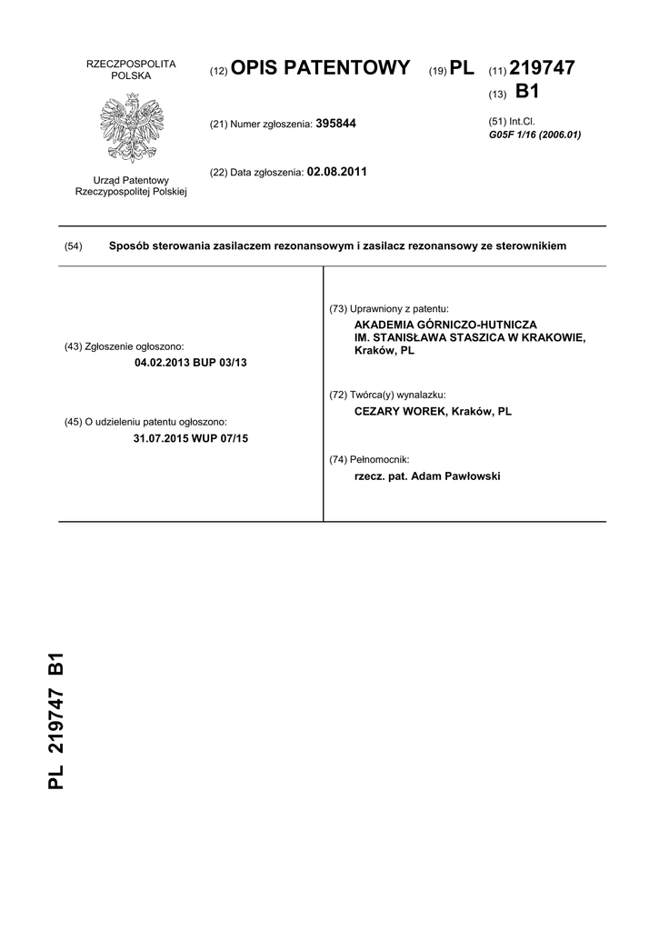 RZECZPOSPOLITA POLSKA (12) OPIS PATENTOWY (19) (21) Numer zgłoszenia: 395844 Urząd Patentowy Rzeczypospolitej Polskiej (54) PL 219747 (13) B1 (11) (51) Int.Cl. G05F 1/16 (2006.01) (22) Data zgłoszenia: 02.08.2011 Sposób sterowania zasilaczem rezonansowym i zasilacz rezonansowy ze sterownikiem (73) Uprawniony z patentu: (43) Zgłoszenie ogłoszono: AKADEMIA GÓRNICZO-HUTNICZA IM. STANISŁAWA STASZICA W KRAKOWIE, Kraków, PL 04.02.2013 BUP 03/13 (72) Twórca(y) wynalazku: (45) O udzieleniu patentu ogłoszono: CEZARY WOREK, Kraków, PL 31.07.2015 WUP 07/15 (74) Pełnomocnik: PL 219747 B1 rzecz. pat. Adam Pawłowski 2 PL 219 747 B1 Opis wynalazku Przedmiotem wynalazku jest sposób sterowania zasilaczem rezonansowym z miękkim przełączaniem oraz zasilacz rezonansowy ze sterownikiem, przeznaczony do stabilizacji napięć, prądów lub mocy wyjściowej. Większość rezonansowych zasilaczy nie jest w stanie zapewnić dobrej stabilizacji napięć, prądów lub mocy wyjściowej w pełnym zakresie zmian obciążenia, tzn. od stanu rozwarcia do stanu zwarcia. Ogólnie można przyjąć, że jeden lub nawet dwa z tych stanów są najbardziej niekorzystnymi stanami pracy. Aby temu zaradzić, modyfikuje się struktury rezonansowych obwodów mocy dodając na przykład układy zwrotu energii z rezonansowego obwodu do zasilania lub też modyfikuje się układy kontrolno-sterujące pracą kluczy prądowych. W polskim opisie patentowym P-349476 został przedstawiony sposób kontroli napięcia i prądu wyjściowego zasilaczy posiadających obwody zwrotu (recyrkulacji) nadmiaru energii z kondensatora szeregowego obwodu rezonansowego do zacisków stałoprądowego źródła zasilania falownika, który posiada ogranicznik napięcia wyjściowego włączony swoim wejściem równolegle do obciążenia przykładowo za pomocą transformatora pełniącego także rolę transformatora wyjściowego. Wyjście prostownikowe tego ogranicznika dobroci połączone jest z szynami stałoprądowego zasilania falownika. Ogranicznik napięcia oraz obwód zwrotu energii wzajemnie uzupełniają swoje działanie w taki sposób, że obwód zwrotu ogranicza wartość prądu płynącego w obwodzie rezonansowym i w rezultacie nadmiar zgromadzonej energii trafia z powrotem do źródła zasilania zarówno ze strony ogranicznika napięcia jak i ze strony obwodów zwrotu energii. Dzięki temu, że zasilacz ciągle pracuje z recyrkulacją energii do źródła zasilania, przebieg prądu w obwodzie rezonansowym zachowuje quasi- sinusoidalny charakter nawet przy braku zewnętrznego obciążenia, a napięcie wyjściowe zmienne lub stałe jest ograniczone do poziomu zadanego parametrami ogranicznika napięcia. W innym przykładzie wykonania w celu wymuszenia quasi- sinusoidalnych przebiegów prądów w obwodzie rezonansowym na stałoprądowym wyjściu zasilacza dołączony został kondensator, który jest ładowany grupą impulsów wyprostowanej sinusoidy tak długo aż napięcie tego kondensatora osiągnie poziom wyłączenia ustalony dzielnikiem napięcia wyjściowego i napięciem odniesienia doprowadzonym do drugiego wejścia komparatora z zachowaniem warunku, że długość najkrótszej grupy impulsów wynosi trzy półokresy drgań własnych obwodu rezonansowego, a włączenia i wyłączenia grup impulsów zachodzą w momentach gdy prądy kluczy zmierzają do zera. Natomiast w przerwie pomiędzy grupami impulsów obwód rezonansowy jest zwierany przez załączenie kluczy przyległych do jednego bieguna zasilania stałoprądowego. Z amerykańskiego opisu patentowego nr US 2010/0020569 znany jest rezonansowy konwerter posiadający układ adaptacyjnej kontroli czasu martwego poprawiający efektywność energetyczną, redukujący zaburzenia EMI oraz zmniejszający narażenia prądowo-napięciowe w elementach mocy. Czas martwy pomiędzy impulsami dostosowywany jest do wielkości napięcia wejściowego i regulowany na podstawie prądu płynącego przez indukcyjny element obwodu rezonansowego. Czas martwy pomiędzy impulsami może być również pobierany z tablicy ze stałymi „look-up table” lub na bieżąco obliczany z wartości napięcia wejściowego i amplitudy prądu płynącego w obwodzie rezonansowym. Z amerykańskiego opisu patentowego nr US20030231514 znany jest rezonansowy konwerter z rezonansem szeregowo-równoległym oraz sposób jego sterowania, dedykowane do aplikacji wysokonapięciowych (nawet powyżej 100 kV). W układzie sterowania wyróżniono dwa stany pracy – stan pracy kontrolujący parametry wyjściowe układu oraz stan startu. W rozwiązaniu tym początek włączenia kluczy prądowych jest zsynchronizowany z wartością prądu w równoległym obwodzie rezonansowym. W szczególności, początek pierwszego włączenia klucza prądowego jednego z kluczy prądowych odbywa się przy maksymalnej wartości prądu w równoległym obwodzie rezonansowym i przy takiej samej polaryzacji jak w szeregowym obwodzie rezonansowym. Z amerykańskiego opisu patentowego nr US20090034298 znana jest metoda sterowania zasilaczy rezonansowych AC-DC charakteryzująca się niskimi stratami mocy przy małym obciążeniu oraz w stanie czuwania. Bazuje ona na odpowiedzi częstotliwościowej układu i warunków obciążenia obwodu rezonansowego zasilacza i reguluje częstotliwość przełączania jak i czas trwania impulsu sterującego w taki sposób aby otrzymać stabilne napięcie wyjściowe. Metoda ta poprawia również swoje osiągi poprzez wykorzystanie techniki ZVS (Zero Voltage Switching) oraz wyjściowe prostowniki synchroniczne. Kontroler zasilacza rezonansowego wykorzystuje technikę hybrydową, polegającą na modulacji częstotliwości impulsów i jednocześnie wykorzystuje modulację szerokości impulsu (ang. PL 219 747 B1 3 frequency modulation hybrid pulse with modulation, FMHYPWM). Pozwala to również wykorzystać układ sterujący do poprawy współczynnika mocy oraz do sterowania synchronicznym prostownikiem wyjściowym. Ponad