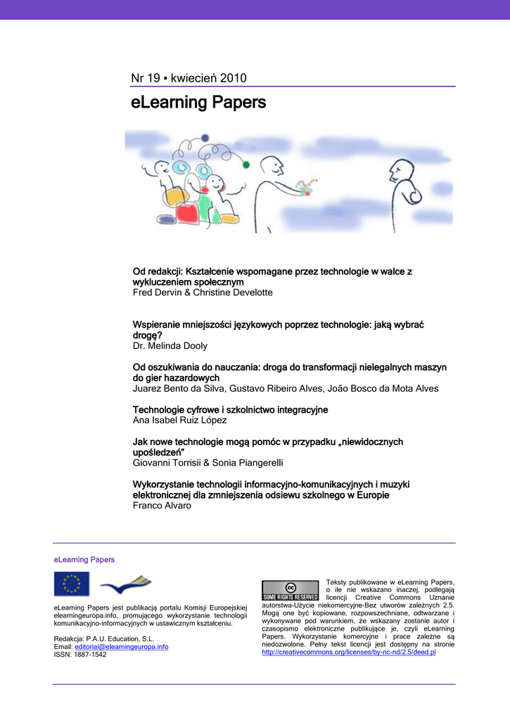 Nr 19 ▪ kwiecień 2010 eLearning Papers Od redakcji: Kształcenie wspomagane przez technologie w walce z wykluczeniem społecznym Fred Dervin & Christine Develotte Wspieranie mniejszości językowych poprzez technologie: jaką wybrać drogę? Dr. Melinda Dooly Od oszukiwania do nauczania: droga do transformacji nielegalnych maszyn do gier hazardowych Juarez Bento da Silva, Gustavo Ribeiro Alves, João Bosco da Mota Alves Technologie cyfrowe i szkolnictwo integracyjne Ana Isabel Ruiz López Jak nowe technologie mogą pomóc w przypadku „niewidocznych upośledzeń” Giovanni Torrisii & Sonia Piangerelli Wykorzystanie technologii informacyjno-komunikacyjnych i muzyki elektronicznej dla zmniejszenia odsiewu szkolnego w Europie Franco Alvaro eLearning Papers eLearning Papers jest publikacją portalu Komisji Europejskiej elearningeuropa.info, promującego wykorzystanie technologii komunikacyjno-informacyjnych w ustawicznym kształceniu. Redakcja: P.A.U. Education, S.L. Email: [email protected] ISSN: 1887-1542 Teksty publikowane w eLearning Papers, o ile nie wskazano inaczej, podlegają licencji Creative Commons Uznanie autorstwa-Użycie niekomercyjne-Bez utworów zależnych 2.5. Mogą one być kopiowane, rozpowszechniane, odtwarzane i wykonywane pod warunkiem, że wskazany zostanie autor i czasopismo elektroniczne publikujące je, czyli eLearning Papers. Wykorzystanie komercyjne i prace zależne są niedozwolone. Pełny tekst licencji jest dostępny na stronie http://creativecommons.org/licenses/by-nc-nd/2.5/deed.pl Od redakcji: Kształcenie wspomagane przez technologie w walce z wykluczeniem społecznym Coraz częściej przechodzimy do cyberprzestrzeni. Technologie Informacyjno-komunikacyjne (ang. ICT) stały się częścią naszego codziennego życia i przenikają wiele aspektów naszej działalności, takich jak środowiska pracy, codzienne komunikacje i relacje, załatwianie spraw administracyjnych, itd. Stały się głównym priorytetem i siłą napędową polityki, gospodarki oraz, co jest wyjątkowo ważne dla tego numeru, edukacji. Jednak musimy wspierać dalszy rozwój cyfrowej równości, aby zapewnić integrację społeczną w ramach lub poprzez ten proces przechodzenia do cyberprzestrzeni. Wiele osób zgadza się obecnie, że większość koncepcji cyfrowej nierówności szans lub tak zwanego wykluczenia cyfrowego musi być ponownie rozważona, ponieważ samo dostarczenie sprzętu komputerowego, oprogramowania i dostępu do Internetu nie jest gwarancją e-integracji i wspierania integracji społecznej. W rzeczywistości, musimy upewnić się, że są one w sposób skuteczny wdrażane we wspólnotach, instytucjach i społeczeństwach i wykorzystywane przez jednostki w celu aktywnego udziału w realnych praktykach społecznych (Warschauer, 20031). Rok 2010 został ogłoszony „Europejskim rokiem walki z biedą i wykluczeniem społecznym”. Poprzez ten numer eLearning Papers chcemy przyłączyć się do debaty, przedstawiając pewne korzyści i szanse, które kształcenie wspierane technologicznie może zaoferować na rzecz integracji społecznej. Autorzy artykułów wyjaśniają, w jaki sposób można tworzyć bardziej integracyjne technologie informacyjno-komunikacyjne poprzez innowacyjne koncepcje. W artykułach tego numeru, przeanalizowano pięć różnych populacji, zagrożonych wykluczeniem społecznym: mniejszościowe grupy językowe, dzieci upośledzone, dyslektyków, osoby z upośledzeniem wzrokowym oraz osoby z tak zwanego odsiewu szkolnego. W pierwszym artykule, Melinda Dooly wskazuje, w jaki sposób kształcenie wspomagane przez technologie może pomóc we wspieraniu językowych grup mniejszościowych, szczególnie w ujęciu holistycznym. To jest to, co w pewnym sensie, osiągnęli w swojej pracy Da Silva et al. Opisują oni, jak w Brazylii 200 automatów do gry w pokera zostało zamienionych w narzędzia edukacyjne i wykorzystanych do redukowania ryzyka związanego z biedą oraz wspierania integracji społecznej dzieci ze szkół podstawowych. Dwa kolejne artykuły traktują temat upośledzeń fizycznych i integracji. Ana Isabel Ruiz López przedstawia powstałą w Hiszpanii Grupę na rzecz dostępności edukacyjnej organizacji ONCE, która ma na celu prowadzenie badań naukowych, szkoleń i doradztwa w dziedzinie dostępności dla osób z upośledzeniem wzrokowym, natomiast Torrisi i Piangerelli przedstawiają międzynarodowy projekt ICTBell wspierający integrację osób z dysleksją w oparciu o technologie informacyjnokomunikacyjne. Tematem ostatniego artykułu w tym numerze, autorstwa Franco Alvaro, jest zjawisko odsiewu szkolnego wśród młodych uczniów. Projekt europejski e-Motion wykorzystuje innowacyjne techniki, aby zmodyfikować sposób, w jaki kształcenie dociera do tej grupy, konkretnie poprzez wykorzystanie muzyki elektronicznej. Z pewnością przedstawione tu inicjatywy staną się ważnym głosem w debacie toczonej i wspieranej w ramach Europejskiego roku na rzecz walki z biedą i wykluczeniem społecznym. Fred Dervin, University of Turku & University of Joensuu Christine Develotte, INRP - Institut national de recherche pédagogique 1 Warschauer, M. (2003). Technology and social inclusion: Rethinking the digital divide. Cambridge, MA: MIT Press. eLearning Papers • www.elearningpapers.eu • ISSN 1887-1542 Nr 19 • kwiecień 2010 • PL 2 Dr Melinda Dooly Faculty of Education, Universitat Autònoma de Barcelona Nasz artykuł na wstępie przedstawia krótko, w jaki sposób idea spójności społecznej funkcjonuje w politykach społecznych i edukacyjnych, skupiając się szczególnie na dwóch głównych pojawiających się punktach: równość szans społecznych oraz edukacja jako ogniwo spójności społecznej. Podstawowe pojęcia spójność społeczna, dostępność, wielojęzykowość, mniejszości językowe, kształcenie wspierane przez technologie, praktyki nauczycielskie Pełny tekst http://www.elearningeuropa.i nfo/files/media/media22221.