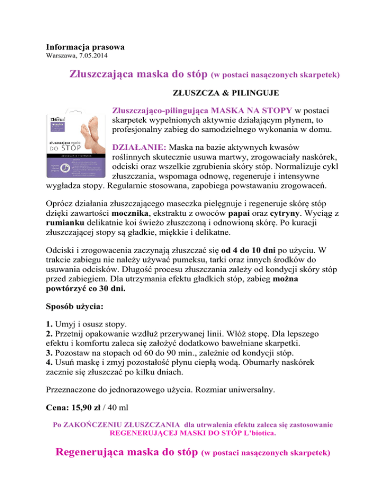 Informacja prasowa Warszawa, 7.05.2014 Złuszczająca maska do stóp (w postaci nasączonych skarpetek) ZŁUSZCZA & PILINGUJE Złuszczająco-pilingująca MASKA NA STOPY w postaci skarpetek wypełnionych aktywnie działającym płynem, to profesjonalny zabieg do samodzielnego wykonania w domu. DZIAŁANIE: Maska na bazie aktywnych kwasów roślinnych skutecznie usuwa martwy, zrogowaciały naskórek, odciski oraz wszelkie zgrubienia skóry stóp. Normalizuje cykl złuszczania, wspomaga odnowę, regeneruje i intensywne wygładza stopy. Regularnie stosowana, zapobiega powstawaniu zrogowaceń. Oprócz działania złuszczającego maseczka pielęgnuje i regeneruje skórę stóp dzięki zawartości mocznika, ekstraktu z owoców papai oraz cytryny. Wyciąg z rumianku delikatnie koi świeżo złuszczoną i odnowioną skórę. Po kuracji złuszczającej stopy są gładkie, miękkie i delikatne. Odciski i zrogowacenia zaczynają złuszczać się od 4 do 10 dni po użyciu. W trakcie zabiegu nie należy używać pumeksu, tarki oraz innych środków do usuwania odcisków. Długość procesu złuszczania zależy od kondycji skóry stóp przed zabiegiem. Dla utrzymania efektu gładkich stóp, zabieg można powtórzyć co 30 dni. Sposób użycia: 1. Umyj i osusz stopy. 2. Przetnij opakowanie wzdłuż przerywanej linii. Włóż stopę. Dla lepszego efektu i komfortu zaleca się założyć dodatkowo bawełniane skarpetki. 3. Pozostaw na stopach od 60 do 90 min., zależnie od kondycji stóp. 4. Usuń maskę i zmyj pozostałość płynu ciepłą wodą. Obumarły naskórek zacznie się złuszczać po kilku dniach. Przeznaczone do jednorazowego użycia. Rozmiar uniwersalny. Cena: 15,90 zł / 40 ml Po ZAKOŃCZENIU ZŁUSZCZANIA dla utrwalenia efektu zaleca się zastosowanie REGENERUJĄCEJ MASKI DO STÓP L’biotica. Regenerująca maska do stóp (w postaci nasączonych skarpetek) REGENERUJE & NAWILŻA Regenerująca MASKA DO STÓP w postaci skarpet nasączonych aktywnym kremem, to profesjonalny zabieg do samodzielnego wykonania w domu. DZIAŁANIE: Maska skutecznie regeneruje i zmiękcza suchą skórę stóp. Przywraca stopom miękkość i zdrowy wygląd. Intensywnie nawilża i zabezpiecza przed rogowaceniem. Maska na bazie naturalnych składników- masła shea, jabłka oraz mięty wygładza i silnie regeneruje suchą, spękaną i zrogowaciałą skórę stóp, znacząco poprawiając jej wygląd i kondycję. Skuteczne nawilża i odżywia nawet bardzo przesuszoną i zniszczoną skórę stóp. Sprawia, że staje się gładka, miękka i zdrowa. Dzięki nowoczesnej technologii, substancje aktywne zawarte w masce są doskonale wchłaniane i wnikają nawet w głębokie warstwy skóry. Maska w postaci skarpetek spełnia rolę filtra, który w połączeniu z ciepłotą ciała stopniowo uwalnia aktywne składniki i pomaga wnikać im w głębokie warstwy skóry. Efekt widoczny już po pierwszym użyciu – skóra stóp jest widocznie zregenerowana, nawilżona i gładka. Dla utrzymania efektu zadbanych i gładkich stóp, zabieg należy powtarzać 1-2 razy w tygodniu. Sposób użycia: 1. Umyj i osusz stopy. 2. Otwórz opakowanie. Włóż stopę. Dla lepszego efektu i komfortu zaleca się założyć dodatkowo bawełniane skarpetki. 3. Pozostaw na stopach ok. 25-40 minut, zależnie od kondycji stóp. 4. Zdejmij maskę, nadmiar aktywnego kremu delikatnie wmasuj w stopy. Przeznaczone do jednorazowego użycia. Rozmiar uniwersalny. Cena: 13,90 zł / 32 ml Dla uzyskania optymalnego efektu przed regeneracją zaleca się złuszczenie naskórka ZŁUSZCZAJĄCĄ MASKĄ DO STÓP L’biotica. kontakt dla mediów: Magda Rewucka, tel. 501 123 985 e-mail: [email protected]