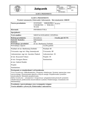 Data: 16.04.2008r. Wydanie: I Załącznik Symbol: Z-5.4-1-1 Strona: Status: obowiązujący KARTA PRZEDMIOTU KARTA PRZEDMIOTU Wydział Automatyki, Elektroniki i Informatyki, Rok akademicki: 2008/09 Nazwa przedmiotu: SYSTEMY MIKROPRO- Kod/nr CESOROWE I WBUDOWANE Kierunek: INFORMATYKA Specjalność: Tryb studiów: NIESTACJONARNE I STOPNIA Rodzaj przedmiotu: Instytut/ Katedra: Semestr: Prowadzący przedmiot: Prowadzący zajęcia: kierunkowy Informatyki 4-6 dr inż. Bartłomiej Zieliński Liczba godzin Liczba pkt ECTS Wykład: dr inż. Bartłomiej Zieliński Wykład: 60 Ćwiczenia: mgr inż. Oleg Antemijczuk Ćwiczenia: 15 Laboratorium: mgr inż. Jarosław Paduch Laboratorium: 30 dr inż. Krzysztof Tokarz Projekt: 30 dr inż. Grzegorz Baron Seminarium: dr inż. Gabriel Drabik Projekt: Seminarium: Powiązanie ze standardami i cel kształcenia Treści kształcenia: Mikrokontrolery. Programy wbudowane. Systemy operacyjne czasu rzeczywistego. Przetwarzanie danych a zużycie energii. Projektowanie systemów niezawodnych. Metodyki projektowania. Efekty kształcenia – umiejętności i kompetencje: programowania prostych systemów wbudowanych; podnoszenia niezawodności systemu wbudowanego; rozumienia roli dokumentacji. Przedmioty wprowadzające oraz wymagania wstępne Teoria układów cyfrowych, Elektronika i miernictwo 1/1 Załącznik Data: 16.04.2008r. Wydanie: I Status: obowiązujący Symbol: Z-5.4-1-1 Strona: 2/1 KARTA PRZEDMIOTU Treść wykładów: 1. 2. 3. 4. 5. 6. 7. 8. 9. 10. 11. 12. 13. 14. 15. 16. 17. 18. 19. 20. 21. 22. 23. 24. 25. 26. 27. 28. 29. 30. Układy wspomagające. Łączenie bramek OC. Rejestry, bufory. Liczniki synchroniczne i asynchroniczne. Układy czasowe. Pamięci. Pamięci stałe ROM, PROM, EPROM, EEPROM. Pamięci o swobodnym dostępie SRAM, DRAM, PRAM. Przebiegi czasowe pamięci dynamicznych. Tworzenie bloków pamięci. Mikrokomputer i mikroprocesor. Jednostka arytmetyczno-logiczna. Cykl maszynowy i rozkazowy. Tryby adresowania. Wymiana danych między mikroprocesorem a otoczeniem: Mikroprocesor Z-80. Rejestry, znaczniki. Wyprowadzenia. Podstawowe cykle maszynowe. Tryby przerwań. Buforowanie wyprowadzeń. Mikrokomputer jednoukładowy 8051. Wyprowadzenia, podstawowe cykle maszynowe. Ogólna architektura układu i jednostki centralnej. Mikrokomputer jednoukładowy 8051. Wbudowane układy interfejsów otoczenia: port szeregowy, układ przerwań, liczniki itp. Układy równoległego wejścia-wyjścia. Bufory Rejestr uniwersalny 8212. Programowalne układy 8255 i Z80 PIO – struktura, tryby pracy, rejestry. Układy transmisji szeregowej i czasowo-licznikowe. Układ transmisji szeregowej 8251 oraz układy czasowo-licznikowe 8253 i Z80 CTC – struktura, tryby pracy, rejestry. Sterowniki przerwań 8214, 8259 i 8259A – struktura, tryby pracy, rejestry. Przykłady łączenia łańcuchowego i kaskadowego. Sterowniki DMA 8257 i 8237 – struktura, tryby pracy, rejestry. Linie przesyłowe. Pojęcia podstawowe. Rodzaje linii przesyłowych. Dopasowanie linii. Odbicia i przesłuchy. Standardy RS-232, RS-423, RS-422, RS-485. Diagramy Bergerona. Montaż układów cyfrowych. Zasady wykonywania płytek drukowanych, parametry połączeń. Testowanie układów. Analizator sygnatur. Uruchamianie układów mikroprocesorowych. Uruchamianie części sprzętowej i programowej. Analizator stanów logicznych. Debugger. Symulator. Emulator układowy. Współczesne mikrosterowniki. Założenia architektury typu Harvard. Mikrosterowniki rodziny PIC i AVR – organizacja pamięci programu i danych, tryby adresowanie, układ przerwań. Reprogramowalne układy cyfrowe. Klasyfikacja. Układy PLA, PAL, GAL - struktury i właściwości. Układy FPGA. Języki opisu struktury układów reprogramowalnych. Programowanie mikroprocesora 8051. Lista rozkazów, grupy rozkazów, przykładowe techniki programowania. Mikroprocesor 8086. Struktura – bloki EU i BIU. Rejestry, segmentowa organizacja pamięci. Adres logiczny i fizyczny. Wyprowadzenia. Tryby pracy minimalny i maksymalny. Układ przerwań. Koprocesor zmiennoprzecinkowy 8087. Zasada współpracy z 8086. Typy danych. Rejestry wewnętrzne. Mikrokomputery IBM PC/XT i PC/AT. Struktura. Magistrala ISA 8- i 16-bitowa. Zastosowanie układów wspomagających. Ewolucja mikroprocesorów od 8086 do 80486. Mikroprocesory 80286 i 80386 – nowe cechy, adresowanie w trybie wirtualnym, współpraca z koprocesorem. Mikroprocesor 80486 – architektura. Mikroprocesor 80486. Sygnały. Rejestry, znaczniki. Adres logiczny i fizyczny. Segmentacja i stronicowanie Mikroprocesor 80486. Organizacja pamięci podręcznej. Przesyły seryjne. Bufory zapisu. Mechanizmy ochrony zadań. Przerwania i wyjątki. Tablica przerwań w trybie rzeczywistym i wirtualnym. Mikrokomputer IBM PC – rozwój architektury. Magistrale EISA, MCA, VLB – podstawowe cechy. Magistrala PCI. Sygnały i cykle magistrali PCI. Przerwania w urządzeniach PCI. Magistrala PCI – pamięć konfiguracyjna. Sposoby dostępu do pamięci konfiguracyjnej w IBM PC. Klasyfikacja urządzeń. Magistrala AGP – struktura komputera, sygnały, tryby pracy. Techniki zwiększania wydajności mikroprocesorów. Potokowe wykonanie rozkazów. Superskalarność. Przewidywanie skoków. Pamięć podręczna – organizacja. Protokół MESI. Mikroprocesor Pentium. Struktura. Potokowość, parowanie instrukcji. Pamięć podręczna. Potokowa jednostka FPU. Rozkazy i typy danych MMX. Mikroprocesory Pentium Pro, Pentium II, Pentium III. Nowoczesne układy pamięci. Zasada działania synchronicznych pamięci DRAM (SDRAM). Graf stanów pamięci SDRAM. Pamięci DDRAM – zasada działania. Konfigurowanie pamięci SDRAM, DDRAM. Pamięci RAMBUS – zasada działania, struktura modułu. Nowoczesne mikroprocesory. Struktura wewnętrzna i ogólna zasada działania mikroprocesora AMD Athlon oraz Intel Pentium 4. HyperThreading - przesłanki, zasada działania. Mikroprocesory 64-bitowe. Struktura wewnętrzna mikroprocesora AMD Athlon-64. Zaawanso
