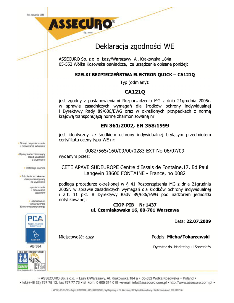 Deklaracja zgodności WE ASSECURO Sp. z o. o. Łazy/Warszawy Al. Krakowska 184a 05-552 Wólka Kosowska oświadcza, że urządzenie opisane poniżej: SZELKI BEZPIECZEŃSTWA ELEKTRON QUICK – CA121Q Typ (odmiany): CA121Q jest zgodny z postanowieniami Rozporządzenia MG z dnia 21grudnia 2005r. w sprawie zasadniczych wymagań dla środków ochrony indywidualnej i Dyrektywy Rady 89/686/EWG oraz w określonych przypadkach z normą krajową transponującą normę zharmonizowaną nr: EN 361:2002, EN 358:1999 jest identyczny ze środkiem ochrony indywidualnej będącym przedmiotem certyfikatu oceny typu WE nr: 0082/565/160/09/00/0283 EXT No 06/07/09 wydanym przez: CETE APAVE SUDEUROPE Centre d'Essais de Fontaine,17, Bd Paul Langevin 38600 FONTAINE - France, no 0082 podlega procedurze określonej w § 41 Rozporządzenia MG z dnia 21grudnia 2005r. w sprawie zasadniczych wymagań dla środków ochrony indywidualnej i art. 11 pkt. B Dyrektywy Rady 89/686/EWG pod nadzorem jednostki notyfikowanej: CIOP-PIB Nr 1437 ul. Czerniakowska 16, 00-701 Warszawa Data: 22.07.2009 Miejscowość: Łazy Podpis: Michał Tokarzewski Dyrektor ds. Marketingu i Sprzedaży