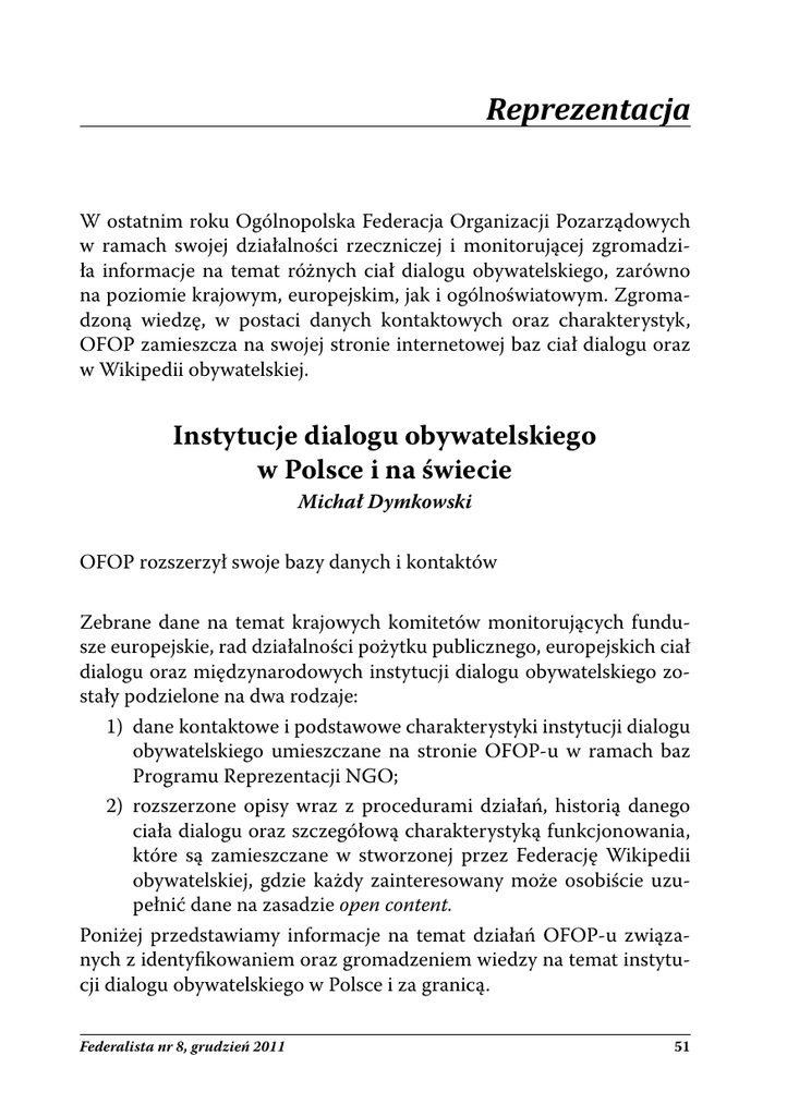 Reprezentacja W ostatnim roku Ogólnopolska Federacja Organizacji Pozarządowych w ramach swojej działalności rzeczniczej i monitorującej zgromadziła informacje na temat różnych ciał dialogu obywatelskiego, zarówno na poziomie krajowym, europejskim, jak i ogólnoświatowym. Zgromadzoną wiedzę, w postaci danych kontaktowych oraz charakterystyk, OFOP zamieszcza na swojej stronie internetowej baz ciał dialogu oraz w Wikipedii obywatelskiej. Instytucje dialogu obywatelskiego w Polsce i na świecie Michał Dymkowski OFOP rozszerzył swoje bazy danych i kontaktów Zebrane dane na temat krajowych komitetów monitorujących fundusze europejskie, rad działalności pożytku publicznego, europejskich ciał dialogu oraz międzynarodowych instytucji dialogu obywatelskiego zostały podzielone na dwa rodzaje: 1) dane kontaktowe i podstawowe charakterystyki instytucji dialogu obywatelskiego umieszczane na stronie OFOP-u w ramach baz Programu Reprezentacji NGO; 2) rozszerzone opisy wraz z procedurami działań, historią danego ciała dialogu oraz szczegółową charakterystyką funkcjonowania, które są zamieszczane w stworzonej przez Federację Wikipedii obywatelskiej, gdzie każdy zainteresowany może osobiście uzupełnić dane na zasadzie open content. Poniżej przedstawiamy informacje na temat działań OFOP-u związanych z identyfikowaniem oraz gromadzeniem wiedzy na temat instytucji dialogu obywatelskiego w Polsce i za granicą. Federalista nr 8, grudzień 2011 51 I. Aktualizacja baz danych kontaktowych w ramach krajowych komitetów monitorujących programy operacyjne finansowane z funduszy europejskich OFOP uzupełnił swoje zasoby kontaktów reprezentantów społeczeństwa obywatelskiego w komitetach i podkomitetach monitorujących o dane przedstawicieli trzeciego sektora w ciałach dialogu Europejskich Programów Współpracy Terytorialnej. Od września 2009 r. do maja roku 2011 trwał proces zbierania tych danych od różnych instytucji, w tym od Ministerstwa Rozwoju Regionalnego oraz sekretariatów poszczególnych programów Europejskiej Współpracy Terytorialnej (EWT). W efekcie udało się uzyskać dane członków reprezentujących organizacje ze wszystkich działających obecnie komitetów EWT: 1. Program Operacyjny Współpracy Transgranicznej Polska-Saksonia 2007-2013; 2. Program Operacyjny Współpracy Transgranicznej Republika Czeska-Rzeczpospolita Polska 2007-2013; 3. Program Operacyjny Współpracy Transgranicznej Polska (województwo lubuskie)-Brandenburgia 2007-2013; 4. Program Operacyjny Współpracy Transgranicznej Południowy Bałtyk 2007-2013; 5. Program Operacyjny Współpracy Transgranicznej Rzeczpospolita Polska-Republika Słowacka 2007-2013; 6. Program Operacyjny Współpracy Transgranicznej Polska-Białoruś-Ukraina 2007-2013; 7. Program Operacyjny Współpracy Transgranicznej Polska-Litwa 2007-2013; 8. Program Operacyjny Współpracy Transgranicznej Meklemburgia-Pomorze Przednie-Brandenburgia-Rzeczpospolita Polska (województwo zachodniopomorskie) 2007-2013; 9. Program Operacyjny Współpracy Transnarodowej Region Morza Bałtyckiego 2007-2013; 10. Program Operacyjny Współpracy Transnarodowej dla Europy Środkowej 2007-2013; 11. Program Operacyjny Współpracy Międzyregionalnej – INTERREG IVC. 52 Federalista nr 8, grudzień 2011 Uzupełnione dane kontaktowe można znaleźć na stronie Federacji w zakładce Programu Reprezentacji NGO „Baza członków KM”. II. Aktualizacja bazy informacji na temat europejskich ciał dialogu na różnym szczeblu oraz mających różne cele i prerogatywy W 2010 r. OFOP zaczął mocniej interesować się instytucjami dialogu obywatelskiego działającymi w naszym regionie. W tym też roku na stronach Federacji pojawiły się krótkie informacje na temat dwóch ciał dialogu istniejących w ramach europejskich struktur: Europejskiego Komitetu Społeczno-Ekonomicznego oraz Konferencji Międzynarodowych Organizacji Pozarządowych Rady Europy. Rok później OFOP powrócił do tej kwestii, starając się zidentyfikować oraz opisać, na podstawie dostępnych Federacji danych, najważniejsze instytucje dialogu obywatelskiego, w których realny udział mają przedstawiciele organizacji pozarządowych. Zidentyfikowano więc następujące instytucje debaty obywatelskiej: 1. Komitet OECD ds. Inwestycji Międzynarodowych i Przedsiębiorstw Wielonarodowych, 2. Forum OECD LEED w sprawie partnerstwa i zarządzania lokalnego, 3. Komitet Łącznikowy OECD ds. Międzynarodowych Organizacji Pozarządowych, 4. Komitet Łącznikowy ds. Międzynarodowych Organizacji Pozarządowych przy Radzie Europy, 5. Forum Ekonomiczne i Ochrony Środowiska OBWE, 6. Inicjatywa Dusza dla Europy, 7. Seminaria i eksperckie sesje robocze Dyrekcji Generalnej Komisji Europejskiej do spraw rozwoju i współpracy „Pomoc Europie”, 8. Platforma Praw Podstawowych UE (FRA), 9. Forum Społeczeństwa Obywatelskiego, 10. Platformy Partnerstwa Wschodniego. Dane kontaktowe wymienionych wyżej ciał wraz z krótką charakterystyką członków zostały umieszczone na stronie internetowej OFOP-u, w dziale Programu Reprezentacji NGO. Federalista nr 8, grudzień 2011 53 III. Stworzenie nowej bazy ciał dialogu na poziomie ogólnoświatowym Idąc za ciosem, Federacja postanowiła wyszukać, analogicznie do przypadku ciał dialogu szczebla europejskiego, podobne formy organizacji debaty obywatelskiej, ale w kontekście całego świata. Do 7 grudnia 2011 r. udało się zidentyfikować 17 podmiotów, ale OFOP nadal chce poszerzać swoją bazę. Oto ciała dialogu instytucji międzynarodowych: 1. Rada Ekonomiczno-Społeczna ONZ (ECOSOC), 2. Biuro Łącznikowe ONZ dla Organizacji Pozarządowych, 3. Rada Wykonawcza UNESCO, 4. Konferencja Generalna UNESCO, 5. Światowa Organizacja Turystyki (UNWTO), 6. Międzyrządowa Grupa Robocza ds. Prawa do Rozwoju (przy Radzie Praw Człowieka), 7. Komitet Przeciwko Torturom (CAT), 8. Grupa Zadaniowa Sieci połączonych Agencji ds. Kobiet i Ró