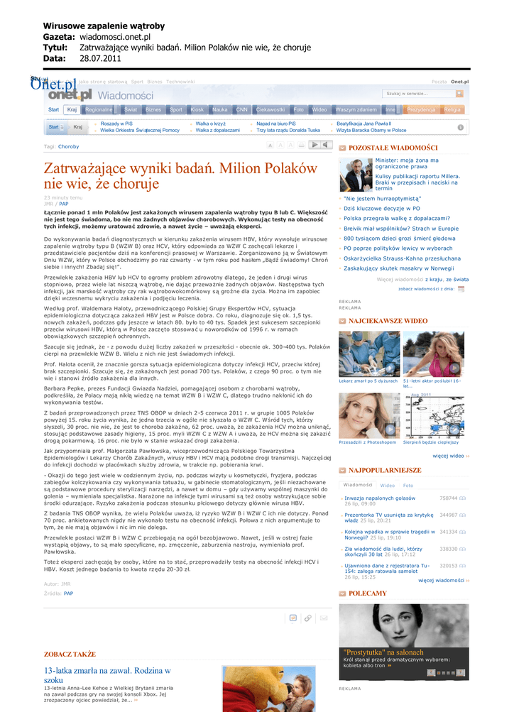 Wirusowe zapalenie w¹troby Gazeta: wiadomosci.onet.pl Tytu³: Zatrwa¿aj¹ce wyniki badañ. Milion Polaków nie wie, ¿e choruje Data: 28.07.2011 żFotoreporta cej ę wi c wi ę ... wiecej Szu Dej rukuj Ustaw y Nast ż ś ą ę 뱮 Onet.pl Start Onet jako stron ę startow ą Sport Biznes Technowinki Kraj Start Poczta Onet.pl Szukaj w serwisie... Regionalne Kraj Świat Biznes Sport Roszady w PiS Wielka Orkiestra Świ ątecznej Pomocy Tagi: Choroby Kiosk Nauka CNN Walka o krzyż Walka z dopalaczami Ciekawostki Foto Wideo Napad na biuro PiS Trzy lata rządu Donalda Tuska IVONA Webreader. Waszym zdaniem Inne Prezydencja Religia Beatyfikacja Jana Pawła II Wizyta Baracka Obamy w Polsce POZOSTAŁE WIADOMOŚCI Minister: moja żona ma ograniczone prawa Zatrważające wyniki badań. Milion Polaków nie wie, że choruje Kulisy publikacji raportu Millera. Braki w przepisach i naciski na termin 23 minuty temu JMR / PAP "Nie jestem hurraoptymist ą" Łącznie ponad 1 mln Polaków jest zakażonych wirusem zapalenia wątroby typu B lub C. Większość nie jest tego świadoma, bo nie ma żadnych objawów chorobowych. Wykonując testy na obecność tych infekcji, możemy uratować zdrowie, a nawet życie – uważają eksperci. Polska przegra ła walkę z dopalaczami? Do wykonywania bada ń diagnostycznych w kierunku zakażenia wirusem HBV, który wywołuje wirusowe zapalenie w ątroby typu B (WZW B) oraz HCV, który odpowiada za WZW C zach ęcali lekarze i przedstawiciele pacjentów dzi ś na konferencji prasowej w Warszawie. Zorganizowano j ą w Światowym Dniu WZW, który w Polsce obchodzimy po raz czwarty - w tym roku pod hasłem „Bądź świadomy! Chroń siebie i innych! Zbadaj się!”. Przewlek łe zaka żenia HBV lub HCV to ogromy problem zdrowotny dlatego, że jeden i drugi wirus stopniowo, przez wiele lat niszcz ą wątrobę, nie dając przewa żnie żadnych objawów. Nast ępstwa tych infekcji, jak marskość wątroby czy rak wątrobowokomórkowy s ą groźne dla życia. Można im zapobiec dzięki wczesnemu wykryciu zakażenia i podjęciu leczenia. Wed ług prof. Waldemara Haloty, przewodnicz ącego Polskiej Grupy Ekspertów HCV, sytuacja epidemiologiczna dotycz ąca zaka żeń HBV jest w Polsce dobra. Co roku, diagnozuje się ok. 1,5 tys. nowych zaka żeń, podczas gdy jeszcze w latach 80. by ło to 40 tys. Spadek jest sukcesem szczepionki przeciw wirusowi HBV, którą w Polsce zacz ęto stosowa ć u noworodków od 1996 r. w ramach obowi ązkowych szczepie ń ochronnych. Dziś kluczowe decyzje w PO Breivik miał wspólników? Strach w Europie 800 tysiącom dzieci grozi śmierć głodowa PO poprze polityków lewicy w wyborach Oskarżycielka Strauss-Kahna przes łuchana Zaskakujący skutek masakry w Norwegii Więcej wiadomo ści z kraju , ze świata zobacz wiadomo ś ci z dnia: REKLAMA REKLAMA NAJCIEKAWSZE WIDEO Szacuje się jednak, że - z powodu du żej liczby zakażeń w przesz łości - obecnie ok. 300-400 tys. Polaków cierpi na przewlekłe WZW B. Wielu z nich nie jest świadomych infekcji. Prof. Halota ocenił, że znacznie gorsza sytuacja epidemiologiczna dotyczy infekcji HCV, przeciw której brak szczepionki. Szacuje si ę, że zaka żonych jest ponad 700 tys. Polaków, z czego 90 proc. o tym nie wie i stanowi źródło zaka żenia dla innych. Lekarz zmar ł po 5 dy żurach 51 - letni aktor po ś lubi ł 16 lat... Przesadzili z Photoshopem Sierpie ń będzie cieplejszy Barbara Pepke, prezes Fundacji Gwiazda Nadziei, pomagaj ącej osobom z chorobami wątroby, podkre śliła, że Polacy mają nikłą wiedz ę na temat WZW B i WZW C, dlatego trudno nak łonić ich do wykonywania testów. Z badań przeprowadzonych przez TNS OBOP w dniach 2 -5 czerwca 2011 r. w grupie 1005 Polaków powy żej 15. roku życia wynika, że jedna trzecia w ogóle nie s łysza ła o WZW C. W śród tych, którzy słyszeli, 30 proc. nie wie, że jest to choroba zaka źna, 62 proc. uwa ża, że zaka żenia HCV można uniknąć, stosuj ąc podstawowe zasady higieny, 15 proc. myli WZW C z WZW A i uwa ża, że HCV można się zakazi ć drogą pokarmow ą. 16 proc. nie było w stanie wskaza ć drogi zaka żenia. Jak przypomniała prof. Małgorzata Paw łowska, wiceprzewodnicz ąca Polskiego Towarzystwa Epidemiologów i Lekarzy Chorób Zaka źnych, wirusy HBV i HCV mają podobne drogi transmisji. Najczęś ciej do infekcji dochodzi w placówkach s łużby zdrowia, w trakcie np. pobierania krwi. - Okazji do tego jest wiele w codziennym życiu, np. podczas wizyty u kosmetyczki, fryzjera, podczas zabiegów kolczykowania czy wykonywania tatua żu, w gabinecie stomatologicznym, je śli niezachowane są podstawowe procedury sterylizacji narz ędzi, a nawet w domu – gdy używamy wspólnej maszynki do golenia – wymieniała specjalistka. Narażone na infekcje tymi wirusami s ą też osoby wstrzykuj ące sobie środki odurzaj ące. Ryzyko zakażenia podczas stosunku p łciowego dotyczy g łównie wirusa HBV. Z badania TNS OBOP wynika, że wielu Polaków uwa ża, iż ryzyko WZW B i WZW C ich nie dotyczy. Ponad 70 proc. ankietowanych nigdy nie wykona ło testu na obecno ść infekcji. Połowa z nich argumentuje to tym, że nie mają objawów i nic im nie dolega. Przewlek łe postaci WZW B i WZW C przebiegaj ą na ogó ł bezobjawowo. Nawet, je śli w ostrej fazie wyst ąpią objawy, to s ą mało specyficzne, np. zmęczenie, zaburzenia nastroju, wymieniała prof. Paw łowska. Toteż eksperci zach ęcają by osoby, które na to sta ć, przeprowadzi ły testy na obecno ść infekcji HCV i HBV. Koszt jednego badania to kwota rz ędu 20-30 zł. Autor: JMR Źródła: PAP ZOBACZ TAKŻE 13-latka zmarła na zawał. Rodzina w szoku 13-letnia Anna-Lee Kehoe z Wielkiej Brytanii zmar ła na zawał podczas gry na swojej konsoli Xbox. Jej zrozpaczony ojciec powiedzia ł, że... Pamiętniki ujawniły prawdę o więcej wideo NAJPOPULARNIEJSZE Wiadomo ści Wideo Foto Inwazja napalonych golasów 26 lip, 09:00 758744 Prezenterka TV usuni ęta z
