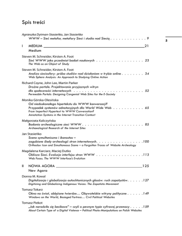 WSTĘP Spis treści Agnieszka Dytman-Stasieńko, Jan Stasieńko WWW – Sieć metafor, metafory Sieci i studia nad Siecią . . . . . . . . . . . . . 9 I MEDIUM Medium 21 Steven M. Schneider, Kirsten A. Foot Sieć WWW jako przedmiot badań naukowych . . . . . . . . . . . . . . . . . 23 The Web as an Object of Study Steven M. Schneider, Kirsten A. Foot Analiza sieciosfery: próba studiów nad działaniem w trybie online . . . . . . . . 34 Web Sphere Analysis: An Approach to Studying Online Action Richard Coyne, John Lee, Martin Parker Drożne portale. Projektowanie przyjaznych witryn dla społeczności internetowych . . . . . . . . . . . . . . . . . . . . . . . . . 52 Permeable Portals: Designing Congenial Web Sites for the E-Society Monika Górska-Olesińska Od niedoskonałego hipertekstu do WWW konwersacji? Przypadek systemów adnotacyjnych dla World Wide Web . . . . . . . . . . . 65 From Imperfect Hypertext to WWW Conversation? Annotation Systems in the Internet Transition Context Małgorzata Kaliczyńska Badania archeologiczne sieci WWW . . . . . . . . . . . . . . . . . . . . . . 85 Archaeological Research of the Internet Sites Jan Stasieńko Scena symultaniczna i ikonostas – zagubione ślady archeologii stron internetowych. . . . . . . . . . . . . . . . .100 Orthodox Icon and Simultaneous Scene – a Forgotten Traces of Website Archeology Magdalena Karciarz, Maciej Dutko Oblicza Sieci. Ewolucja interfejsu stron WWW . . . . . . . . . . . . . . . . .113 Web Faces. The WWW Interface’s Evolution II NOWA AGORA New Agora 125 Donna M. Kowal Digitalizacja i globalizacja autochtonicznych głosów: ruch zapatystów. . . . . .127 Digitizing and Globalizing Indigenous Voices: The Zapatista Movement Tomasz Tokarz Okna na świat, oblężone twierdze… Obywatelskie witryny polityczne . . . . . .149 Windows on the World, Besieged Fortress… Civil Political Websites Tomasz Piekot „Jak narodziło się becikowe” – czyli o pewnym typie cyfrowej przemocy . . . . .159 About Certain Type of a Digital Violence – Political Photo-Manipulations on Polish Websites 5 Michał Otrocki Sieć jako medium dekonspiracji (prolegomena do analizy dyskursu teoriospiskowego) . . . . . . . . . . . . . .170 The Web as a Medium of Deconspiration (Prolegomena to Discourse Analysis of Conspiracy Theories) 6 Marta Klimowicz Blogi – nowy głos demokracji? . . . . . . . . . . . . . . . . . . . . . . . . .185 Weblogs – a New Voice of Democracy? Agnieszka Dytman-Stasieńko Dawid vs. Goliat? WWW jako cel ataków cyberaktywistów . . . . . . . . . . .195 David vs. Goliath? – WWW as a Target of Cyberactivists’ Attacks III BRAMA Gate 207 Andrzej Wojnach Czy telewizja równoległa? Interaktywna strona internetowa itvp.pl . . . . . . . .209 Parallel Television – www.itvp.pl Case Study Jakub Nowak Hurtownie kodów: popkulturowe portale i magazyny internetowe. . . . . . . . .218 Codes’ Warehouses: Pop Culture Portals and Internet Magazines Marek Staniewicz Interakcja i budowanie tożsamości grupowej: rola stron internetowych we wspomaganiu i kreowaniu przekazów medialnych . . . . . . . . . . . . . .230 Interaction and Building the Common Identity: the WWW Sites Impact on Creating the Media Messages IV KSIĘGA Tome 241 Jeff Rutenbeck Bit za bitem, za bitem: hiperkompleksowość, media cyfrowe i szkolnictwo wyższe . . . . . . . . . . . . . . . . . . . . . . .243 Bit by Bit by Bit: Hypercomplexity, Digital Media Studies and Higher Education Krzysztof Kuźmicz Rzecz o edukacyjnym zastosowaniu oprogramowania klasy Open Source, czyli przegląd bezpłatnych platform edukacji wirtualnej . . . . . . . . . . . . .258 Educational Usage of Open Source Software. Review of the Free Platforms for Virtual Education Anna Michalak Komunikacja w systemach e-learningowych . . . . . . . . . . . . . . . . . . .274 Communication in E-learning Systems V ECHO Echo 287 Marian Bugajski Strona internetowa jako przedmiot badań językoznawczych . . . . . . . . . . .289 Website as an Object of Linguistic Study Nagłówek wiadomości w internetowym serwisie informacyjnym. . . . . . . . . .298 The News Headlines on News Sites WSTĘP Ewa Szkudlarek-Śmiechowicz, Przemysław Śmiechowicz Joanna Lewińska Analiza możliwości podnoszenia kompetencji zawodowych nauczycieli języków obcych przez Internet . . . . . . . . . . . . . . . . . . . .310 The Analysis of the Professional Development of Second Language Teachers by Internet Anna Majewska-Wójcik Formy adresatywne jako jeden z aspektów etykiety językowej internautów . . . .318 Forms of Addressing as an Aspect of Netiquette Anna Wojtasik-Tokarz Odmiany dialogu na forach internetowych. . . . . . . . . . . . . . . . . . . .329 Variants of Dialogue on the Internet Forum VI SCENA Stage 339 Dorota Heck Obraz Teodora Parnickiego w Sieci w świetle narratywizmu Franka Ankersmita . . . . . . . . . . . . . . . . . . .341 Teodor Parnicki in the Net and Frank Ankersmit’s Narrativism Piotr Zawojski Archiwizacja, prezentacja i dyseminacja cybersztuki w sieci . . . . . . . . . . .351 Archivisation, Presentation and Dissemination of Cyberarts on the Web Joanna Malicka Niezwykła podróż. Net-art w projekcie Petera Greenawaya . . . . . . . . . . .370 Amazing Journey. Net-art by Peter Greenaway Sebastian Strzelecki Efekty interfejsu w hipertekstach literackich . . . . . . . . . . . . . . . . . . .384 Interface Effects in Literary Hypertextes VII LUSTRO Mirror 399 Agata Błachnio Internet – wróg czy przyjaciel? . . . . . . . . . . . . . . . . . . . . . . . . .401 Internet – an Enemy or a Friend? Grzegorz Kubiński Strona internetowa jako element cyberreligii w Internecie . . . . . . . . . . . .412 Website as a Part of Cyberreligion Agnieszka Janiak Nowe funkcje kulturowe wirtualnych nekropolii. . . . . . . . . . . . . . . . . .421 New Cultural Functions of Virtual Cemeteries Tomasz Smejlis Tożsamość graczy RPG na przykładzie wortalu Poltergeist . . . . . . . . . . . .430 Vortal Poltergeist – a C