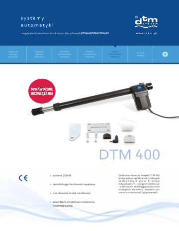 systemy automatyki www.dtm.pl napędy elektromechaniczne do bram skrzydłowych DTM400/350W/230V/IV Odbiorniki zdalnego sterowania Sterowniki do automatyki bramowej Nadajniki zdalnego sterowania Akcesoria do automatyki bramowej Napędy do automatyki bramowej Kontrola dostępu SPRAWDZONE ROZWIĄZANIA DTM 400 zasilanie 230VAC samoblokujący mechanizm napędowy tłok siłownika ze stali nierdzewnej sprawdzona konstrukcja mechanizmu rozsprzęglającego Elektromechaniczne napędy DTM 400 przeznaczone są do bram skrzydłowych użytkowanych przez klientów indywidualnych. Dostępne osobno jak i w zestawach zawierających wszystkie niezbędne elementy mechaniczne i elektroniczne w atrakcyjnych cenach. DTM 400 puszka połączeniowa, napęd DTM 400 lewy napędy elektromechaniczne do bram skrzydłowych fotokomórka fotokomórka zewnętrzna puszka połączeniowa napęd DTM 400 prawy antena, lampa sygnalizacyjna fotokomórka zewnętrzna fotokomórki fotokomórka centrala sterująca pilot DTM System min. 60mm Zalecane wymiary DTM 400 (mm) 95° 120° A 145 110 B 145 170 Wszechstronny w zastosowaniu L 1122 1122 Gdy nie jest możliwe uzyskanie wymiarów podanych w tabeli, można wyznaczyć inne wymiary: – dla otwarcia skrzydła 90° A = B (więcej w instrukcji montażu) – różnica pomiędzy wymiarami A i B musi być mniejsza od 4cm Parametry podstawowe obudowa: aluminiowa z elementami z tworzywa sztucznego zasilanie: 230VAC / 50Hz ±10% pobór prądu: 1,2A moc: 350W kondensator: 8µF klasa ochrony: IP-43 zabezpieczenie termiczne: 150°C skok siłownika / prędkość: 18mm / s siła uciągu: 2200N prędkość obrotowa silnika: 1400obr. / min intensywność pracy: 35% / h (21 cykli / h) temperatrura pracy (min / max): -25°C / 60°C waga: 5kg Napędy DTM 400 przeznaczone do bram skrzydłowych o długości skrzydła do 4m, użytkowanych przez klientów indywidualnych i małe firmy. Łatwa instalacja i malowana ciemna obudowa pozwala szybko i estetycznie wkomponować automatykę bramy w istniejące lub tworzone otoczenie. Napędy zasilane napięciem 230VAC dostępne osobno jak i w zestawach zawierających wszystkie niezbędne elementy mechaniczne i elektroniczne w atrakcyjnych cenach. Solidny i pewny w działaniu Aluminiowa konstrukcja napędów i galwanizowane akcesoria montażowe gwarantują solidność i estetykę w każdych warunkach atmosferycznych, w temperaturze od -25°C do 60°C. Opatentowany system Screw Lock System - SLS i samoblokujący mechanizm napędowy zwalnia instalatora ze stosowania dodatkowych zamków w bramie. Smarowanie smarem stałym pozwala uniknąć dodatkowych zabiegów konserwacyjnych, a odblokowywany kluczykiem mechanizm sprzęgła umożliwia ręczną obsługę bramy w przypadku awarii lub braku zasilania. Przykładowy zestaw DTM 400 DTM400 (lewy i prawy) Dopuszczalne parametry skrzydła bramy szerokość: do 4m ciężar: do 250kg systemy automatyki NEO4-P SLIM II EASY B232 EASY RX DTM System, ul. Brzeska 7, 85-145 Bydgoszcz tel./fax +48 52 340 15 83, e-mail: [email protected] www.dtm.pl
