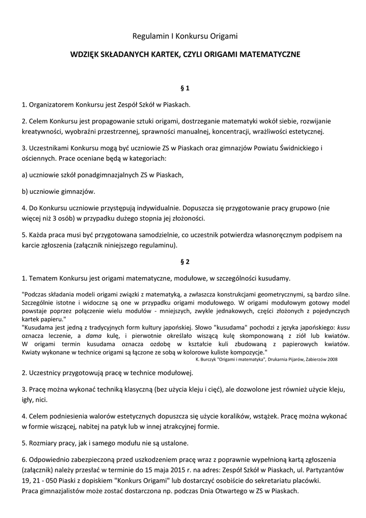 Regulamin I Konkursu Origami WDZIĘK SKŁADANYCH KARTEK, CZYLI ORIGAMI MATEMATYCZNE §1 1. Organizatorem Konkursu jest Zespół Szkół w Piaskach. 2. Celem Konkursu jest propagowanie sztuki origami, dostrzeganie matematyki wokół siebie, rozwijanie kreatywności, wyobraźni przestrzennej, sprawności manualnej, koncentracji, wrażliwości estetycznej. 3. Uczestnikami Konkursu mogą być uczniowie ZS w Piaskach oraz gimnazjów Powiatu Świdnickiego i ościennych. Prace oceniane będą w kategoriach: a) uczniowie szkół ponadgimnazjalnych ZS w Piaskach, b) uczniowie gimnazjów. 4. Do Konkursu uczniowie przystępują indywidualnie. Dopuszcza się przygotowanie pracy grupowo (nie więcej niż 3 osób) w przypadku dużego stopnia jej złożoności. 5. Każda praca musi być przygotowana samodzielnie, co uczestnik potwierdza własnoręcznym podpisem na karcie zgłoszenia (załącznik niniejszego regulaminu). §2 1. Tematem Konkursu jest origami matematyczne, modułowe, w szczególności kusudamy. "Podczas składania modeli origami związki z matematyką, a zwłaszcza konstrukcjami geometrycznymi, są bardzo silne. Szczególnie istotne i widoczne są one w przypadku origami modułowego. W origami modułowym gotowy model powstaje poprzez połączenie wielu modułów - mniejszych, zwykle jednakowych, części złożonych z pojedynczych kartek papieru." "Kusudama jest jedną z tradycyjnych form kultury japońskiej. Słowo "kusudama" pochodzi z języka japońskiego: kusu oznacza leczenie, a dama kulę, i pierwotnie określało wiszącą kulę skomponowaną z ziół lub kwiatów. W origami termin kusudama oznacza ozdobę w kształcie kuli zbudowaną z papierowych kwiatów. Kwiaty wykonane w technice origami są łączone ze sobą w kolorowe kuliste kompozycje." K. Burczyk "Origami i matematyka", Drukarnia Pijarów, Zabierzów 2008 2. Uczestnicy przygotowują pracę w technice modułowej. 3. Pracę można wykonać techniką klasyczną (bez użycia kleju i cięć), ale dozwolone jest również użycie kleju, igły, nici. 4. Celem podniesienia walorów estetycznych dopuszcza się użycie koralików, wstążek. Pracę można wykonać w formie wiszącej, nabitej na patyk lub w innej atrakcyjnej formie. 5. Rozmiary pracy, jak i samego modułu nie są ustalone. 6. Odpowiednio zabezpieczoną przed uszkodzeniem pracę wraz z poprawnie wypełnioną kartą zgłoszenia (załącznik) należy przesłać w terminie do 15 maja 2015 r. na adres: Zespół Szkół w Piaskach, ul. Partyzantów 19, 21 - 050 Piaski z dopiskiem "Konkurs Origami" lub dostarczyć osobiście do sekretariatu placówki. Praca gimnazjalistów może zostać dostarczona np. podczas Dnia Otwartego w ZS w Piaskach. 7. Każdy uczestnik (osoba, grupa) może złożyć maksymalnie 3 prace. Każda z nich będzie oceniana oddzielnie. 8. Prace powinny zostać dostarczone z podpisem (imię, nazwisko, wiek, klasa, szkoła) na oddzielnej kartce w sposób nie budzący wątpliwości, co do jej identyfikacji. Dodatkowo uczestnicy zobowiązani są dołączyć oświadczenie dotyczące ochrony danych osobowych i autorskich (wg załącznika). 9. Do każdej przesłanej pracy uczestnicy zobowiązani są dołączyć oświadczenie dotyczące ochrony danych osobowych i autorskich wg załącznika do tego regulaminu. §3 1. W Konkursie zostaną przyznane nagrody rzeczowe i dyplomy. 2. Komisja Konkursowa podczas oceny będzie brała pod uwagę: zgodność z tematem, złożoność pracy, estetykę wykonania (precyzja zgięć, dobór barw, papieru), oryginalność i atrakcyjność wizualną. 3. W skład Komisji Konkursowej wejdą nauczyciele (2 osoby) ZS w Piaskach wraz z uczniami (3 osoby) niebiorącymi udziału w Konkursie. 4. Rozstrzygnięcie Konkursu nastąpi 22 maja br. 5. Uroczyste podsumowanie Konkursu, wręczenie nagród i dyplomów odbędzie się w Zespole Szkół w Piaskach w terminie podanym przez organizatora wraz z ogłoszeniem wyników na stronie www.zspiaski.pl. 6. Lista nagrodzonych uczestników wraz ze zdjęciami prac zostanie zamieszczona na stronie organizatora ( www.zspiaski.pl). 7. Każdy uczestnik Konkursu, składając pracę, zgadza się na zamieszczenie jej zdjęcia na stronie internetowej placówki wraz z podaniem danych osobowych. §4 1. Kartę zgłoszenia wypełnia uczestnik z załączeniem podpisanych przez opiekunów prawnych oświadczeń (wg załącznika). 2. Nadesłane prace przechodzą na własność organizatora. 3. Wszelkie pytania prosimy kierować na adres: [email protected] 4. Laureaci wraz z opiekunami organizują we własnym zakresie dojazd do ZS w Piaskach na rozdanie nagród. 5. Administrowanie danych osobowych uczestników konkursu przez organizatora odbywać sie będzie wyłącznie w celach związanych z konkursem. Organizator zastrzega sobie prawo do publikowania danych osobowych uczestników zawartych w Karcie Zgłoszenia (za wyjątkiem telefonów i adresów).