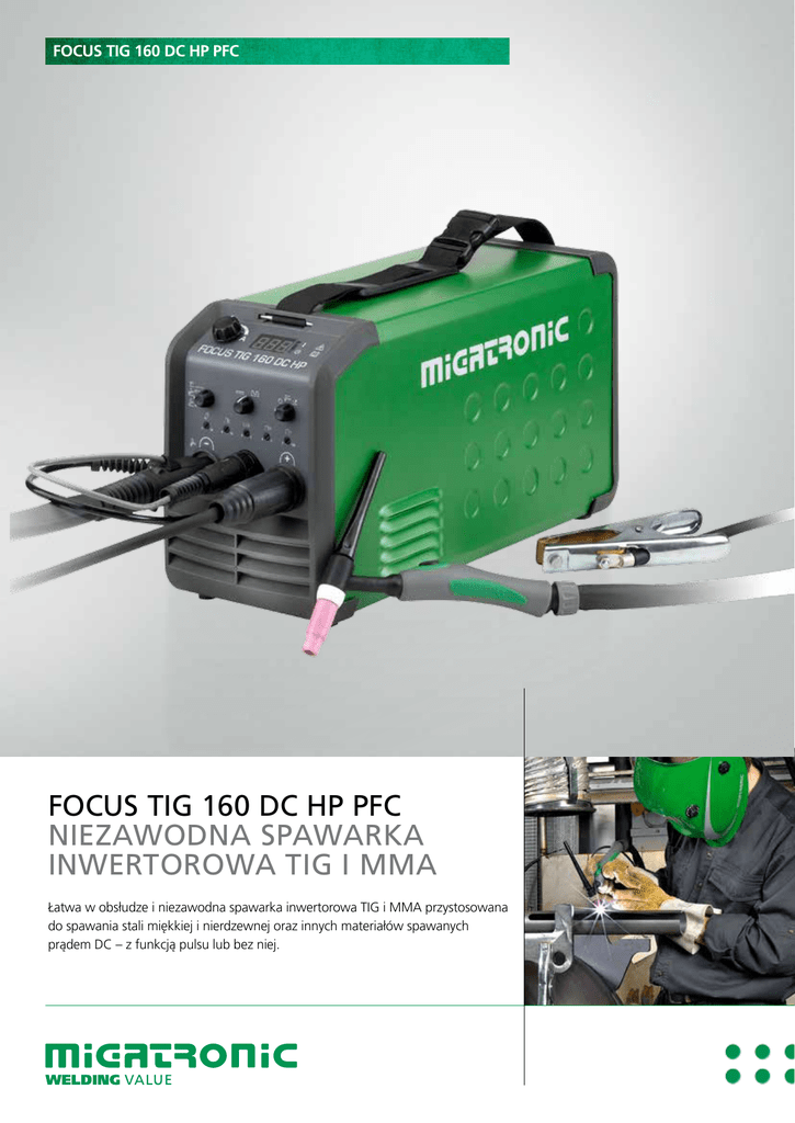 FOCUS TIG 160 DC HP PFC FOCUS TIG 160 DC HP PFC NIEZAWODNA SPAWARKA INWERTOROWA TIG I MMA Łatwa w obsłudze i niezawodna spawarka inwertorowa TIG i MMA przystosowana do spawania stali miękkiej i nierdzewnej oraz innych materiałów spawanych prądem DC – z funkcją pulsu lub bez niej. FOCUS TIG 160 DC HP PFC FOCUS TIG 160 DC HP PFC IDEALNY DO WYKONYWANIA WSZELKICH NAPRAW Focus TIG 160 DC HP to jednofazowa (230 V) spawarka inwertorowa. Łatwość obsługi i elastyczność czynią ją idealnym urządzeniem do spawania montażowego oraz warsztatowego. Panel sterowania dla Focus TIG 160 DC HP PFC Focus TIG 160 DC HP PFC jest idealny do wykonywania wszelkich napraw Jest ona najmniejszą spawarką DC TIG Migatronic z funkcją spawania łukiem pulsującym. Funkcja ta zapewnia lepszą kontrolę jeziorka, w zczególności podczas spawania w różnych pozycjach oraz spawania cienkich blach. Zajarzenie HF/LIFTIG (z wysoką częstotliwością lub bez niej) sprawia, że spawarka może być wykorzystywana w dowolnych warunkach roboczych. Spawarka Focus TIG 160 DC HP jest wyposażona w funkcję PFC (Korekcji Współczynnika Mocy). PFC to elektryczny obwód zapewniający maksymalne wykorzystanie mocy i minimalną jej utratę, umożliwiający spawanie prądem o ok. 25% większym przy użyciu bezpieczników sieciowych 16 A. Nowa technologia zapewnia okno tolerancji napięcia sieciowego od -40 do +10 %, pozwalające na spawanie przy użyciu długich prze-wodów sieciowych lub generatora jako źródła zasilania. Focus TIG 160 DC HP jest wyposażona w elektrody wolframowe MIGA Super Blue, które mają zastosowanie do wszystkich rodzajów materiałów i charakteryzują się znakomitymi parametrami zajarzenia i ponownego zajarzenia. WYPOSAŻENIE STANDARDOWE • Palnik TIG Ergo 201, wąż 4 m • Kabel uziemiający 3 m PRZYKŁADOWE WYPOSAŻENIE DODATKOWE • Solidny wózek z uchwytem na butlę (78857031) • Układ sterowania prądem dla palnika TIG • Uchwyt elektrody, kabel 3 m • Przyłbica spawalnicza Focus² ADF (81910599) • Pasek do przenoszenia • Wtyczka 16 A Schuko ŹRÓDŁO ZASILANIA FOCUS TIG 160 DC PFC Napięcie sieciowe 1x230 -40/+10% Bezpiecznik, A 16 Cykl pracy 40°C 100%, A/V 110/14,4 Cykl pracy 40°C 60%, A/V 130/25,2 Napięcie jałowe, V 75 Zakres prądu, A 10-160 Klasa ochrony IP 23S Norma EN/IEC60974-1, EN/IEC60974-3, EN/IEC60974-10 Wymiary wys. x szer. x dł., mm 250x180x470 Ciężar, kg 10,7 Migatronic A/S Aggersundvej 33 DK-9690 Fjerritslev, Denmark Tel: (+45) 96 500 600 Telefax: (+45) 96 500 601 migatronic.com 52303049 (22.08.16) Zastrzegamy sobie prawo do wprowadzenia zmian.