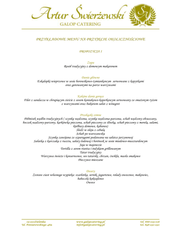 PRZYKŁADOWE MENU NA PRZYJĘCIE OKOLICZNOŚCIOWE PROPOZYCJA I Zupa Rosół tradycyjny z domowym makaronem Danie główne Eskalopki wieprzowe w sosie borowikowo-tymiankowym serwowane z kopytkami oraz gotowanymi na parze warzywami Kolejne danie gorące Filet z sandacza w chrupiącym cieście z sosem koniakowo-koperkowym serwowany ze smażonym ryżem z warzywami oraz bukietem sałat z winegret Przekąski zimne Półmisek wędlin tradycyjnych ( szynka wędzona, szynka wędzona-parzona, schab wędzony obsuszany, boczek wędzony-parzony, karkówka pieczona, schab pieczony ze śliwką, schab pieczony z morelą, salami, kiełbasy domowe, kabanos) Śledź w oleju z cebulą Schab po warszawsku Szynka zawijana ze szparagami podawana na sałatce jarzynowej Sałatka z kurczaka z rusztu, sałaty lodowej i borówek w sosie miodowo-musztardowym Jaja w majonezie Tortilla z serem risotta i indykiem grillowanym Tatar tradycyjny Warzywa świeże i konserwowe, sos tatarski, chrzan, ćwikła, masła smakowe Pieczywo mieszane Desery Zestaw ciast własnego wypieku: szarlotka, sernik, jogurtowe, rolady owocowe, makowiec, babeczki koktajlowe Owoce 05-220Zielonka Ul. Poniatowskiego 46a www.galopcatering.pl [email protected] tel. 668-023-018 tel. 696-230-230 PRZYKŁADOWE MENU NA PRZYJĘCIE OKOLICZNOŚCIOWE PROPOZYCJA II Zupa Rosół z gęsi z pierożkami mięsnymi Krem ze świeżych pomidorów z kluseczkami bazyliowymi Danie główne Polędwiczki szpikowane rydzami , zapiekane w bekonie z sosem pieczeniowym, serwowane z ziemniakami i modrą kapustą w jabłuszku Deser Gruszka duszona w szodonie podawana z sosem karmelowym Kolejne danie gorące Fileciki z indyka zapiekane z prażoną brzoskwinią i żółtym serem serwowane z łódeczkami ziemniaczanymi Filet z łososia pieczony w sosie cytrynowo-maślanym, ryż smażony z warzywami oraz bukiet sałat z winegret Przekąski Półmisek wędlin tradycyjnych oraz wiejskich (szynka wędzona, szynka wędzona-parzona, schab wędzony obsuszany, boczek wędzony-parzony, karkówka pieczona, schab pieczony ze śliwką, schab pieczony z morelą, salami, kiełbasy domowe, kabanos, kaszanka, salceson, kiełbasa pieprzowa, pasztet wieprzowy) Różyczki z łososia wędzonego na zimno podawane na placuszkach z cukinii skropione kwaśną śmietaną Indyk pieczony w miodzie i malinach Szczupak faszerowany w galarecie Carpaccio z polędwicy wołowej Sałatka z makaronu sojowego i paluszków krabowych Sałatka cesarska ( zestaw sałat, kurczak grillowany, sos czosnkowy, płatki parmezanu) Roladki z cukinii z serem i marynowanymi pomidorami Warzywa świeże i konserwowe, sos tatarski, chrzan, ćwikła, masła smakowe Pieczywo mieszane Desery Zestaw ciast własnego wypieku: szarlotka, sernik, jogurtowe, rolady owocowe, makowiec, babeczki koktajlowe Owoce żelowane Musy wielosmakowe Torty bezowe 05-220Zielonka Ul. Poniatowskiego 46a www.galopcatering.pl [email protected] tel. 668-023-018 tel. 696-230-230 Podane menu jest propozycją i zawsze zostanie dostosowane do Państwa oczekiwań. Na Państwa życzenie możemy przygotować propozycję menu jarskiego, wegetariańskiego bądź bezglutenowego. Podane oferty zawierają Transport sprzętu cateringowego i dań na terenie Warszawy i okolic Podstawowe dekoracje z elementów stałych Obsługę kucharską Dodatkowe koszty stanowią Wynajęcie sprzętu cateringowego (stoły bufetowe i koktajlowe, obrusy, porcelana, sztućce, wyposażenie bufetowe etc.) Obsługa kelnerska przyjęcia Jeżeli chcieliby Państwo wzbogacić swoje przyjęcie o inne elementy, za dodatkową opłatą proponujemy : Tort Welcome dirnk Organizację baru z napojami zimnymi, gorącymi oraz alkoholem Dekorację kwiatową Prezenciki dla Gości Oraz inne pozycje z naszej oferty specjalnej Mamy nadzieję, iż nasza oferta spotka się z Państwa oczekiwaniami. Pragniemy jednocześnie zaznaczyć, że jesteśmy elastyczni podczas negocjacji i postaramy się jak najdokładniej dopasować naszą ofertę do Państwa potrzeb i możliwości. Z wyrazami szacunku, Zespół Galop Catering Zakaz kopiowania i powielania w części lub w całości bez zgody firmy Artur Świerżewski Galop Catering. 05-220Zielonka Ul. Poniatowskiego 46a www.galopcatering.pl [email protected] tel. 668-023-018 tel. 696-230-230