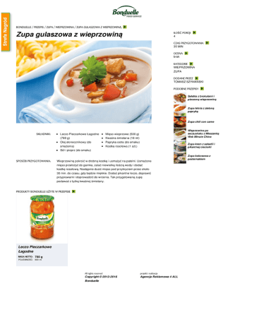 BONDUELLE / PRZEPIS / ZUPA / WIEPRZOWINA / ZUPA GULASZOWA Z WIEPRZOWINĄ Zupa gulaszowa z wieprzowiną ILOŚĆ PORCJI 4 CZAS PRZYGOTOWANIA 35 MIN OCENA brak KATEGORIE WIEPRZOWINA ZUPA DODANE PRZEZ TOMASZ SZYMAŃSKI PODOBNE PRZEPISY Sałatka z brokułami i pieczoną wieprzowiną Zupa letnia z zieloną papryką Zupa chili con carne SKŁADNIKI: Leczo Pieczarkowe Łagodne (780 g) Mięso wieprzowe (500 g) Kwaśna śmietana (18 ml) Olej słonecznikowy (do smażenia) Papryka ostra (do smaku) Kostka rosołowa (1 szt.) Wieprzowina po seczuańsku z Mieszanką Wok Minute China Zupa krem z salsefii i pikantnej cieciorki Sól i pieprz (do smaku) SPOSÓB PRZYGOTOWANIA: Wieprzowinę pokroić w drobną kostkę i usmażyć na patelni. Usmażone mięso przełożyć do garnka, zalać niewielką ilością wody i dodać kostkę rosołową. Następnie dusić mięso pod przykryciem przez około 30 min. do czasu, gdy będzie miękkie. Dodać pikantne leczo, doprawić przyprawami i doprowadzić do wrzenia. Tak przygotowaną zupę podawać z łyżką kwaśnej śmietany. PRODUKTY BONDUELLE UŻYTE W PRZEPISIE Leczo Pieczarkowe Łagodne MASA NETTO: 780 g POJEMNOŚĆ: 800 ml All rights reserved projekt i realizacja Copyright © 2012-2016 Bonduelle Agencja Reklamowa 4 ALL Zupa kokosowa z pasternakiem