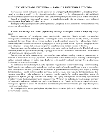 LXVI OLIMPIADA FIZYCZNA – ZADANIA ZAWODÓW I STOPNIA Rozwiazania zadań I stopnia należy przesyłać do Okregowych Komitetów Olimpiady Fizy˛ ˛ cznej w terminach: cześć ˛ I – do 14 października b.r., cześć ˛ II – do 18 listopada b.r. O kwalifikacji do zawodów II stopnia bedzie decydować suma punktów uzyskanych za rozwiazania zadań cześci ˛ ˛ ˛ I i II. Przed wysłaniem rozwiazań prosimy o zarejestrowanie si e na stronie internetowej ˛ ˛ http://www.kgof.edu.pl/rejestracja. Szczegóły dotyczace ˛ regulaminu oraz organizacji Olimpiady można znaleźć na stronie internetowej http://www.kgof.edu.pl. Krótka informacja na temat poprawnej redakcji rozwiazań zadań Olimpiady Fizy˛ cznej Zadania powinny być rozwiazane jasno, przejrzyście i czytelnie. Każde zadanie powinno być ˛ rozwiazane na oddzielnej kartce papieru. Poszczególne etapy rozumowania należy opisać, a wszelkie ˛ zależności fizyczne, które nie sa˛ wprost podane w podrecznikach szkolnych — udowodnić. Należy ˛ również objaśnić wszelkie oznaczenia wystepuj zadań. Rysunki moga˛ być wyko˛ ace ˛ w rozwiazaniach ˛ nane odrecznie — musza˛ być jednak przejrzyste i czytelne oraz dobrze opisane w tekście. ˛ Rozumowanie przedstawione w rozwiazaniach nie może zawierać luk logicznych. Każdy krok rozu˛ mowania powinien być zwie˛źle opisany, a przyjete ˛ założenia — klarownie uzasadnione. Rozwlekłość jest uznawana za ujemna˛ ceche˛ pracy. Rozwiazanie zadania teoretycznego powinno być poprzedzone analiza˛ problemu poruszanego w ˛ zadaniu, a zakończone dyskusja˛ wyników. Rozwiazania zadań teoretycznych powinny odnosić sie˛ do ˛ ogólnej sytuacji opisanej w treści, dane liczbowe (o ile zostały podane) powinny być podstawione dopiero do ostatecznych wzorów. W zadaniach doświadczalnych należy wyraźnie rozgraniczyć cześci ˛ teoretyczna˛ i doświadczalna. ˛ Cześć ˛ teoretyczna zadania doświadczalnego powinna zawierać analize˛ problemu wraz z wyprowadzeniem niezbednych wzorów (o ile nie ma ich wprost w podrecznikach szkolnych) oraz sugestie˛ metody ˛ ˛ doświadczalnej. Cześć ˛ doświadczalna powinna zawierać m.in. opis układu doświadczalnego ilustrowany rysunkiem, opis wykonanych pomiarów, wyniki pomiarów, analize˛ czynników mogacych ˛ wpływać na wyniki (jak np. rozpraszanie energii lub opory wewnetrzne mierników), opracowanie ˛ wyników wraz z dyskusja˛ niepewności pomiarowych. Wykresy do zadania doświadczalnego powinny być starannie wykonane, najlepiej na papierze milimetrowym. Ocenie podlegaja˛ wyłacznie elementy ˛ rozwiazania opisane w pracy. W zadaniach doświadczalnych osobno oceniana jest cześć ˛ ˛ teoretyczna i cześć ˛ doświadczalna. W rozwiazaniach można posługiwać sie˛ dowolnym układem jednostek, chyba że tekst zadania ˛ mówi wyraźnie inaczej. 1 CZE˛ŚĆ II (termin wysyłania rozwiazań – 18 listopada 2016 r.) ˛ Uwaga: Rozwiazanie każdego zadania powinno być napisane na oddzielnym arkuszu ˛ papieru podaniowego. Na każdym arkuszu należy umieścić identyfikator otrzymany w trakcie rejestracji oraz nazwisko i imie˛ autora pracy. Na pierwszym arkuszu pracy dodatkowo należy podać adres e-mail autora pracy oraz nazwe˛ i adres szkoły. Osoby, które chca˛ być poinformowane listownie o wynikach kwalifikacji, do pracy powinny dołaczyć ˛ zaadresowana˛ do siebie koperte˛ z naklejonym znaczkiem. ZADANIA TEORETYCZNE Należy przesłać rozwiazania trzech (i tylko trzech) dowolnie wybranych zadań teo˛ retycznych. Za każde z trzech zadań można otrzymać maksimum 20 punktów. Zadanie T1 Rys. 1. Stan poczatkowy rozważanego układu desek. Rysunek nie uwzglednia faktu, że pierwsza ˛ ˛ deska jest długa. Deska o masie m1 , długości L1 oraz grubości d, gdzie L1 ≫ d, ma jeden koniec ściety ˛ pod o katem 45 . Deska ta jest poczatkowo oparta o druga˛ deske˛ o grubości również d i masie m2 , ˛ ˛ spoczywajac ˛ a˛ na poziomym stole — tak jak przedstawiono to na rysunku. Wyznacz końcowa˛ predkość drugiej deski. ˛ Pomiń tarcie i inne opory ruchu. Moment bezwładności cienkiego preta osi prostopadłej do niego ˛ o długości l i masie m wzgledem ˛ 1 2 i przechodzacej ˛ przez jego środek masy wynosi 12 ml . Zadanie T2 Kondensator płaski składa sie˛ z dwóch prostokatnych metalowych okładek o wymiarach ˛ a × b, miedzy którymi znajduje si e jednorodny dielektryk o stałej dielektrycznej równej εr . Odległość ˛ ˛ miedzy okładkami wynosi d, przy czym d ≪ a oraz d ≪ b. Kondensator naładowano pewnym ˛ ładunkiem i położono na równi pochyłej o kacie b sa˛ poziome. Górna ˛ nachylenia α, tak że krawedzie ˛ okładka kondensatora nie jest przymocowana i może ślizgać sie˛ bez tarcia po dielektryku. W stanie równowagi ta okładka była przesunieta dolnej okładki i dielektryka o x, przy czym x ≫ d ˛ wzgledem ˛ — patrz rysunek. 2 Rys. 2. Kondensator na równi pochyłej Wiedzac, ˛ że masa górnej okładki wynosi m, wyznacz ładunek, którym był naładowany kondensator. Pomiń możliwość przechylenia sie˛ górnej okładki dla x > a/2. Dolna okładka i dielektryk sa˛ nieruchome wzgledem równi. ˛ Jako wskazówke˛ możesz wykorzystać rozwiazanie zadania 3. z finału LXV Olimpiady Fizycznej. ˛ Zadanie T3 Cześć ˛ klimatyzatorów ma możliwość pracy w trybie grzania, gdy otoczenie budynku jest zimniejsze od jego wnetrza. W tym trybie klimatyzator działa jako pompa ciepła: pobiera ciepło z otoczenia, ˛ chłodzac i oddaje ciepło do ogrzewanego pomieszczenia, pobierajac ˛ powietrze na zewnatrz, ˛ ˛ przy tym energie˛ elektryczna˛ (jego elementy wykonuja˛ w tym procesie prace). ˛ Rozważmy pracujacy ˛ w tym trybie klimatyzator, którego moc grzania wynosi PG . W skali Celsjusza temperatura zewnetrznych ˛ (grzałki) elementów klimatyzatora (chłodnicy) wynosi tz , a temperatura elementów wewnetrznych ˛ to tw . a) Wyznacz mi