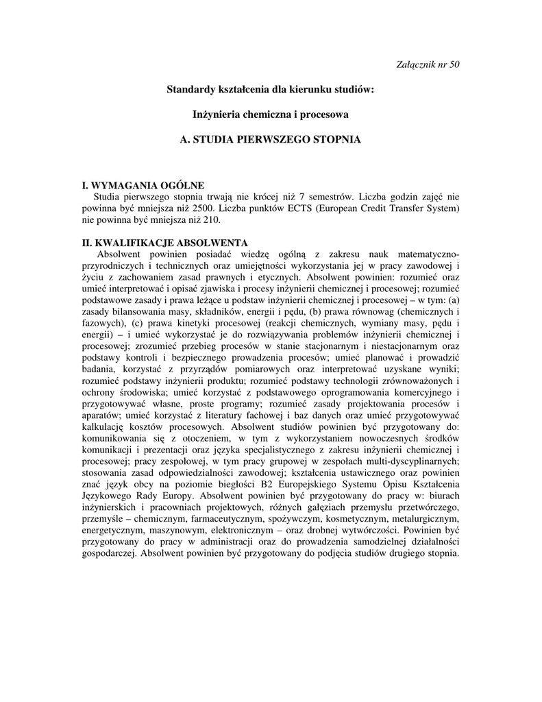 Zał cznik nr 50 Standardy kształcenia dla kierunku studiów: In ynieria chemiczna i procesowa A. STUDIA PIERWSZEGO STOPNIA I. WYMAGANIA OGÓLNE Studia pierwszego stopnia trwaj nie krócej ni 7 semestrów. Liczba godzin zaj nie powinna by mniejsza ni 2500. Liczba punktów ECTS (European Credit Transfer System) nie powinna by mniejsza ni 210. II. KWALIFIKACJE ABSOLWENTA Absolwent powinien posiada wiedz ogóln z zakresu nauk matematycznoprzyrodniczych i technicznych oraz umiej tno ci wykorzystania jej w pracy zawodowej i yciu z zachowaniem zasad prawnych i etycznych. Absolwent powinien: rozumie oraz umie interpretowa i opisa zjawiska i procesy in ynierii chemicznej i procesowej; rozumie podstawowe zasady i prawa le ce u podstaw in ynierii chemicznej i procesowej – w tym: (a) zasady bilansowania masy, składników, energii i p du, (b) prawa równowag (chemicznych i fazowych), (c) prawa kinetyki procesowej (reakcji chemicznych, wymiany masy, p du i energii) – i umie wykorzysta je do rozwi zywania problemów in ynierii chemicznej i procesowej; zrozumie przebieg procesów w stanie stacjonarnym i niestacjonarnym oraz podstawy kontroli i bezpiecznego prowadzenia procesów; umie planowa i prowadzi badania, korzysta z przyrz dów pomiarowych oraz interpretowa uzyskane wyniki; rozumie podstawy in ynierii produktu; rozumie podstawy technologii zrównowa onych i ochrony rodowiska; umie korzysta z podstawowego oprogramowania komercyjnego i przygotowywa własne, proste programy; rozumie zasady projektowania procesów i aparatów; umie korzysta z literatury fachowej i baz danych oraz umie przygotowywa kalkulacj kosztów procesowych. Absolwent studiów powinien by przygotowany do: komunikowania si z otoczeniem, w tym z wykorzystaniem nowoczesnych rodków komunikacji i prezentacji oraz j zyka specjalistycznego z zakresu in ynierii chemicznej i procesowej; pracy zespołowej, w tym pracy grupowej w zespołach multi-dyscyplinarnych; stosowania zasad odpowiedzialno ci zawodowej; kształcenia ustawicznego oraz powinien zna j zyk obcy na poziomie biegło ci B2 Europejskiego Systemu Opisu Kształcenia J zykowego Rady Europy. Absolwent powinien by przygotowany do pracy w: biurach in ynierskich i pracowniach projektowych, ró nych gał ziach przemysłu przetwórczego, przemy le – chemicznym, farmaceutycznym, spo ywczym, kosmetycznym, metalurgicznym, energetycznym, maszynowym, elektronicznym – oraz drobnej wytwórczo ci. Powinien by przygotowany do pracy w administracji oraz do prowadzenia samodzielnej działalno ci gospodarczej. Absolwent powinien by przygotowany do podj cia studiów drugiego stopnia. III. RAMOWE TRE CI KSZTAŁCENIA 1. GRUPY TRE CI KSZTAŁCENIA, MINIMALNA LICZBA GODZIN ZAJ ZORGANIZOWANYCH ORAZ MINIMALNA LICZBA PUNKTÓW ECTS A. GRUPA TRE CI PODSTAWOWYCH B. GRUPA TRE CI KIERUNKOWYCH Razem godziny 360 600 960 ECTS 36 60 96 2. SKŁADNIKI TRE CI KSZTAŁCENIA W GRUPACH, MINIMALNA LICZBA GODZIN ZAJ ZORGANIZOWANYCH ORAZ MINIMALNA LICZBA PUNKTÓW ECTS A. GRUPA TRE CI PODSTAWOWYCH Tre ci kształcenia w zakresie: 1. Matematyki 2. Fizyki 3. Chemii B. GRUPA TRE CI KIERUNKOWYCH Tre ci kształcenia w zakresie: 1. Przenoszenia i bilansowania masy, p du i energii 2. Operacji i procesów jednostkowych 3. Maszyn i aparatów przemysłu chemicznego 4. Grafiki in ynierskiej 5. Informatyki i programowania 6. Elektrotechniki i elektroniki 7. Podstaw automatyki i miernictwa przemysłowego 8. In ynierii rodowiska 9. Technologii chemicznej 10. Podstaw in ynierii produktu godziny ECTS 360 36 150 60 150 600 60 3. TRE CI I EFEKTY KSZTAŁCENIA A. GRUPA TRE CI PODSTAWOWYCH 1. Kształcenie w zakresie matematyki Tre ci kształcenia: Elementy teorii zbiorów i logiki matematycznej. Ci gi i szeregi liczbowe. Algebra liniowa. Elementy rachunku ró niczkowego i całkowego. Geometria analityczna. Analiza wektorowa. Równania ró niczkowe zwyczajne. Zagadnienia optymalizacji. Elementy statystyki matematycznej. Podstawy metod numerycznych. Wybrane metody analizy matematycznej, równania ró niczkowe cz stkowe liniowe. Teoria funkcji zmiennej zespolonej, przekształcenia Laplace’a. Podstawowy rachunku wariacyjnego. Efekty kształcenia – umiej tno ci i kompetencje: korzystania z metod matematycznych w in ynierii chemicznej i procesowej; opisu matematycznego procesów fizycznych i chemicznych; konstruowania modeli matematycznych; rozwi zywania równa metodami analitycznymi i numerycznymi. 2. Kształcenie w zakresie fizyki Tre ci kształcenia: Podstawy mechaniki klasycznej (newtonowskiej). Elementy mechaniki relatywistycznej. Fale i zjawiska falowe. Podstawy fizyki statystycznej. Podstawy 2 termodynamiki fenomenologicznej. Elektryczno i magnetyzm. Elektronowe wła ciwo ci materii, przewodnictwo elektryczne. Magnetyczne wła ciwo ci materii. Klasyczna teoria pola elektromagnetycznego. Podstawy mechaniki kwantowej. Elementy fizyki atomu. Elementy fizyki ciała stałego. Fizyka j dra atomowego i cz stek elementarnych. Efekty kształcenia – umiej tno ci i kompetencje: rozumienia zjawisk fizycznych w przyrodzie i technice; pomiaru i wyznaczania podstawowych wielko ci fizycznych. 3. Kształcenie w zakresie chemii Tre ci kształcenia: Budowa materii. Układ okresowy pierwiastków. Podstawowe poj cia i prawa chemii. Wi zania chemiczne. Podstawy oblicze stechiometrycznych. Roztwory. Elektrolity. Zwi zki nieorganiczne – metody otrzymywania, wła ciwo ci. Budowa, klasyfikacja i nazewnictwo zwi zków organicznych. Główne typy reakcji z udziałem zwi zków organicznych – substytucja, addycja i eliminacja. Otrzymywanie i własno ci: w glowodorów, poł cze chloroorganicznych, alkoholi, fenoli, kwasów organicznych, aldehydów, ketonów, amin, amidów, aminokwasów, kwasów tłuszczowych, białek, cukrów, tłuszczów. Podstawy projektowania syntez organicznych. Rozwi zania równania Schrödingera dla atomu wodoru i cz steczki H2+. Metody obliczeniowe chemii kwantowej. Zastosowania chemii kwantowej do optymalizacji geometrii i wyznacza