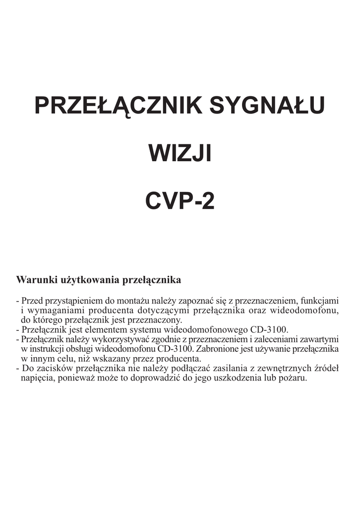 PRZE£¥CZNIK SYGNA£U WIZJI CVP-2 Warunki u¿ytkowania prze³¹cznika - Przed przyst¹pieniem do monta¿u nale¿y zapoznaæ siê z przeznaczeniem, funkcjami i wymaganiami producenta dotycz¹cymi prze³¹cznika oraz wideodomofonu, do którego prze³¹cznik jest przeznaczony. - Prze³¹cznik jest elementem systemu wideodomofonowego CD-3100. - Prze³¹cznik nale¿y wykorzystywaæ zgodnie z przeznaczeniem i zaleceniami zawartymi w instrukcji obs³ugi wideodomofonu CD-3100. Zabronione jest u¿ywanie prze³¹cznika w innym celu, ni¿ wskazany przez producenta. - Do zacisków prze³¹cznika nie nale¿y pod³¹czaæ zasilania z zewnêtrznych róde³ napiêcia, poniewa¿ mo¿e to doprowadziæ do jego uszkodzenia lub po¿aru. Przeznaczenie Prze³¹cznik CVP-2 przeznaczony jest do cyfrowego systemu domofonowego CD-3100. Prze³¹cznik umo¿liwia pod³¹czenie czterech paneli zewnêtrznych do jednej kasety elektroniki EC-3100 obs³uguj¹cej wejcia g³ówne lub wejcia podrzêdne. Wejcie C4+, C4- zarezerwowane jest dla sygna³u przychodz¹cego z bramy g³ównej. Je¿eli brama g³ówna nie wystêpuje wejcie to mo¿na wykorzystaæ do pod³¹czenia czwrtego panela zewnêtrznego. W prze³¹czniku znajduj¹ siê z³¹cza konfiguracyjne, za pomoc¹ których mo¿na ustawiæ wartoci impedancji wejciowej i wyjciowej. Ustawione wartoci powinny odpowiadaæ impedancji przewodu u¿ytego do wykonania po³¹czeñ. Prze³¹cznik pe³ni tez rolê wzmacniacza sygna³u. Wartoæ wzmocnienia, podobnie jak impedancjê ustawia siê jumperami (JP3). Monta¿ prze³¹cznika. Prze³¹cznik nale¿y zamontowaæ w skrzynce instalacyjnej, lub na cianie wewn¹trz budynku. W tym celu nale¿y wykrêciæ cztery wkrêty mocuj¹ce pokrywê obudowy do jej podstawy. Po zdjêciu pokrywy wykonaæ w podstawie otwory pod wkrêty mocuj¹ce (W1, W2, rys.2), wywierciæ w cianie otwory pod ko³ki rozporowe i przykrêciæ podstawê do ciany. Pod³¹czyæ przewody do zacisków ARK w prze³¹czniku, w pokrywie obudowy wy³amaæ szczypcami zalepki w miejscach, w których do obudowy zostan¹ wprowadzone przewody i przykrêciæ pokrywê do podstawy. Oznaczenie zacisków CS V+ VLM LL+ X+,XY+,YC1+,C1C2+,C2C3+,C3C4+,C4- wybór wejcia wideo zasilanie prze³¹cznika (+) zasilanie prze³¹cznika (-) linia LM linia L+ linia Lwyjcie sygna³u wizji wyjcie sygna³u wizji wejcie wideo wejcie wideo wejcie wideo wejcie wideo Szczegó³owe informacje dotycz¹ce monta¿u i eksploatacji prze³¹cznika znajduj¹ siê w instrukcji obs³ugi wideodomofonu, do którego wykorzystywany jest prze³¹cznik. -2- Korekcja sygna³u (z³¹cze JP3) W1 W³¹czona X CSA V+ G LM L+ L- - Wy³¹czona Y + - + JP7 JP6 Wzmocnienie (z³¹cze JP3) brak +4 dB +2 dB JP3 JP1 JP2 + - C1 JP4 JP5 - - C2 C3 + + - Impedancja wyjciowa wyjcia X (JP6) 136 124 100 C4 W2 Impedancja wyciowa wyjcia Y (JP7) 100 Stopieñ ochrony dla prze³¹cznika- IP 30 124 136 Impedancja wej. wejæ C1...C4 (JP1, JP2, JP4,JP5) 136 124 Rys. 1. Prze³¹cznik sygna³u wideo CVP-2 -3- 100 WSKAZÓWKI DOTYCZ¥CE OCHRONY RODOWISKA WSKAZÓWKI DOTYCZCE OCHRONY kosza, RODOWISKA Produkt zosta³ oznaczony symbolem przekrelonego zgodnie z europejsk¹ dyrektyw¹ 2002/96/WE o zu¿ytym sprzêcie elektrycznym i elektronicznym. Po jego zu¿yciu lub zakoñczeniu u¿ytkowania nie mo¿e byæ umieszczony wraz z innymi, zwyk³ymi odpadami pochodz¹cymi z gospodarstw domowych. U¿ytkownik produktu jest zobowi¹zany do oddania go prowadz¹cym zbieranie zu¿ytego sprzêtu elektrycznego i elektronicznego, jak lokalne zbiórki, sklepy, punkty wytypowane przez producenta oraz odpowiednie gminne jednostki zbierania odpadów. Lista punktów zbierania zu¿ytego sprzêtu firmy LASKOMEX dostêpna jest na www.laskomex.com.pl lub pod nr telefonicznym 42 671 88 68. Opakowanie produktu nale¿y usuwaæ zgodnie z przepisami ochrony rodowiska. Pamiêtaj! Selektywne przekazywanie do utylizacji zu¿ytego sprzêtu elektrycznego i elektronicznego znacznie przyczynia siê do ochrony zdrowia i ¿ycia ludzi oraz ochrony rodowiska naturalnego. Zwrot materia³ów opakowaniowych do obiegu materia³owego oszczêdza surowce i zmniejsza powstawanie odpadów. V 1.4 (2011-10-11) ul. D¹browskiego 249, 93-231 £ód, tel. (0-42) 671 88 00, fax 671 88 88 e-mail: [email protected], http://www.laskomex.com.pl