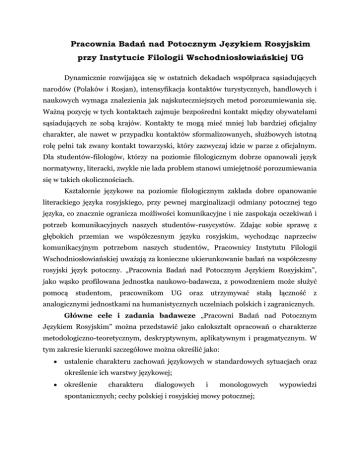 Pracownia Badań nad Potocznym Językiem Rosyjskim przy Instytucie Filologii Wschodniosłowiańskiej UG Dynamicznie rozwijająca się w ostatnich dekadach współpraca sąsiadujących narodów (Polaków i Rosjan), intensyfikacja kontaktów turystycznych, handlowych i naukowych wymaga znalezienia jak najskuteczniejszych metod porozumiewania się. Ważną pozycję w tych kontaktach zajmuje bezpośredni kontakt między obywatelami sąsiadujących ze sobą krajów. Kontakty te mogą mieć mniej lub bardziej oficjalny charakter, ale nawet w przypadku kontaktów sformalizowanych, służbowych istotną rolę pełni tak zwany kontakt towarzyski, który zazwyczaj idzie w parze z oficjalnym. Dla studentów-filologów, którzy na poziomie filologicznym dobrze opanowali język normatywny, literacki, zwykle nie lada problem stanowi umiejętność porozumiewania się w takich okolicznościach. Kształcenie językowe na poziomie filologicznym zakłada dobre opanowanie literackiego języka rosyjskiego, przy pewnej marginalizacji odmiany potocznej tego języka, co znacznie ogranicza możliwości komunikacyjne i nie zaspokaja oczekiwań i potrzeb komunikacyjnych naszych studentów-rusycystów. Zdając sobie sprawę z głębokich przemian we współczesnym języku rosyjskim, wychodząc naprzeciw komunikacyjnym potrzebom naszych studentów, Pracownicy Instytutu Filologii Wschodniosłowiańskiej uważają za konieczne ukierunkowanie badań na współczesny rosyjski język potoczny. „Pracownia Badań nad Potocznym Językiem Rosyjskim”, jako wąsko profilowana jednostka naukowo-badawcza, z powodzeniem może służyć pomocą studentom, pracownikom UG oraz utrzymywać stałą łączność z analogicznymi jednostkami na humanistycznych uczelniach polskich i zagranicznych. Główne cele i zadania badawcze „Pracowni Badań nad Potocznym Językiem Rosyjskim” można przedstawić jako całokształt opracowań o charakterze metodologiczno-teoretycznym, deskryptywnym, aplikatywnym i pragmatycznym. W tym zakresie kierunki szczegółowe można określić jako: ustalenie charakteru zachowań językowych w standardowych sytuacjach oraz określenie ich warstwy językowej; określenie charakteru dialogowych i monologowych spontanicznych; cechy polskiej i rosyjskiej mowy potocznej; wypowiedzi ustalenie charakteru komunikacyjnego niepełności form fonetycznych, morfologicznych, syntaktycznych w mowie potocznej i ich wypełnienie poprzez konsytuację wypowiedzi; zebranie korpusu zapisów (pisemnych i audialnych) różnego rodzaju wypowiedzi spontanicznych oraz określenie zasobu i charakteru leksyki tych wypowiedzi odniesienie zebranych materiałów do pragmatyki komunikacji; opracowania o charakterze glottodydaktycznym, bezpośrednio odnoszącym się do procesu akwizycji rosyjskiej mowy potocznej w toku studiów filologicznych. W ramach prac Pracowni zaplanowano (2013 – 2016): prowadzenie prac, mających na celu utworzenie i aktualizowanie potocznej bazy leksykalnej o szerokim zakresie tematycznym; badanie zachowań językowych użytkowników języka rosyjskiego i polskiego w określonych sytuacjach; zebranie korpusu zapisów (pisemnych i audialnych) z różnych źródeł – Narodowy Korpus Języka Rosyjskiego, wywiady spontaniczne, tele show, czaty, fora i inne; opracowywanie podręcznika współczesnego potocznego języka rosyjskiego, którego zakres tematyki będzie obejmował sytuacje standardowe i będzie w pełni dostosowany do potrzeb i zainteresowań studentów; przygotowanie i opracowanie zbioru dialogów naturalnych, opartych na aktualnym słownictwie potocznym i formach niepełności wraz z pozyskanymi nagraniami (płytą CD); upowszechnianie dorobku naukowego osiągniętego w trakcie realizacji prac: a) prowadzenie kursu „Rosyjski język potoczny. Praktyczna nauka” na I roku II st. Kierunku filologia rosyjska, a także sukcesywne wprowadzanie modułu „Rosyjski język potoczny” do zajęć z praktycznej nauki języka rosyjskiego na studiach licencjackich (I stopień); b) przygotowanie artykułów naukowych, monografii poświęconych w/w zagadnieniom językowym z udziałem uznanych w Polsce i świecie autorytetów naukowych w tej dziedzinie; c) zainicjowanie cyklu lingwistycznych seminariów i konferencji międzynarodowych. 2 Skład Pracowni: dr Żanna Sładkiewicz (kierownik), prof. UG, dr hab. Marcelina Grabska, mgr Olga Jerszowa, dr Irina Lukiyanenko, dr Joanna Mampe, dr Olga Vertinskaya. Dr Żanna Sładkiewicz jest native speakerem języka rosyjskiego, specjalistą w zakresie nauk humanistycznych, dyplomowanym wykładowcą języka rosyjskiego jako obcego; posiada bogaty dorobek naukowy w szerokim zakresie lingwistycznym. Jest autorką ponad 40 publikacji naukowych z zakresu językoznawstwa słowiańskiego, komunikacji publicznej, osobowości językowych, frazeologii. Jest autorką monografii habilitacyjnej pt. Felieton polityczny w świetle teorii perswazji językowej, Gdańsk: wydawnictwo Uniwersytetu Gdańskiego, 2013. Dr Sładkiewicz była kierownikiem i głównym wykonawcą wielu grantów BW (w latach 2006, 2009, 2011, 2012). Była aktywnym członkiem Związku Polaków na Białorusi. Prof. UG, dr hab. Marcelina Grabska poza licznym dorobkiem z zakresu psycholingwistyki i glottodydaktyki w ostatnich latach kierowała szerokimi badaniami z zakresu częstotliwości leksykalnej. Badania te objęły teksty mówione, czaty, fora internetowe, a także piosenek rosyjskich w stylu rap i hip-hop. Zebrała znaczący korpus materiałów multimedialnych. Uzyskane materiały mogą stanowić bazę wyjściową dla celów badawczych i pragmatycznych. Mgr Olga Jerszowa (Olha Yershova), lektor w Instytucie Filologii Wschodniosłowiańskiej UG, jest native speakerem języka rosyjskiego, specjalistą w zakresie nauk ekonomicznych oraz rosyjskiej terminografii; zobowiązuje się pełnić funkcję konsultanta językowego i merytorycznego. Mgr Olga Jerszowa posiada doświadczenie w zakresie nauczania języka rosyj