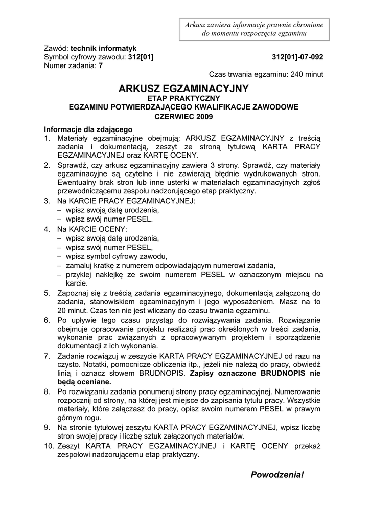 Arkusz zawiera informacje prawnie chronione do momentu rozpoczęcia egzaminu Zawód: technik informatyk Symbol cyfrowy zawodu: 312[01] Numer zadania: 7 312[01]-07-092 Czas trwania egzaminu: 240 minut ARKUSZ EGZAMINACYJNY ETAP PRAKTYCZNY EGZAMINU POTWIERDZAJĄCEGO KWALIFIKACJE ZAWODOWE CZERWIEC 2009 Informacje dla zdającego 1. Materiały egzaminacyjne obejmują: ARKUSZ EGZAMINACYJNY z treścią zadania i dokumentacją, zeszyt ze stroną tytułową KARTA PRACY EGZAMINACYJNEJ oraz KARTĘ OCENY. 2. Sprawdź, czy arkusz egzaminacyjny zawiera 3 strony. Sprawdź, czy materiały egzaminacyjne są czytelne i nie zawierają błędnie wydrukowanych stron. Ewentualny brak stron lub inne usterki w materiałach egzaminacyjnych zgłoś przewodniczącemu zespołu nadzorującego etap praktyczny. 3. Na KARCIE PRACY EGZAMINACYJNEJ: − wpisz swoją datę urodzenia, − wpisz swój numer PESEL. 4. Na KARCIE OCENY: − wpisz swoją datę urodzenia, − wpisz swój numer PESEL, − wpisz symbol cyfrowy zawodu, − zamaluj kratkę z numerem odpowiadającym numerowi zadania, − przyklej naklejkę ze swoim numerem PESEL w oznaczonym miejscu na karcie. 5. Zapoznaj się z treścią zadania egzaminacyjnego, dokumentacją załączoną do zadania, stanowiskiem egzaminacyjnym i jego wyposażeniem. Masz na to 20 minut. Czas ten nie jest wliczany do czasu trwania egzaminu. 6. Po upływie tego czasu przystąp do rozwiązywania zadania. Rozwiązanie obejmuje opracowanie projektu realizacji prac określonych w treści zadania, wykonanie prac związanych z opracowywanym projektem i sporządzenie dokumentacji z ich wykonania. 7. Zadanie rozwiązuj w zeszycie KARTA PRACY EGZAMINACYJNEJ od razu na czysto. Notatki, pomocnicze obliczenia itp., jeżeli nie należą do pracy, obwiedź linią i oznacz słowem BRUDNOPIS. Zapisy oznaczone BRUDNOPIS nie będą oceniane. 8. Po rozwiązaniu zadania ponumeruj strony pracy egzaminacyjnej. Numerowanie rozpocznij od strony, na której jest miejsce do zapisania tytułu pracy. Wszystkie materiały, które załączasz do pracy, opisz swoim numerem PESEL w prawym górnym rogu. 9. Na stronie tytułowej zeszytu KARTA PRACY EGZAMINACYJNEJ, wpisz liczbę stron swojej pracy i liczbę sztuk załączonych materiałów. 10. Zeszyt KARTA PRACY EGZAMINACYJNEJ i KARTĘ OCENY przekaż zespołowi nadzorującemu etap praktyczny. Powodzenia! Zadanie egzaminacyjne Do serwisu komputerowego wpłynęło od klienta zlecenie usunięcia usterek systemu komputerowego opisanych w Załączniku 1. Opracuj projekt realizacji prac prowadzących do lokalizacji i usunięcia zgłoszonych usterek systemu komputerowego. Wykonaj prace obejmujące lokalizację i usunięcie usterek. Wydrukuj zrzuty z ekranu komputera dokumentujące usunięcie zidentyfikowanych usterek. Wydruki podpisz swoim numerem PESEL. Sformułuj wnioski o poprawności działania systemu komputerowego po wykonaniu prac. Projekt realizacji prac powinien zawierać: 1. Tytuł pracy egzaminacyjnej. 2. Założenia wynikające z treści zadania i załączonej dokumentacji. 3. Listę prawdopodobnych przyczyn usterki systemu komputerowego na podstawie opisu objawów. 4. Wykaz działań związanych ze zlokalizowaniem i usunięciem usterki komputera. Dokumentacja z wykonania prac powinna zawierać: 1. Rejestr kolejno wykonywanych czynności w postaci wydruku podpisanych zrzutów z ekranu, prezentujących wykonywane w systemie działania w trakcie lokalizacji i usunięcia usterek. 2. Wnioski o poprawności działania systemu komputerowego po wykonaniu prac. UWAGA: Zrzuty opisane numerem PESEL zapisz na pulpicie komputera w folderze opisanym również numerem PESEL. Dla zapewnienia czytelności dokonanych zrzutów zamieść nie więcej niż dwa zrzuty z ekranu na kartce A4 o orientacji pionowej, każdy zrzut o szerokości kartki A4. Do wykonania zadania wykorzystaj: Opis objawów świadczących o nieprawidłowym działaniu komputera i informacje o jego użytkowaniu – Załącznik 1 Płytę CD z nagranymi dokumentami użytkownika i programem 7-ZIP – Załącznik 2 Do opracowania projektu realizacji prac przygotowano biurko do pisania, a do lokalizacji i usunięcia usterki systemu komputerowego przygotowano stanowisko komputerowe z odpowiednio przygotowanym komputerem oraz płyty CD: z programem Acrobat Reader, sterownikami urządzeń wchodzących w skład serwisowanego komputera (płyta główna, karta sieciowa, graficzna, muzyczna) i dokumentacją elektroniczną do BIOS SETUP komputera. Czas przeznaczony na wykonanie zadania wynosi 240 minut. Załącznik 1 Opis objawów świadczących o nieprawidłowym działaniu komputera i informacje o jego użytkowaniu Objawy: Użytkownik komputera korzystając z własnego konta księgowa nie może skopiować do folderu Moje dokumenty pliku podatki.rar z płyty CD, pojawia się komunikat Błąd kopiowania pliku lub folderu. Próba otwarcia pliku bezpośrednio z płyty CD także kończy się niepowodzeniem, pojawia się komunikat System Windows nie może otworzyć tego pliku. Płyta CD została sprawdzona na innym komputerze i bez problemu można plik skopiować, a także otworzyć. Plik o nazwie podatki.rar zawiera dokumenty w formacie PDF, są to akty prawne dotyczące podatków. Użytkownikowi zależy, aby dokumenty te znalazły się w folderze Moje dokumenty i można było je otworzyć. Użytkownik już wcześniej próbował otwierać dokumenty PDF, ale bez powodzenia. Dodatkowo użytkownik poprosił o odpowiednie skonfigurowanie systemu tak, aby istniała możliwość zapisania w folderze Moje dokumenty przynajmniej 10 GB danych. Informacje dodatkowe przekazane przez klienta: 1. Komputer na co dzień jest wykorzystywany w księgowości małej firmy. 2. W chwili naprawy komputer jest odłączony od Internetu i od sieci lokalnej. 3. Na dysku zainstalowane jest oprogramowanie systemowe Windows (w wersji 2000 Professional lub XP Professional – klient nie był w stanie określić dokładnie wersji systemu) oraz oprogramowanie uży