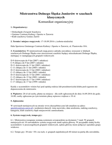 Mistrzostwa Dolnego Śląska Juniorów w szachach klasycznych Komunikat organizacyjny 1. Organizatorzy: • Dolnośląski Związek Szachowy • Gminne Centrum Kultury i Sportu w Żarowie • Klub szachowy Goniec Żarów 2. Termin i miejsce rozgrywek: 17-18.09.2016 r, (sobota-niedziela) Hala Sportowa Gminnego Centrum Kultury i Sportu w Żarowie, ul. Piastowska 10A. 3. Uczestnictwo: W mistrzostwach mają prawo udziału zawodnicy zrzeszeni w klubach szachowych Dolnego Śląska oraz niezrzeszeni szachiści będący mieszkańcami Dolnego Śląska, startujący w następujących grupach wiekowych: D-9 dziewczęta do 9 lat (2007 i młodsze) C-9 chłopcy do 9 lat (2007 i młodsi) D-11 dziewczęta do 11 lat (2005 i młodsze) C-11 chłopcy do 11 lat (2005 i młodsi) D-13 dziewczęta do 13 lat (2003 i młodsze) C-13 chłopcy do 13 lat (2003 i młodsi) D-15 dziewczęta do 15 lat (2001 i młodsze) C-15 chłopcy do 15 lat (2001 i młodsi) D-17 dziewczęta do 17 lat (1999 i młodsze) C-17 chłopcy do 17 lat (1999 i młodsi) Każdy z uczestników winien być pod opieką rodzica lub przedstawiciela klubu pod rygorem nie dopuszczenia do mistrzostw. 4. Wpisowe: 20 zł od osoby, płatne na miejscu - dla osób zgłoszonych do dnia 16.09.2016 do godz. 16.00, osoby zgłoszone po tym terminie płacą wpisowe większe o 10 zł. 5. Zgłoszenia: W serwisach turniejowych na stronie www.chessarbiter.com lub emailem na adres: [email protected] z podaniem danych: imię nazwisko, data urodzenia, ranking szachowy, kategoria, klub szachowy bądź miejscowość zamieszkania. 6. System rozgrywek, tempo gry: 6.1. Mistrzostwa rozegrane zostaną systemem szwajcarskim na dystansie 7 rund. W grupach mniejszych niż 10 zawodników system rozgrywek ustali sędzia główny. W przypadku małej liczby uczestników w poszczególnych grupach wiekowych, sędzia główny może połączyć sąsiednie grupy wiekowe. 6.2. Tempo gry: 30 min +30 s na ruch, w grupach najmłodszych 60 minut na partię dla zawodnika. 6.3. Obowiązuje zapis partii. Za zgodą sędziego głównego z obowiązku zapisu partii mogą być zwolnieni najmłodsi uczestnicy, na indywidualny wniosek zawodnika (opiekuna), ale wtedy zawodnik otrzymuje połowę czasu do namysłu. 6.4. W zawodach obowiązuje zakaz składania propozycji remisowych i przyjmowania ich przed wykonaniem pierwszych 30 posunięć. 6.5. O kolejności zajętych miejsc decyduje suma zdobytych punktów, a w przypadku równości, punktacja pomocnicza, w następującej kolejności: system Buchholtza uśredniony, system Buchholza pełny, progress, liczba zwycięstw, losowanie. W turnieju kołowym: Berger, Koya, liczba zwycięstw, bezpośrednie pojedynki, losowanie. 6.6. Zawodnik może się spóźnić na rundę maksymalnie 15 min., na rundę V – 30 minut – decyduje czas który upłyną na zegarze. 6.7. Zawodnicy, którzy grali swoje partie pełne 2 godziny mają prawo do 5 min. przerwy. 7. Harmonogram turnieju. 17.09.2016 sobota 8:00 - 9.15 - Przyjęcie uczestników (potwierdzenie udziału) 9.30 - Uroczyste otwarcie mistrzostw 9.35 - 11.35 I runda 11.40 - 13.40 II runda 13.40 - 14.30 przerwa obiadowa 14.35 - 16.35 III runda 16.40 - 18.40 IV runda 18.09.2016 niedziela 9.00 - 11.00 V runda 11.05 - 13.05 VI runda 13.10 - 14.10 przerwa obiadowa 14.15 - 16.15 VII runda 16.30 - Uroczyste zakończenie mistrzostw 8. Nagrody: Zwycięzcy grup otrzymają puchar, medal i dyplom, zawodnicy z miejsce II – III medale i dyplomy. Dodatkowo przewidziane są nagrody rzeczowe i finansowe dla najlepszych zawodników w zależności od ilości startujących osób w poszczególnej kategorii wiekowej. Szczegółowy fundusz nagród podany będzie podczas turnieju. Najlepszy chłopiec i najlepsza dziewczynka do lat 8 zdobywają prawo do wyjazdu na Międzynarodowe Mistrzostwa Niemiec do lat 8 w Sebnitz. 9. Zakwaterowanie i wyżywienie we własnym zakresie. W trakcie trwania mistrzostw (sobota, niedziela) istnieje możliwość wykupienia obiadów na stołówce w Gimnazjum (200 m obok sali gry) w cenie 10 zł za zestaw (zupa + drugie danie). Zakwaterowanie w Żarowie: „ŻAR-MED”, ul. Słowackiego 6, 58-130 Żarów Dla osób biorących udział w Mistrzostwach zakwaterowanie wraz ze śniadaniem i kolacją wynosi 65 zł od osoby za dobę (pokoje 3–4 osobowe). www.zar-med.pl, tel./fax 74 858 03 99. Rezerwacja zakwaterowania do 13.09.2016. 10. Sprawy organizacyjne i inne: - sprzęt szachowy zapewnia organizator - na hali będzie czynna kawiarnia - ostateczna interpretacja komunikatu należy do organizatora - kierownik turnieju: Artur Adamek, tel. 693 931 778 - bezpośrednio po zakończeniu ostatnich partii w grupach do lat 9 odbędzie się zebranie rodziców dzieci wyjeżdżających do Sebnitz - zawodnicy ubezpieczają się we własnym zakresie.