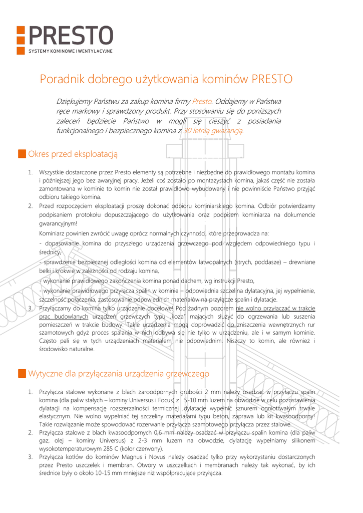 Poradnik dobrego użytkowania kominów PRESTO Dziękujemy Państwu za zakup komina firmy Presto. Oddajemy w Państwa ręce markowy i sprawdzony produkt. Przy stosowaniu się do poniższych zaleceń będziecie Państwo w mogli się cieszyć z posiadania funkcjonalnego i bezpiecznego komina z 30 letnią gwarancją. Okres przed eksploatacją 1. Wszystkie dostarczone przez Presto elementy są potrzebne i niezbędne do prawidłowego montażu komina i późniejszej jego bez awaryjnej pracy. Jeżeli coś zostało po montażystach komina, jakaś część nie została zamontowana w kominie to komin nie został prawidłowo wybudowany i nie powinniście Państwo przyjąć odbioru takiego komina. 2. Przed rozpoczęciem eksploatacji proszę dokonać odbioru kominiarskiego komina. Odbiór potwierdzamy podpisaniem protokołu dopuszczającego do użytkowania oraz podpisem kominiarza na dokumencie gwarancyjnym! Kominiarz powinien zwrócić uwagę oprócz normalnych czynności, które przeprowadza na: - dopasowanie komina do przyszłego urządzenia grzewczego pod względem odpowiedniego typu i średnicy, - sprawdzenie bezpiecznej odległości komina od elementów łatwopalnych (strych, poddasze) – drewniane belki i krokwie w zależności od rodzaju komina, - wykonanie prawidłowego zakończenia komina ponad dachem, wg instrukcji Presto, 3. - wykonanie prawidłowego przyłącza spalin w kominie – odpowiednia szczelina dylatacyjna, jej wypełnienie, szczelność połączenia, zastosowanie odpowiednich materiałów na przyłącze spalin i dylatacje. Przyłączamy do komina tylko urządzenie docelowe! Pod żadnym pozorem nie wolno przyłączać w trakcie prac budowlanych urządzeń grzewczych typu „koza” mających służyć do ogrzewania lub suszenia pomieszczeń w trakcie budowy. Takie urządzenia mogą doprowadzić do zniszczenia wewnętrznych rur szamotowych gdyż proces spalania w nich odbywa się nie tylko w urządzeniu, ale i w samym kominie. Często pali się w tych urządzeniach materiałem nie odpowiednim. Niszczy to komin, ale również i środowisko naturalne. Wytyczne dla przyłączania urządzenia grzewczego 1. 2. 3. Przyłącza stalowe wykonane z blach żaroodpornych grubości 2 mm należy osadzać w przyłączu spalin komina (dla paliw stałych – kominy Universus i Focus) z 5-10 mm luzem na obwodzie w celu pozostawienia dylatacji na kompensację rozszerzalności termicznej ,dylatację wypełnić sznurem ogniotrwałym trwale elastycznym. Nie wolno wypełniać tej szczeliny materiałami typu beton, zaprawa lub kit kwasoodporny! Takie rozwiązanie może spowodować rozerwanie przyłącza szamotowego przyłącza przez stalowe. Przyłącza stalowe z blach kwasoodpornych 0,6 mm należy osadzać w przyłączu spalin komina (dla paliw gaz, olej – kominy Universus) z 2-3 mm luzem na obwodzie, dylatację wypełniamy silikonem wysokotemperaturowym 285 C (kolor czerwony). Przyłącza kotłów do kominów Magnus i Novus należy osadzać tylko przy wykorzystaniu dostarczonych przez Presto uszczelek i membran. Otwory w uszczelkach i membranach należy tak wykonać, by ich średnice były o około 10-15 mm mniejsze niż współpracujące przyłącza. 4. Należy stosować odpowiednią kompensację na długich stalowych czopuchach (uwaga dla paliw stałych – kominy Universus i Focus)) w celu wyeliminowania ich wydłużania, czopuch nie może przenosić żadnych sił na trójnik komina. Nie przestrzeganie tego zalecenia może spowodować wyrwanie przyłącza spalin z rur komina podczas jego użytkowania. Wytyczne podczas eksploatacji 1. 2. 3. 4. 5. Rozgrzewanie nowo wybudowanego komina powinno odbywać się dopiero po jego całkowitym wyschnięciu!, tzn. musimy mieć pewność, że w ściankach rur szamotowych jest zawarta niewielka ilość wilgoci. To zostanie zagwarantowane, jeżeli komin będzie wystarczająco długo w średniej temperaturze większej niż 15 °C (przez 2-3 tygodnie). Przy pierwszym rozruchu, niskich temperaturach otoczenia lub dłuższej przerwie komin należy rozgrzewać powoli, z max prędkością do 50°C/h. Prosimy zawsze uwzględniać wskazówki w instrukcji obsługi współpracującego paleniska! Uwaga ta dotyczy kominów współpracujących z urządzeniami na paliwo stałe – drewno, węgiel. Należy stosować tylko paliwa dopuszczone do stosowania przez producenta paleniska. Stosowanie paliw niedopuszczalnych (np. drewno lakierowane, płyty wiórowe, itp.) lub przyspieszaczy (olej opałowy, olej napędowy, itp.), oprócz szkód środowiskowych, może także prowadzić do zniszczenia lub uszkodzenia paleniska i systemu odprowadzania gazów spalinowych, z powodu przeciążenia termicznego! (dotyczy kominów Universus i Focus). W piecykach współpracujących z kominami typu Universus lub Focus może być spalane jedynie suche ( poniżej 20% wilgotności) pocięte drewno. Osiąga się to przez jego wietrzenie i ochronę przed opadami przez okres 2 lat ( w zależności od gatunku drewna i sposobu sezonowania okres ten może być krótszy lub dłuższy). Jeżeli będzie spalane wilgotne drewno, mogą wystąpić szkody w piecu i w urządzeniu oddającym spaliny – następuje również podwyższona emisja materiałów szkodliwych oraz podwyższone zużycie drewna. Na właścicielu obiektu spoczywają obowiązki w utrzymania jego sprawności technicznej w zakresie bezpieczeństwa życia, zdrowia ludzi, mienia lub środowiska, a w szczególności zabezpieczenie przed katastrofą budowlaną, pożarem, wybuchem, porażeniem prądem albo zatruciem gazem. Dlatego w obiektach, w których odbywa się proces spalania paliwa stałego, ciekłego lub gazowego należy usuwać zanieczyszczenia w przewodach dymowych, spalinowych i wentylacyjnych według poniższych zasad: - od palenisk opalanych paliwem stałym – co najmniej cztery razy w roku; · - od palenisk opalanych paliwem płynnym i gazowym – co najmniej dwa razy w roku. - zanieczyszczenia z przewodów wentylacyjnych, co najmniej
