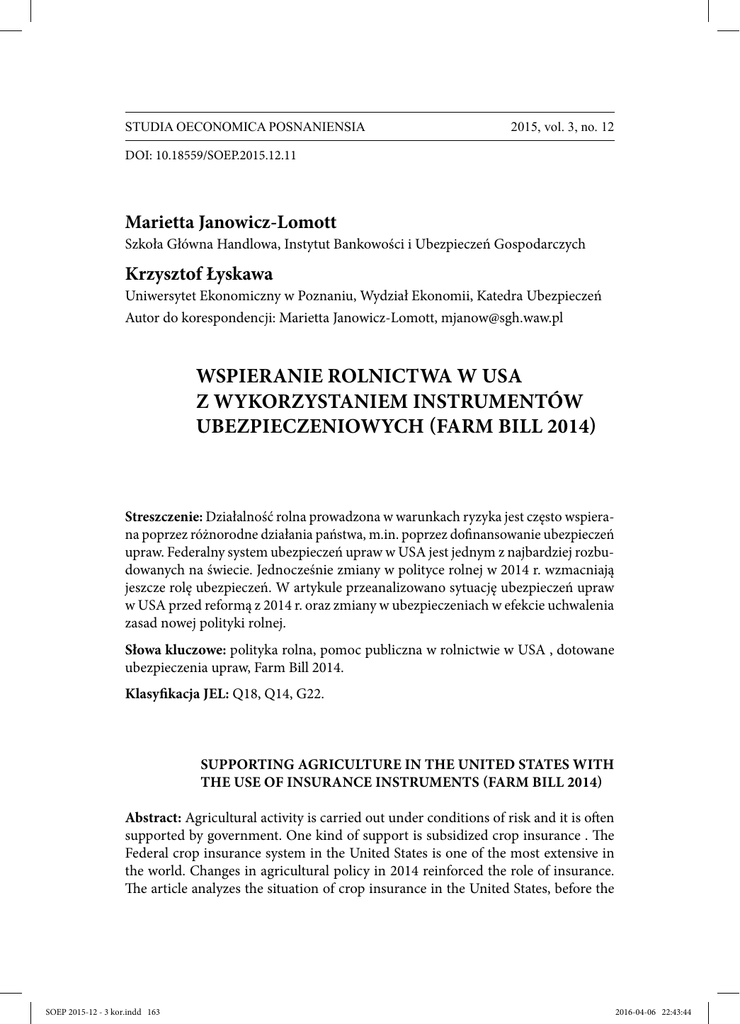 STUDIA OECONOMICA POSNANIENSIA 2015, vol. 3, no. 12 DOI: 10.18559/SOEP.2015.12.11 Marietta Janowicz-Lomott Szkoła Główna Handlowa, Instytut Bankowości i Ubezpieczeń Gospodarczych Krzysztof Łyskawa Uniwersytet Ekonomiczny w Poznaniu, Wydział Ekonomii, Katedra Ubezpieczeń Autor do korespondencji: Marietta Janowicz-Lomott, [email protected] WSPIERANIE ROLNICTWA W USA Z WYKORZYSTANIEM INSTRUMENTÓW UBEZPIECZENIOWYCH (FARM BILL 2014) Streszczenie: Działalność rolna prowadzona w warunkach ryzyka jest często wspierana poprzez różnorodne działania państwa, m.in. poprzez dofinansowanie ubezpieczeń upraw. Federalny system ubezpieczeń upraw w USA jest jednym z najbardziej rozbudowanych na świecie. Jednocześnie zmiany w polityce rolnej w 2014 r. wzmacniają jeszcze rolę ubezpieczeń. W artykule przeanalizowano sytuację ubezpieczeń upraw w USA przed reformą z 2014 r. oraz zmiany w ubezpieczeniach w efekcie uchwalenia zasad nowej polityki rolnej. Słowa kluczowe: polityka rolna, pomoc publiczna w rolnictwie w USA , dotowane ubezpieczenia upraw, Farm Bill 2014. Klasyfikacja JEL: Q18, Q14, G22. SUPPORTING AGRICULTURE IN THE UNITED STATES WITH THE USE OF INSURANCE INSTRUMENTS (FARM BILL 2014) Abstract: Agricultural activity is carried out under conditions of risk and it is often supported by government. One kind of support is subsidized crop insurance . The Federal crop insurance system in the United States is one of the most extensive in the world. Changes in agricultural policy in 2014 reinforced the role of insurance. The article analyzes the situation of crop insurance in the United States, before the SOEP 2015-12 - 3 kor.indd 163 2016-04-06 22:43:44 164 Marietta Janowicz-Lomott, Krzysztof Łyskawa reform of 2014, and changes in the insurance system as a result of the adoption of the principles of the new agricultural policy. Keywords: agriculture policy, state aid in agriculture, subsidized crop insurance, Farm Bill 2014. Wstęp Gospodarka żywnościowa jest sektorem, w którym niebezpieczeństwo wystąpienia niekorzystnych zdarzeń losowych jest szczególnie wysokie. Jest to związane z faktem, że obok zdarzeń, które towarzyszą każdej działalności gospodarczej, występuje tutaj również silna zależność osiąganych wyników od mających miejsce w określonym czasie zjawisk atmosferycznych. Połączenie tej charakterystyki z innymi cechami działalności rolnej, takimi jak niemożność zmiany kierunku produkcji częściej niż raz do roku czy powszechnie spotykany rodzinny charakter prowadzonej działalności (kiedy to w zarządzanie gospodarstwem zaangażowani są wszyscy domownicy), powoduje, że ewentualne skutki nieprzewidzianych zdarzeń losowych są w rolnictwie nader odczuwalne [Klimkowski 2002]. Niezbędne zatem staje się szukanie rozwiązań ograniczających poziom ryzyka w działalności rolnej. Do działań tych zaliczają się między innymi instrumenty ubezpieczenia produkcji rolnej na wypadek zaistnienia zjawisk pogodowych powodujących znaczne straty w uprawach (a w konsekwencji w osiąganych przychodach). Jednak bardzo często państwo decyduje się na pomoc, obawiając się, że poniesione przez sektor rolny szkody mogą się przyczynić do problemów ekonomicznych oraz społecznych na obszarach wiejskich. Działania takie są uzasadnione przy zdarzeniach, których zasięg i siła jest rzeczywiście duża. Nadużywanie jednak tego rodzaju pomocy powoduje, że rolnicy przyzwyczajają się do otrzymywanego wsparcia, na skutek czego nie widzą potrzeby wykupu ubezpieczenia. Zamiast postawy zapobiegawczej (ubezpieczanie się) preferują postawę roszczeniową (pomoc rządu) [Klimkowski 2004]. Instytucje państwowe, budując politykę rolną, powinny tak tworzyć systemy bezpieczeństwa sektora rolnego, aby zamiast wsparcia bezpośredniego gospodarstw rolnych stosować strategię zachęcania do wykupu adekwatnej ochrony ubezpieczeniowej. Taka postawa już od wielu lat funkcjonuje w systemie ubezpieczenia upraw w USA. Co więcej, ostatnie zmiany w polityce rolnej USA, które wprowadza Agricultural Act of 2014 (nazywany też Farm Bill 2014), wskazują SOEP 2015-12 - 3 kor.indd 164 2016-04-06 22:43:50 Wspieranie rolnictwa w USA z wykorzystaniem instrumentów ubezpieczeniowych 165 wzmacnianie pozycji instrumentów ubezpieczeniowych w zarządzaniu ryzykiem gospodarstw rolnych, szczególnie w zakresie ubezpieczeń upraw. Celem niniejszego artykułu jest analiza instrumentów ubezpieczeniowych zastosowanych w polityce rolnej USA. W artykule wskazano ewolucję polityki ubezpieczeniowej rządu amerykańskiego dla rolnictwa, której efektem są dziś nowatorskie rozwiązania w zakresie ubezpieczeń rolnych. W Europie i w Polsce coraz więcej dyskutuje się obecnie o wprowadzeniu elastycznych programów ubezpieczeniowych, których zadaniem byłoby pokrywanie strat w plonie czy dochodzie (np. na bazie rozwiązań indeksowych). Pogłębiona analiza systemu amerykańskich ubezpieczeń rolnych może wskazać rozwiązania, które choćby częściowo mogą stanowić wzorce dla rozwiązań europejskich. Ramy teoretyczne opracowania wyznaczają akty prawne i ogólne założenia konstrukcji amerykańskich programów ubezpieczeniowych. 1. Federalny system ubezpieczenia upraw w USA – historia i stan obecny System ubezpieczeń upraw działający w gospodarce amerykańskiej jest obecnie jednym z najbardziej rozbudowanych na świecie. Federalne ubezpieczenia upraw w USA zostały wprowadzone wraz z ustawą z 1938 r. [Federal Crop Insurance 1938], na mocy której utworzono Federalną Korporację Ubezpieczeń Upraw (FCIC), działającą na poziomie ministerstwa i ubezpieczającą produkcję rolną. Już wówczas zaoferowano wieloryzykowe ubezpieczenie upraw (multi peril crop insurance, MPCI). Jednak do 1980 r. ubezpieczenia te nie pełniły istotnej roli w polityce rolnej Stanów Zjednoczonych. W efekcie w 1980 r. uchwalony został Federal Crop Adoption Act. Jego zasadniczym ce