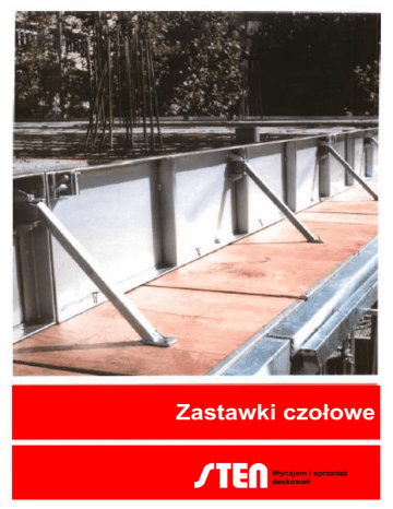 Zastawki czołowe Wynajem i sprzedaż deskowań Najlepsze rozwiązanie do deskowania krawędzi stropu Zastawki czołowe łączy się w linii prostej w celu utworzenia obwodu stropu do zabetonowania. Wielokrotne zastosowanie Oszczędność siły roboczej Dzięki bardzo łatwemu demontażowi, odzyskane zastawki w krótkim czasie można wykorzystać na kolejnym etapie budowy. Przemyślana konstrukcja elementów zastawek czołowych pozwala na montaż i demontaż w bardzo krótkim czasie. Duża żywotność i trwałość Bezpieczeństwo podczas montażu System łączenia elementów i ich kształt tworzą bezpieczną i pewną strukturę, niezależnie od pozycji montażowej. Zastawki wykonane są z wysokiej jakości oraz odpowiedniej grubości rur i blach stalowych. Ochronę antykorozyjną zapewnia cynkowanie elektrolityczne i galwanizacja. Szybki i prosty montaż i demontaż Zastawki czołowe tworzy struktura stalowa w formie ramy, do której przyspawane są arkusze blachy stalowej o grubości zapewniającej odpowiednią sztywność. Zastawka posiada podpórki przymocowane do ramy za pomocą przegubów o samo-oczyszczającej się konstrukcji. Podpórka służy do wypoziomowania i podparcia zastawki. Możliwość składania podpórek bardzo ułatwia składowanie i transport zastawek. Do łączenia zastawek czołowych pomiędzy sobą służy specjalny zamek. Mocowanie do deskowania Rama zastawki czołowej i stopa podpórki wyposażone są w otwory umożliwiające przybicie elementu do poszycia deskowania. Akcesoria optymalizujące stosowanie zastawek czołowych Możliwość zmiany wysokości zastawek czołowych Narożnik oraz kompensator wykonane ze stali, pozwalają na zmiany kierunku montażu zastawek czołowych oraz na dostosowanie długości zastawek do wymiarów stropu w szybki i prosty sposób. Otwory znajdujące się w górnej części ramy pozwalają przybić do zastawki listwę drewnianą zwiększającą wysokość. Łatwy demontaż Otwierając zamek i usuwając gwoździe można zdemontować każdą zastawkę niezależnie od pozostałych. Parametry techniczne zastawek czołowych Sten Fabryka i siedziba główna Paraje Can Rajoler C/Besós 4/ Po. Box. 87 08-150 Parets del Valles (Spain) tel.: +34 90 220-80-20 fax. +34 93 562-33-69 Kod Nazwa elementu Ciężar [kg] Długość [cm] Wysokość [cm] 6010 Zastawka 1 m x 30 cm 11 100 30 6020 Zastawka 2 m x 30 cm 19,5 200 30 6013 Zastawka 1 m x 35 cm 12 100 35 6023 Zastawka 2 m x 35 cm 20 200 35 6014 Kompensator zastawki 10,5 110 30 6012 Narożnik zastawki 9 110 30 STEN Polska ul. Niepodległości 22 05-085 Kampinos tel.: +48 22 725-04-00 tel./fax.: +48 22 725-04-01 e-mail: [email protected] www.sten.es Skuteczność i bezpieczeństwo w budownictwie Sistemas Tecnicos de Encofrados S.A.