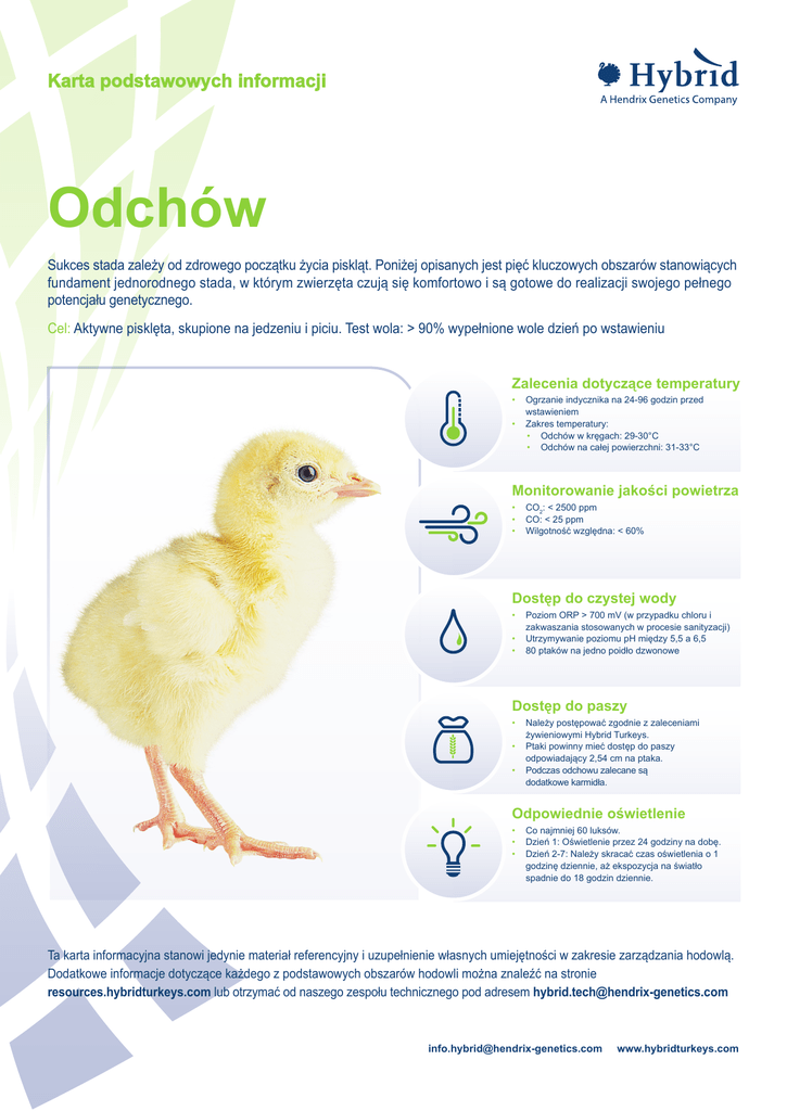 Karta podstawowych informacji Odchów Sukces stada zależy od zdrowego początku życia piskląt. Poniżej opisanych jest pięć kluczowych obszarów stanowiących fundament jednorodnego stada, w którym zwierzęta czują się komfortowo i są gotowe do realizacji swojego pełnego potencjału genetycznego. Cel: Aktywne pisklęta, skupione na jedzeniu i piciu. Test wola: > 90% wypełnione wole dzień po wstawieniu Zalecenia dotyczące temperatury • Ogrzanie indycznika na 24-96 godzin przed wstawieniem • Zakres temperatury: • Odchów w kręgach: 29-30°C • Odchów na całej powierzchni: 31-33°C Monitorowanie jakości powietrza • CO2: < 2500 ppm • CO: < 25 ppm • Wilgotność względna: < 60% Dostęp do czystej wody • Poziom ORP > 700 mV (w przypadku chloru i zakwaszania stosowanych w procesie sanityzacji) • Utrzymywanie poziomu pH między 5,5 a 6,5 • 80 ptaków na jedno poidło dzwonowe Dostęp do paszy • Należy postępować zgodnie z zaleceniami żywieniowymi Hybrid Turkeys. • Ptaki powinny mieć dostęp do paszy odpowiadający 2,54 cm na ptaka. • Podczas odchowu zalecane są dodatkowe karmidła. Odpowiednie oświetlenie • Co najmniej 60 luksów. • Dzień 1: Oświetlenie przez 24 godziny na dobę. • Dzień 2-7: Należy skracać czas oświetlenia o 1 godzinę dziennie, aż ekspozycja na światło spadnie do 18 godzin dziennie. Ta karta informacyjna stanowi jedynie materiał referencyjny i uzupełnienie własnych umiejętności w zakresie zarządzania hodowlą. Dodatkowe informacje dotyczące każdego z podstawowych obszarów hodowli można znaleźć na stronie resources.hybridturkeys.com lub otrzymać od naszego zespołu technicznego pod adresem [email protected] [email protected] www.hybridturkeys.com