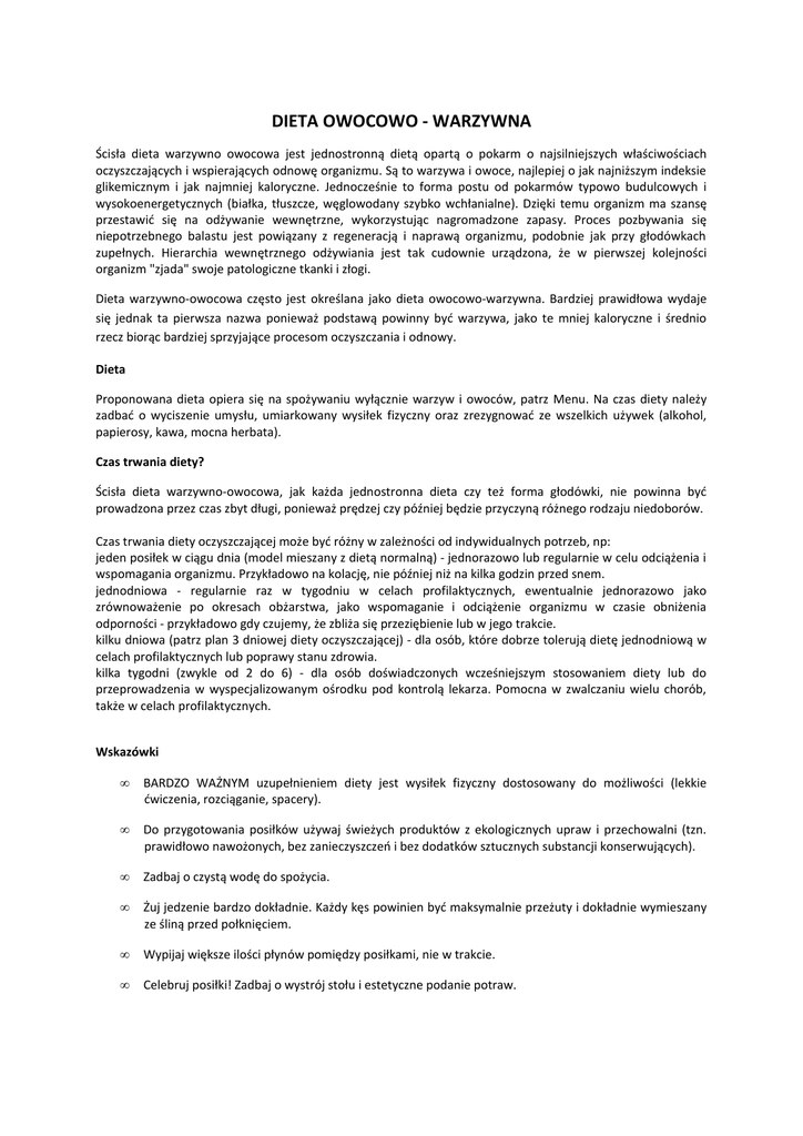 DIETA OWOCOWO - WARZYWNA Ścisła dieta warzywno owocowa jest jednostronną dietą opartą o pokarm o najsilniejszych właściwościach oczyszczających i wspierających odnowę organizmu. Są to warzywa i owoce, najlepiej o jak najniższym indeksie glikemicznym i jak najmniej kaloryczne. Jednocześnie to forma postu od pokarmów typowo budulcowych i wysokoenergetycznych (białka, tłuszcze, węglowodany szybko wchłanialne). Dzięki temu organizm ma szansę przestawić się na odżywanie wewnętrzne, wykorzystując nagromadzone zapasy. Proces pozbywania się niepotrzebnego balastu jest powiązany z regeneracją i naprawą organizmu, podobnie jak przy głodówkach zupełnych. Hierarchia wewnętrznego odżywiania jest tak cudownie urządzona, że w pierwszej kolejności organizm "zjada" swoje patologiczne tkanki i złogi. Dieta warzywno-owocowa często jest określana jako dieta owocowo-warzywna. Bardziej prawidłowa wydaje się jednak ta pierwsza nazwa ponieważ podstawą powinny być warzywa, jako te mniej kaloryczne i średnio rzecz biorąc bardziej sprzyjające procesom oczyszczania i odnowy. Dieta Proponowana dieta opiera się na spożywaniu wyłącznie warzyw i owoców, patrz Menu. Na czas diety należy zadbać o wyciszenie umysłu, umiarkowany wysiłek fizyczny oraz zrezygnować ze wszelkich używek (alkohol, papierosy, kawa, mocna herbata). Czas trwania diety? Ścisła dieta warzywno-owocowa, jak każda jednostronna dieta czy też forma głodówki, nie powinna być prowadzona przez czas zbyt długi, ponieważ prędzej czy później będzie przyczyną różnego rodzaju niedoborów. Czas trwania diety oczyszczającej może być różny w zależności od indywidualnych potrzeb, np: jeden posiłek w ciągu dnia (model mieszany z dietą normalną) - jednorazowo lub regularnie w celu odciążenia i wspomagania organizmu. Przykładowo na kolację, nie później niż na kilka godzin przed snem. jednodniowa - regularnie raz w tygodniu w celach profilaktycznych, ewentualnie jednorazowo jako zrównoważenie po okresach obżarstwa, jako wspomaganie i odciążenie organizmu w czasie obniżenia odporności - przykładowo gdy czujemy, że zbliża się przeziębienie lub w jego trakcie. kilku dniowa (patrz plan 3 dniowej diety oczyszczającej) - dla osób, które dobrze tolerują dietę jednodniową w celach profilaktycznych lub poprawy stanu zdrowia. kilka tygodni (zwykle od 2 do 6) - dla osób doświadczonych wcześniejszym stosowaniem diety lub do przeprowadzenia w wyspecjalizowanym ośrodku pod kontrolą lekarza. Pomocna w zwalczaniu wielu chorób, także w celach profilaktycznych. Wskazówki • BARDZO WAŻNYM uzupełnieniem diety jest wysiłek fizyczny dostosowany do możliwości (lekkie ćwiczenia, rozciąganie, spacery). • Do przygotowania posiłków używaj świeżych produktów z ekologicznych upraw i przechowalni (tzn. prawidłowo nawożonych, bez zanieczyszczeń i bez dodatków sztucznych substancji konserwujących). • Zadbaj o czystą wodę do spożycia. • Żuj jedzenie bardzo dokładnie. Każdy kęs powinien być maksymalnie przeżuty i dokładnie wymieszany ze śliną przed połknięciem. • Wypijaj większe ilości płynów pomiędzy posiłkami, nie w trakcie. • Celebruj posiłki! Zadbaj o wystrój stołu i estetyczne podanie potraw. • Nigdy nie jedz do uczucia pełnej sytości. Postaraj kierować się intuicją jeżeli chodzi o ustalenie ilości pożywienia i płynów. • Zadbaj o kontakt z naturą • Zadbaj o relaks psychiczny, obserwuj siebie i skup się na danej chwili. Wykonywanie prostych, codziennych czynności jak przygotowywanie posiłków, sprzątanie, praca w ogrodzie jest doskonałą drogą do wyciszenia. Na czas diety dobrze jest odciąć się na ile to możliwe od świata zewnętrznego (wyłączyć telefon, nie korzystać z poczty elektronicznej). Przed rozpoczęciem długiej diety dobrze jest wykonać serię krótkich diet. Zakończ dietę stopniowo. Okres przejściowy powinien trwać co najmniej 1/3 długości diety. Efekt diety zależy od dobrego jej zakończenia i może być całkowicie zniweczony poprzez szybki powrót do starych nawyków. W okresie przejściowym do spożywanych warzyw i owoców stopniowo dodawaj produkty z innych grup rozpoczynając od niewielkich ilości nieprzetworzonych węglowodanów, przykładowo: garść kaszy do zupy warzywnej, muesli z płatków zbożowych, brązowy ryż z owocami, pełnoziarnisty chleb z pełnego przemiału na zakwasie. W dalszej kolejności stopniowo dodajemy rośliny strączkowe (fasole, soczewice), nasiona, tłuszcze i białka. Dobrze jest również zaczynać dietę stopniowo. Zapewnienie łagodnych zmian na każdym etapie wpłynie pozytywnie na trwałość efektów diety oraz na samopoczucie w trakcie przemiany. Świeżo wyciskane soki są zdecydowanie lepszym wyborem niż soki gotowe, dostępne w sprzedaży. W przypadku gotowych soków używaj nieprzetworzonych, bez dodatku cukru. http://www.dietawarzywnoowocowa.pl