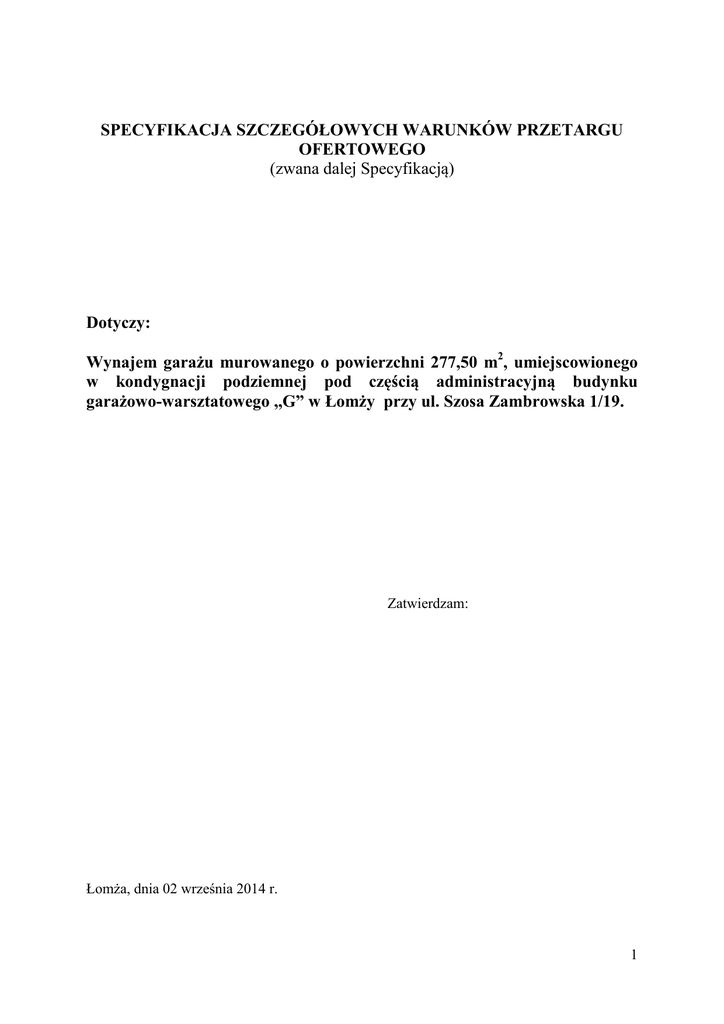 SPECYFIKACJA SZCZEGÓŁOWYCH WARUNKÓW PRZETARGU OFERTOWEGO (zwana dalej Specyfikacją) Dotyczy: Wynajem garażu murowanego o powierzchni 277,50 m2, umiejscowionego w kondygnacji podziemnej pod częścią administracyjną budynku garażowo-warsztatowego ,,G” w Łomży przy ul. Szosa Zambrowska 1/19. Zatwierdzam: Łomża, dnia 02 września 2014 r. 1 INSTRUKCJA DLA OFERENTÓW (NAJEMCÓW) ROZDZIAŁ 1. NAZWA I ADRES WYNAJMUJĄCEGO 1. Wynajmujący : Wojewódzka Stacja Pogotowia Ratunkowego Samodzielny Publiczny Zakład Opieki Zdrowotnej w Łomży. Adres: 18-400 Łomża, ul. Szosa Zambrowska 1/19, województwo podlaskie Wpisany do Krajowego Rejestru Sądowego w Sądzie Rejonowym w Białymstoku ( XII Wydział Gospodarczy) pod numerem KRS 0000059165, NIP 718 16 22 676; REGON 450192689 . tel. (86) 2166215; fax: (86) 2163063; e-mail w sprawie przetargu: [email protected] godziny urzędowania 725 – 1500 , od poniedziałku do piątku, 2. Strona internetowa Wynajmującego. Wynajmujący informuje, iż na stronie internetowej http://www.pogotowie.lomza.pl (strona główna) oraz http://bip.wsprspzozl.wrotapodlasia.pl (zakładka informacja o przetargach, poniżej 30 tys. euro), od dnia umieszczenia Ogłoszenia o przetargu do dnia upływu terminu składania ofert, udostępnia Specyfikację szczegółowych warunków przetargu ofertowego wraz ze wzorami załączników do Specyfikacji. 3. Specyfikację szczegółowych warunków przetargu ofertowego w formie drukowanej Wynajmujący udostępnia w siedzibie Wojewódzkiej Stacji Pogotowia Ratunkowego Samodzielny Publiczny Zakład Opieki Zdrowotnej, 18-400 Łomża, ul. Szosa Zambrowska 1/19, w sekretariacie pokój nr 01. ROZDZIAŁ II OPIS PRZEDMIOTU NAJMU 1. Charakterystyka techniczna przedmiotu najmu: 1) Wysokość bramy wjazdowej /250cm/ wyklucza garażowanie posiadanych pojazdów sanitarnych, garaż jest zbędny ponieważ nie może być wykorzystany zgodnie z przeznaczeniem przez WSPR SPZOZ w Łomży. 2) Garaż ma powierzchnię 277,50 m2, może pomieścić 8 samochodów osobowych. 3) Garaż jest zlokalizowany w budynku o numerze inwentarzowym I/1/83. 4) Garaż jest podpiwniczeniem części budynku, posiada oddzielny wjazd zamknięty bramą uchylną. 5) Wentylacja grawitacyjna kominowa. 6) Okna uchylne, okratowane. 7) Ogrzewanie garażu od zaizolowanych rur CO. 8) Garaż jest zlokalizowany w kondygnacji podziemnej pod częścią administracyjną budynku garażowo-warsztatowego ,,G” w Łomży przy ul. Szosa Zambrowska 1/19. 2 ROZDZIAŁ III WARUNKI NAJMU I ZAKRES ZAMÓWIENIA 1. Warunki stawiane Oferentom: 1) Do przetargu nie mogą przystąpić podmioty prowadzące działalność konkurencyjną w stosunku do Wynajmującego. 2) Garaż może być wynajęty użytkownikowi , który nie zakłóci ruchu pojazdów na terenie posesji i wyjazdu ambulansów do wezwań. 3) Garaż może być wynajęty użytkownikowi który zaakceptuje treść wzoru umowy - Załącznik nr 2 do Specyfikacji i złoży ofertę - Załącznik nr 1 do Specyfikacji, nie podlegającą odrzuceniu. 4) O udzielenie zamówienia mogą ubiegać się Oferenci, którzy spełniają wymagania określone w niniejszej Specyfikacji. 5) Oferent pozostaje związany ofertą przez okres 20 dni. Bieg terminu rozpoczyna się wraz z upływem terminu składania ofert. 6) Oferty nie spełniające wymagań określonych w Specyfikacji będą odrzucone. 2. Zakres zamówienia. Cena Wywoławcza. 1) Cena wywoławcza stawki czynszu za przedmiot najmu wynosi 2033,00 zł netto (bez podatku VAT) miesięcznie: a)oferty zawierające propozycje stawki niższej od ceny wywoławczej zostaną odrzucone. 2) Okres wynajmu: od początku miesiąca po podpisaniu umowy najmu na czas oznaczony do 3 lat. 3) Minimalny okres ofertowy najmu to 1 rok. 3. Wynajmujący nie wymaga wpłaty wadium. 4. Wynajmujący zastrzega sobie prawo unieważnienia przetargu bez podania przyczyn. 5. WSPR SPZOZ w Łomży zastrzega sobie prawo zamknięcia przetargu bez wybrania którejkolwiek z ofert lub odwołania przetargu z ważnych powodów. ROZDZIAŁ IV SPOSÓB PRZYGOTOWANIA I ZŁOŻENIA OFERTY 1. Oferty składane przez Oferentów powinny być sporządzone na Formularzu oferty – Załącznik nr 1 do Specyfikacji. Sporządzenie oferty w innej formie spowoduje jej odrzucenie. 2. Oferent ma prawo złożyć tylko jedną ofertę sam lub jako reprezentant firmy. Oferent, który przedłoży więcej niż jedną ofertę, zostanie wyłączony z postępowania. 3. Oferenci ponoszą wszelkie koszty związane z przygotowaniem i złożeniem oferty. Poniesienie tych kosztów przez Oferenta nie powoduje żadnych zobowiązań do ich zwrotu po stronie WSPR SPZOZ . 4. Oferta powinna być napisana w języku polskim, na maszynie lub komputerze oraz podpisana przez osobę upoważnioną do reprezentowania firmy na zewnątrz. 5. Wszelkie poprawki lub zmiany w tekście oferty muszą być pod rygorem nieważności oferty parafowane i datowane własnoręcznie przez osobę podpisującą ofertę. 6. Do oferty Oferent dołączy wszystkie wymagane dokumenty określone rozdziale V niniejszej Specyfikacji. 3 7. W przypadku, gdy Oferent dołączy jako załącznik do oferty kopię jakiegoś dokumentu, kopia ta winna być poświadczona za zgodność z oryginałem przez upełnomocnionego przedstawiciela Oferenta. 8. Wynajmujący zażąda przedstawienia oryginału lub notarialnie potwierdzonej kopii dokumentu wyłącznie wtedy, gdy przedstawiona przez Oferenta kserokopia dokumentu jest nieczytelna lub budzi wątpliwości co do jej prawdziwości, a Wynajmujący nie może sprawdzić jej autentyczności w inny sposób. 9. Oferent musi umieścić ofertę w kopercie, która będzie posiadać oznaczenie: Oferta: Najem garażu Przetarg Wojewódzka Stacja Pogotowia Ratunkowego Samodzielny Publiczny Zakład Opieki Zdrowotnej w Łomży 18-400-Łomża, ul. Szosa Zambrowska 1/19 ,,Nie otwierać przed terminem otwarcia ofert” 10. Poza oznaczeniem podanym wyżej koperta musi posiadać nazwę, telefon i adres O