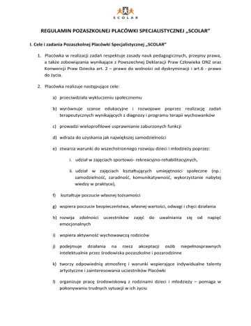 REGULAMIN POZASZKOLNEJ PLACÓWKI SPECJALISTYCZNEJ „SCOLAR” I. Cele i zadania Pozaszkolnej Placówki Specjalistycznej „SCOLAR” 1. Placówka w realizacji zadań respektuje zasady nauk pedagogicznych, przepisy prawa, a także zobowiązania wynikające z Powszechnej Deklaracji Praw Człowieka ONZ oraz Konwencji Praw Dziecka art. 2 – prawo do wolności od dyskryminacji i art.6 - prawo do życia. 2. Placówka realizuje następujące cele: a) przeciwdziała wykluczeniu społecznemu b) wyrównuje szanse edukacyjne i rozwojowe poprzez realizację zadań terapeutycznych wynikających z diagnozy i programu terapii wychowanków c) prowadzi wieloprofilowe usprawnianie zaburzonych funkcji d) wdraża do uzyskania jak największej samodzielności e) stwarza warunki do wszechstronnego rozwoju dzieci i młodzieży poprzez: i. udział w zajęciach sportowo- rekreacyjno-rehabilitacyjnych, ii. udział w zajęciach kształtujących umiejętności społeczne (np.: samodzielność, zaradność, komunikatywność, wykorzystanie nabytej wiedzy w praktyce), f) kształtuje poczucie własnej tożsamości g) wspiera poczucie bezpieczeństwa, własnej wartości, odwagi i chęci działania h) rozwija zdolności uczestników zajęć do uwalniania się od napięć emocjonalnych i) wspiera aktywność wychowawczą rodziców j) podejmuje działania na rzecz akceptacji osób niepełnosprawnych intelektualnie przez środowiska pozaszkolne i pozarodzinne k) tworzy odpowiednią atmosferę i warunki wspierające indywidualne talenty artystyczne i zainteresowania uczestników Placówki l) organizuje pracę środowiskową z rodzinami dzieci i młodzieży – pomaga w pokonywaniu trudnych sytuacji w ich życiu 3. Cele powyższe realizowane są poprzez: a) zajęcia wspierające edukację, zajęcia specjalistyczne: logopedię, treningi umiejętności społecznych, psychoterapię, terapię poznawczo-behawioralną b) zajęcia usprawniające w zakresie codziennej samoobsługi, rozwijające samodzielność i zaradność uczestników w życiu codziennym, c) organizację wypoczynku i rekreacji w terenie. II. Założenia organizacyjne 1. PPS „SCOLAR” czynna jest od poniedziałku do piątku w godzinach popołudniowych oraz w soboty w g. 9:00-19:00. W szczególnych sytuacjach godziny pracy PPS „SCOLAR” mogą zostać zmienione. 2. Do PPS „SCOLAR” uczęszczają dzieci zapisane przez ich rodziców/prawnych opiekunów. Zapisanie następuje na podstawie karty zgłoszenia dziecka do Pozaszkolnej Placówki Specjalistycznej „SCOLAR”, do której dołączone jest zaświadczenie o potrzebie kształcenia specjalnego, po przejściu procesu rekrutacji. 3. Karty zgłoszenia dziecka do Placówki są dostępne w PPS „SCOLAR”. 4. W momencie zgłoszenia dziecka do PPS „SCOLAR” rodzice zapoznają się i akceptują niniejszy Regulamin Pracy Pozaszkolnej Placówki Specjalistycznej „SCOLAR”. 5. Obowiązkiem rodziców/prawnych opiekunów jest przestrzeganie godzin pracy grupy, na którą uczęszcza ich dziecko i punktualnego odbierania dzieci po skończonych zajęciach. 6. Rodzic zobowiązany jest poinformować pracowników Placówki o ewentualnym spóźnieniu i o innej niż ustalona godzinie odbioru dziecka. 7. W przypadku zmiany wcześniejszych ustaleń rodzic zobowiązany jest do jak najszybszego poinformowania o tym dyrektora PPS „SCOLAR” i złożenia stosownego oświadczenia. 8. Wnioski i uwagi związane z funkcjonowaniem Pozaszkolnej Placówki Specjalistycznej „SCOLAR” rodzice mogą zgłaszać do dyrektora Placówki lub organu prowadzącego Fundacji Pomocy Edukacyjno-Terapeutycznej dla Niepełnosprawnych „SCOLAR”. III. Finansowe zasady działalności placówki 1. Czesne i inne opłaty pobierane są w celu pokrycia kosztów działalności Pozaszkolnej Placówki Specjalistycznej „SCOLAR”. 2. Wysokość czesnego ustala organ prowadzący, któremu podlega Placówka. 3. Rodzice zobowiązani są do wpłacania czesnego z góry, nie później niż do 10 dnia każdego miesiąca. 4. Uczestnictwo w imprezach poza terenem PPS „SCOLAR” (teatr, kino, wycieczki) są opłacane osobno IV. Odbiór dziecka po zajęciach 1. Dziecko po zajęciach może być odebrane przez rodziców, inną osobę upoważnioną przez rodziców na piśmie lub samodzielnie opuścić teren Placówki, jeśli ma stosowne pozwolenie. 2. Dziecko nie może być odebrane przez żadną inną osobę, która nie znajduje się na liście upoważnionych do odbioru. 3. Prowadzący zajęcia nie zastosuje sie do ustnych informacji przekazanych przez dziecko dotyczących np. jego wyjścia z Placówki. 4. Rodzic lub opiekun odbierający dziecko zawsze zgłasza zamiar odebrania dziecka osobie prowadzącej zajęcia. V. Podopieczni Placówki 1. Dziecko przebywające w PPS „SCOLAR” ma prawo do: a. znajomości swoich praw i obowiązków; b. życzliwego, podmiotowego traktowania; c. rozwijania swoich zainteresowań w miarę możliwości d. korzystania z pomocy prowadzących zajęcia e. swobody w wyrażaniu myśli i przekonań – jeżeli nie naruszają dóbr i godności innych osób; f. wpływania na planowanie pracy grupy, g. korzystania z wyposażenia Placówki. 2. Dziecko przebywające w PPS „SCOLAR” ma obowiązek: h. aktywnie uczestniczyć w zajęciach, i. dbać o ład i porządek w sali, j. stosować się do poleceń wychowawców świetlicy oraz pozostałych pracowników Placówki, k. zostawiać ubrania wierzchnie oraz obuwie w wyznaczonym miejscu w szatni, l. zgłaszać natychmiast wszelkie wypadki oraz złe samopoczucie, m. szanować sprzęt i wyposażenie, n. zachowywać się kulturalnie, o. przestrzegać regulaminu. 3. Dziecko uczęszczające do PPS „SCOLAR” winno przestrzegać wewnętrznego regulaminu Placówki. Notoryczne łamanie regulaminu będzie zgłaszane 4. 5. 6. 7. rodzicom/opiekunom dziecka i może skutkować skreśleniem z listy podopiecznych PPS „SCOLAR” Prowadzący zajęcia informują rodziców o zachowaniu dziecka. Za umyślne 