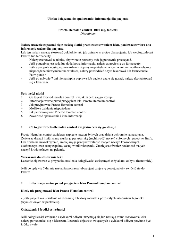 Ulotka dołączona do opakowania: informacja dla pacjenta Procto-Hemolan control 1000 mg, tabletki Diosminum Należy uważnie zapoznać się z treścią ulotki przed zastosowaniem leku, ponieważ zawiera ona informacje ważne dla pacjenta. Lek ten należy zawsze stosować dokładnie tak, jak opisano w ulotce dla pacjenta, lub według zaleceń lekarza lub farmaceuty. Należy zachować tę ulotkę, aby w razie potrzeby móc ją ponownie przeczytać. Jeśli potrzebna jest rada lub dodatkowa informacja, należy zwrócić się do farmaceuty. Jeśli u pacjenta wystąpią jakiekolwiek objawy niepożądane, w tym wszelkie możliwe objawy niepożądane niewymienione w ulotce, należy powiedzieć o tym lekarzowi lub farmaceucie. Patrz punkt 4. Jeśli po upływie 7 dni nie nastapiła poprawa lub pacjent czuje się gorzej, należy skontaktować się z lekarzem. Spis treści ulotki 1. Co to jest Procto-Hemolan control i w jakim celu się go stosuje 2. Informacje ważne przed przyjęciem leku Procto-Hemolan control 3. Jak przyjmować Procto-Hemolan control 4. Możliwe działania niepożądane 5. Jak przechowywać Procto-Hemolan control 6. Zawartość opakowania i inne informacje 1. Co to jest Procto-Hemolan control i w jakim celu się go stosuje Procto-Hemolan control zwiększa napięcie naczyń żylnych oraz działa ochronnie na naczynia. Zwiększa drenaż limfatyczny nasilając perystaltykę (ruchliwość) naczyń chłonnych i przepływ limfy. Lek działa na mikrokrążenie, zmniejszając przepuszczalność małych naczyń krwionośnych, okołonaczyniowe stany zapalne, zastój w mikrokrążeniu. Zmniejsza również podatność małych naczyń krwionośnych na pękanie. Wskazania do stosowania leku Leczenie objawowe w przypadku nasilenia dolegliwości związanych z żylakami odbytu (hemoroidy). Jeśli po upływie 7 dni nie nastapiła poprawa lub pacjent czuje się gorzej, należy zwrócić się do lekarza. 2. Informacje ważne przed przyjęciem leku Procto-Hemolan control Kiedy nie przyjmować leku Procto-Hemolan control - jeśli pacjent ma uczulenie na diosminę lub którykolwiek z pozostałych składników tego leku (wymienionych w punkcie 6). Ostrzeżenia i środki ostrożności Jeśli dolegliwości związane z żylakami odbytu utrzymują się lub nasilają mimo stosowania leku należy porozumieć się z lekarzem. Leczenie objawów związanych z żylakami odbytu powinno być krótkotrwałe. 1 Procto-Hemolan control a inne leki Należy powiedzieć lekarzowi o wszystkich lekach przyjmowanych przez pacjenta obecnie lub ostatnio, a także o lekach, które pacjent planuje przyjmować. Nie stwierdzono występowania interakcji z innymi lekami. Procto-Hemolan control z jedzeniem i piciem Lek należy przyjmować podczas posiłków. Ciąża i karmienie piersią Jeśli pacjentka jest w ciąży lub karmi piersią, przypuszcza że może być w ciąży lub gdy planuje mieć dziecko, powinna poradzić się lekarza lub farmaceuty przed zastosowaniem tego leku. Ciąża Lek może być stosowany w czasie ciąży jedynie w przypadku zdecydowanej konieczności, wyłącznie z przepisu lekarza. Jeżeli pacjentka zajdzie w ciążę w trakcie leczenia, należy zasięgnąć porady lekarza, ponieważ tylko lekarz może zdecydować, czy należy kontynuować leczenie. Karmienie piersią Ze względu na brak danych dotyczących przenikania do mleka kobiecego, stosowanie leku w okresie karmienia piersią jest niewskazane. Prowadzenie pojazdów i obsługiwanie maszyn Lek nie ma wpływu na prowadzenie pojazdów i obsługiwanie maszyn. 3. Jak przyjmować Procto-Hemolan control Ten lek należy zawsze przyjmować tak, jak to opisano w ulotce dla pacjenta lub według zaleceń lekarza lub farmaceuty. W razie wątpliwości należy zwrócić się do lekarza lub farmaceuty. Lek podaje się doustnie. Zalecana dawka 3 tabletki na dobę przez 4 dni, a następnie 2 tabletki na dobę przez kolejne 3 dni, podczas posiłków. Nie stosować większej niż zalecana dawki leku. Linia podziału na tabletce ułatwia tylko jej rozkruszenie, w celu łatwiejszego połknięcia, a nie podział na równe dawki. Przyjęcie większej niż zalecana dawki leku Procto-Hemolan control Nie odnotowano przypadków wystąpienia zatrucia lekiem z powodu jego przedawkowania. Przyjęcie większej niż zalecana dawki leku może powodować zaburzenia żołądkowo-jelitowe, wymioty i nudności. W razie przyjęcia większej niż zalecana dawki leku, należy niezwłocznie zwrócić się do lekarza lub farmaceuty. Pominięcie przyjęcia leku Procto-Hemolan control Nie należy stosować dawki podwójnej w celu uzupełnienia pominiętej dawki. W razie wątpliwości związanych ze stosowaniem tego leku należy zwrócić się do lekarza lub farmaceuty. Brak danych dotyczących skutków przerwania leczenia. 2 4. Możliwe działania niepożądane Jak każdy lek, lek ten może powodować działania niepożądane, chociaż nie u każdego one wystąpią. Mogą wystąpić następujące działania niepożądane Rzadko (występują u 1 do 10 osób na 10 000): - biegunka; - niestrawność; - nudności; - wymioty; - zawroty głowy; - ból głowy; - złe samopoczucie; - wysypka (swędzące, czerwone grudki na skórze); - świąd; - pokrzywka (jasnoróżowe, swędzące bąble na skórze). Zaobserwowane działania niepożądane nie powodują konieczności odstawienia leku. Zgłaszanie działań niepożądanych Jeśli wystąpią jakiekolwiek objawy niepożądane, w tym wszelkie możliwe objawy niepożądane niewymienione w ulotce, należy powiedzieć o tym lekarzowi lub farmaceucie. Działania niepożądane można zgłaszać bezpośrednio do Departamentu monitorowania Niepożądanych Działań Produktów Leczniczych Urzędu Rejestracji Produktów Leczniczych, Wyrobów Medycznych i Produktów Biobójczych: Al. Jerozolimskie 181C, 02-222 Warszawa Tel.: +48 22 49 21 301 Faks: +48 22 49 21 309 e-mail: [email protected] Dzięki zgłaszaniu działań niepożądanych można będzie zgromadzić więc