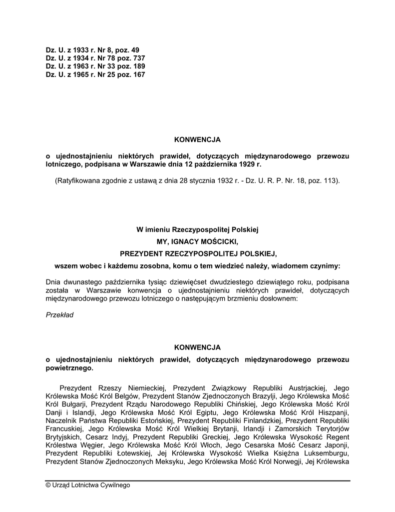 Dz. U. z 1933 r. Nr 8, poz. 49 Dz. U. z 1934 r. Nr 78 poz. 737 Dz. U. z 1963 r. Nr 33 poz. 189 Dz. U. z 1965 r. Nr 25 poz. 167 KONWENCJA o ujednostajnieniu niektórych prawideł, dotyczących międzynarodowego przewozu lotniczego, podpisana w Warszawie dnia 12 października 1929 r. (Ratyfikowana zgodnie z ustawą z dnia 28 stycznia 1932 r. - Dz. U. R. P. Nr. 18, poz. 113). W imieniu Rzeczypospolitej Polskiej MY, IGNACY MOŚCICKI, PREZYDENT RZECZYPOSPOLITEJ POLSKIEJ, wszem wobec i każdemu zosobna, komu o tem wiedzieć należy, wiadomem czynimy: Dnia dwunastego października tysiąc dziewięćset dwudziestego dziewiątego roku, podpisana została w Warszawie konwencja o ujednostajnieniu niektórych prawideł, dotyczących międzynarodowego przewozu lotniczego o następującym brzmieniu dosłownem: Przekład KONWENCJA o ujednostajnieniu niektórych prawideł, dotyczących międzynarodowego przewozu powietrznego. Prezydent Rzeszy Niemieckiej, Prezydent Związkowy Republiki Austrjackiej, Jego Królewska Mość Król Belgów, Prezydent Stanów Zjednoczonych Brazylji, Jego Królewska Mość Król Bułgarji, Prezydent Rządu Narodowego Republiki Chińskiej, Jego Królewska Mość Król Danji i Islandji, Jego Królewska Mość Król Egiptu, Jego Królewska Mość Król Hiszpanji, Naczelnik Państwa Republiki Estońskiej, Prezydent Republiki Finlandzkiej, Prezydent Republiki Francuskiej, Jego Królewska Mość Król Wielkiej Brytanji, Irlandji i Zamorskich Terytorjów Brytyjskich, Cesarz Indyj, Prezydent Republiki Greckiej, Jego Królewska Wysokość Regent Królestwa Węgier, Jego Królewska Mość Król Włoch, Jego Cesarska Mość Cesarz Japonji, Prezydent Republiki Łotewskiej, Jej Królewska Wysokość Wielka Księżna Luksemburgu, Prezydent Stanów Zjednoczonych Meksyku, Jego Królewska Mość Król Norwegji, Jej Królewska © Urząd Lotnictwa Cywilnego Dz. U. z 1933 r. Nr 8, poz. 49 ze zm. Strona 2 Mość Królowa Holandji, Prezydent Rzeczypospolitej Polskiej, Jego Królewska Mość Król Rumunji, Jego Królewska Mość Król Szwecji, Rada Związkowa Szwajcarska, Prezydent Republiki Czeskosłowackiej, Centralny Komitet Wykonawczy Związku Socjalistycznych Republik Rad, Prezydent Stanów Zjednoczonych Venezueli, Jego Królewska Mość Król Jugosławji, uznając pożyteczność uregulowania w sposób jednolity warunków międzynarodowego transportu lotniczego co się tyczy dokumentów, używanych dla tego transportu i odpowiedzialności przewożącego, wyznaczyli w tym celu swych odnośnych Pełnomocników, którzy, należycie upełnomocnieni zawarli i podpisali następującą konwencję: Rozdział pierwszy. Przedmiot – Definicje. Artykuł pierwszy. 1) Konwencja niniejsza ma zastosowanie do każdego przewozu międzynarodowego osób, bagażu, lub towarów, dokonywanego statkiem powietrznym za wynagrodzeniem. Ma ona również zastosowanie do przewozów bezpłatnych dokonywanych statkiem powietrznym przez przedsiębiorstwo przewozów powietrznych. 2) Za przewóz międzynarodowy w rozumieniu niniejszej Konwencji uważany jest każdy przewóz, w którym, zgodnie z umową stron, miejsce wyruszenia i miejsce przeznaczenia, niezależnie od tego, czy nastąpi lub nie nastąpi przerwa w przewozie lub przeładowaniu, położone są bądź na obszarze dwóch Wysokich Umawiających się Stron, bądź też na obszarze jednej tylko z nich, jeśli przewidziane jest lądowanie na obszarze innego Państwa, nawet nie umawiającego się. Przewóz bez takiego lądowania pomiędzy dwoma punktami na obszarze jednej tylko Wysokiej Umawiającej się Strony nie jest w rozumieniu niniejszej Konwencji uważany za przewóz międzynarodowy. 3) Przewóz, który ma być dokonany przez kilku następujących po sobie przewożących powietrzem, uważa się przy stosowaniu niniejszej Konwencji za jeden przewóz, jeśli uważany był przez Strony za jedną czynność, niezależnie od okoliczności, czy został objęty jedną umową czy też szeregiem umów. Nie traci on swego charakteru międzynarodowego przez fakt, że tylko jedna z umów lub szereg umów podlega całkowicie wykonaniu na obszarze tego samego Państwa. Artykuł 2. 1) Konwencja ma zastosowanie do przewozów dokonywanych przez Państwo lub inne osoby prawne prawa publicznego, przy zachowaniu warunków przewidzianych w artykule 1. 2) Niniejsza Konwencja nie stosuje się do przewozu poczty i paczek pocztowych. Rozdział II. © Urząd Lotnictwa Cywilnego Dz. U. z 1933 r. Nr 8, poz. 49 ze zm. Strona 3 Dokumenty przewozowe. Dział I. Bilety podróży Artykuł 3. a) b) c) 1) Przy przewozie pasażerów powinien być wydany bilet podróży, zawierający: oznaczenie miejsc wyruszenia i przeznaczenia; jeżeli miejsca wyruszenia i przeznaczenia są położone na obszarze jednej Wysokiej Umawiającej się Strony, a przewidziane jedno lub więcej lądowań na obszarze innego Państwa - oznaczenie miejsca jednego z tych lądowań; wzmiankę o tym, że jeżeli pasażerowie podejmują podróż z końcowym miejscem przeznaczenia lub z jednym lądowaniem w kraju innym, niż kraj wyruszenia, przewóz ich może podlegać Konwencji Warszawskiej, która z reguły ogranicza odpowiedzialność przewożącego w razie śmierci lub uszkodzenia ciała, jak również w razie zagubienia lub uszkodzenia bagażu. 2. Bilet podróży, do chwili dania dowodu przeciwnego, stanowi dowód zawarcia i warunków umowy o przewóz. Brak, nieprawidłowości lub zagubienie biletu nie narusza ani istnienia, ani ważności umowy o przewóz, która tym niemniej podlegać będzie postanowieniom niniejszej Konwencji. Jeśli jednak za zgodą przewożącego pasażer wchodzi na pokład, a bilet podróży nie został wydany, albo jeśli bilet nie zawiera wzmianki wymaganej w myśl ustępu 1 litera c) niniejszego artykułu, przewożący nie będzie miał prawa powoływania się na postanowienia artykułu 22. Dział II. Kwit bagażowy Artykuł 4. 1) Przy przewozie bagażu przyjętego do ekspedycji powinien być wyd