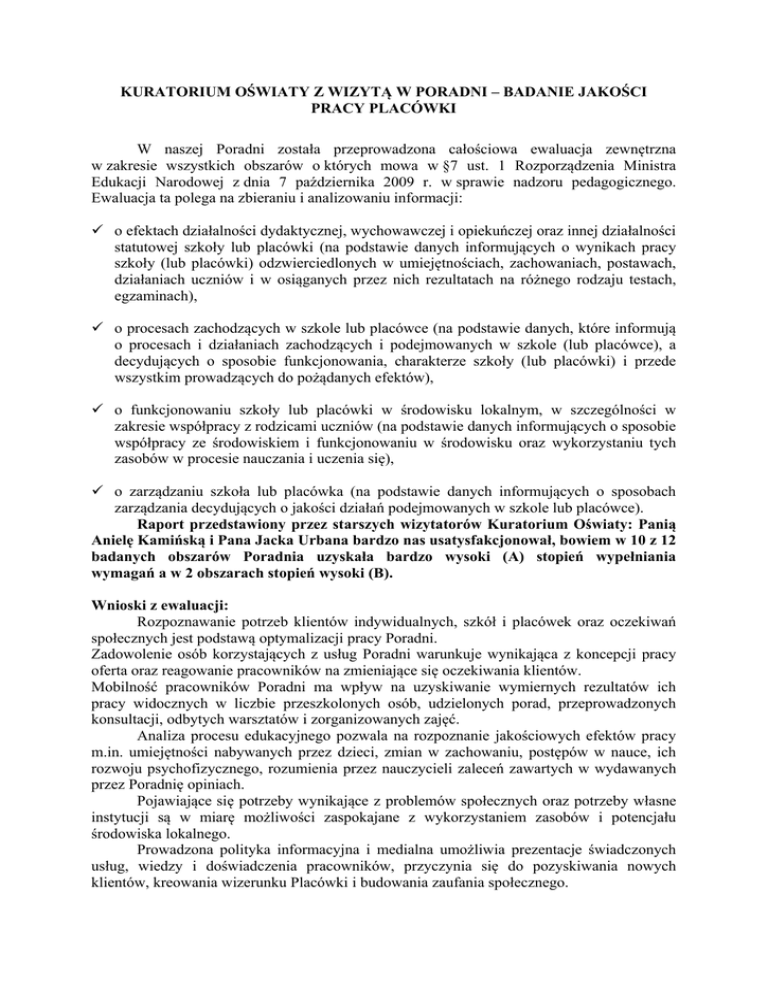 KURATORIUM OŚWIATY Z WIZYTĄ W PORADNI – BADANIE JAKOŚCI PRACY PLACÓWKI W naszej Poradni została przeprowadzona całościowa ewaluacja zewnętrzna w zakresie wszystkich obszarów o których mowa w §7 ust. 1 Rozporządzenia Ministra Edukacji Narodowej z dnia 7 października 2009 r. w sprawie nadzoru pedagogicznego. Ewaluacja ta polega na zbieraniu i analizowaniu informacji: o efektach działalności dydaktycznej, wychowawczej i opiekuńczej oraz innej działalności statutowej szkoły lub placówki (na podstawie danych informujących o wynikach pracy szkoły (lub placówki) odzwierciedlonych w umiejętnościach, zachowaniach, postawach, działaniach uczniów i w osiąganych przez nich rezultatach na różnego rodzaju testach, egzaminach), o procesach zachodzących w szkole lub placówce (na podstawie danych, które informują o procesach i działaniach zachodzących i podejmowanych w szkole (lub placówce), a decydujących o sposobie funkcjonowania, charakterze szkoły (lub placówki) i przede wszystkim prowadzących do pożądanych efektów), o funkcjonowaniu szkoły lub placówki w środowisku lokalnym, w szczególności w zakresie współpracy z rodzicami uczniów (na podstawie danych informujących o sposobie współpracy ze środowiskiem i funkcjonowaniu w środowisku oraz wykorzystaniu tych zasobów w procesie nauczania i uczenia się), o zarządzaniu szkoła lub placówka (na podstawie danych informujących o sposobach zarządzania decydujących o jakości działań podejmowanych w szkole lub placówce). Raport przedstawiony przez starszych wizytatorów Kuratorium Oświaty: Panią Anielę Kamińską i Pana Jacka Urbana bardzo nas usatysfakcjonował, bowiem w 10 z 12 badanych obszarów Poradnia uzyskała bardzo wysoki (A) stopień wypełniania wymagań a w 2 obszarach stopień wysoki (B). Wnioski z ewaluacji: Rozpoznawanie potrzeb klientów indywidualnych, szkół i placówek oraz oczekiwań społecznych jest podstawą optymalizacji pracy Poradni. Zadowolenie osób korzystających z usług Poradni warunkuje wynikająca z koncepcji pracy oferta oraz reagowanie pracowników na zmieniające się oczekiwania klientów. Mobilność pracowników Poradni ma wpływ na uzyskiwanie wymiernych rezultatów ich pracy widocznych w liczbie przeszkolonych osób, udzielonych porad, przeprowadzonych konsultacji, odbytych warsztatów i zorganizowanych zajęć. Analiza procesu edukacyjnego pozwala na rozpoznanie jakościowych efektów pracy m.in. umiejętności nabywanych przez dzieci, zmian w zachowaniu, postępów w nauce, ich rozwoju psychofizycznego, rozumienia przez nauczycieli zaleceń zawartych w wydawanych przez Poradnię opiniach. Pojawiające się potrzeby wynikające z problemów społecznych oraz potrzeby własne instytucji są w miarę możliwości zaspokajane z wykorzystaniem zasobów i potencjału środowiska lokalnego. Prowadzona polityka informacyjna i medialna umożliwia prezentacje świadczonych usług, wiedzy i doświadczenia pracowników, przyczynia się do pozyskiwania nowych klientów, kreowania wizerunku Placówki i budowania zaufania społecznego. Wewnętrzna komunikacja, formy wsparcia - coaching i superwizja, wzajemne konsultacje, praca zespołowa, doskonalenie zawodowe wpływają na podnoszenie kompetencji pracowników, a tym samym na jakość świadczonych usług. Troska o klienta, jego samopoczucie implikuje działania podejmowane przez Dyrektora Placówki oraz pracowników w celu stworzenia miłej, ciepłej i życzliwej atmosfery, przyjaznej zwłaszcza dzieciom korzystającym z usług Poradni. Opracowała mgrMałgorzata Piec, mgr Dorota Zemła
