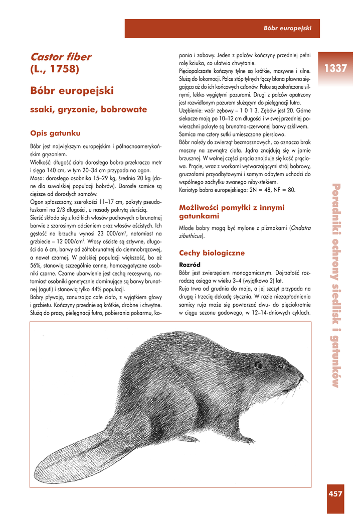 Bóbr Nazwa europejski ssaka Castor fiber (L., 1758) Bóbr europejski ssaki, gryzonie, bobrowate Opis gatunku Mo˝liwoÊci pomy∏ki z innymi gatunkami M∏ode bobry mogà byç mylone z pi˝makami (Ondatra zibethicus). Cechy biologiczne Rozród Bóbr jest zwierz´ciem monogamicznym. Dojrza∏oÊç rozrodczà osiàga w wieku 3–4 (wyjàtkowo 2) lat. Ruja trwa od grudnia do maja, a jej szczyt przypada na drugà i trzecià dekad´ stycznia. W razie niezap∏odnienia samicy ruja mo˝e si´ powtarzaç dwu- do pi´ciokrotnie w ciàgu sezonu godowego, w 12–14-dniowych cyklach. 1337 Poradniki ochrony siedlisk i gatunków Bóbr jest najwi´kszym europejskim i pó∏nocnoamerykaƒskim gryzoniem. WielkoÊç: d∏ugoÊç cia∏a doros∏ego bobra przekracza metr i si´ga 140 cm, w tym 20–34 cm przypada na ogon. Masa: doros∏ego osobnika 15–29 kg, Êrednio 20 kg (dane dla suwalskiej populacji bobrów). Doros∏e samice sà ci´˝sze od doros∏ych samców. Ogon sp∏aszczony, szerokoÊci 11–17 cm, pokryty pseudo∏uskami na 2/3 d∏ugoÊci, u nasady pokrytà sierÊcià. SierÊç sk∏ada si´ z krótkich w∏osów puchowych o brunatnej barwie z szarosinym odcieniem oraz w∏osów oÊcistych. Ich g´stoÊç na brzuchu wynosi 23 000/cm2, natomiast na grzbiecie – 12 000/cm2. W∏osy oÊciste sà sztywne, d∏ugoÊci do 6 cm, barwy od ˝ó∏tobrunatnej do ciemnobràzowej, a nawet czarnej. W polskiej populacji wi´kszoÊç, bo a˝ 56%, stanowià szczególnie cenne, homozygotyczne osobniki czarne. Czarne ubarwienie jest cechà recesywnà, natomiast osobniki genetycznie dominujàce sà barwy brunatnej (aguti) i stanowià tylko 44% populacji. Bobry p∏ywajà, zanurzajàc ca∏e cia∏o, z wyjàtkiem g∏owy i grzbietu. Koƒczyny przednie sà krótkie, drobne i chwytne. S∏u˝à do pracy, piel´gnacji futra, pobierania pokarmu, ko- pania i zabawy. Jeden z palców koƒczyny przedniej pe∏ni rol´ kciuka, co u∏atwia chwytanie. Pi´ciopalczaste koƒczyny tylne sà krótkie, masywne i silne. S∏u˝à do lokomocji. Palce stóp tylnych ∏àczy b∏ona p∏awna si´gajàca a˝ do ich koƒcowych cz∏onów. Palce sà zakoƒczone silnymi, lekko wygi´tymi pazurami. Drugi z palców opatrzony jest rozwidlonym pazurem s∏u˝àcym do piel´gnacji futra. Uz´bienie: wzór z´bowy – 1 0 1 3. Z´bów jest 20. Górne siekacze majà po 10–12 cm d∏ugoÊci i w swej przedniej powierzchni pokryte sà brunatno-czerwonej barwy szkliwem. Samica ma cztery sutki umieszczone piersiowo. Bóbr nale˝y do zwierzàt bezmosznowych, co oznacza brak moszny na zewnàtrz cia∏a. Jàdra znajdujà si´ w jamie brzusznej. W wolnej cz´Êci pràcia znajduje si´ koÊç pràciowa. Pràcie, wraz z workami wytwarzajàcymi strój bobrowy, gruczo∏ami przyodbytowymi i samym odbytem uchodzi do wspólnego zachy∏ku zwanego niby-stekiem. Kariotyp bobra europejskiego: 2N = 48, NF = 80. 457 Gatunki zwierzàt (z wyjàtkiem ptaków) – Ssaki Poradniki ochrony siedlisk i gatunków 1337 458 W trakcie jednego cyklu rujowego (kilkanaÊcie godzin) wyst´pujà dwa do pi´ciu aktów kopulacji. Kopulacja nast´puje w wodzie. Cià˝a trwa Êrednio 107 dni (105–109). Urodzenia majà miejsce od kwietnia do sierpnia, a ich szczyt przypada na maj i czerwiec. Samica rodzi raz w roku. Liczba m∏odych w miocie wynosi 1–6, Êrednio 2,7. Sà one w pe∏ni poroÊni´te futrem, z oczami przynajmniej cz´Êciowo otwartymi i wyr˝ni´tymi siekaczami. AktywnoÊç Bobry sà zwierz´tami ziemnowodnymi, doskonale przystosowanymi do bytowania w wodzie. P∏ywanie u∏atwia wrzecionowata budowa cia∏a. Bobry p∏ywajà doÊç wolno, lecz wytrwale. Âwietnie nurkujà i mogà przebywaç pod wodà przez 10 minut i d∏u˝ej. Potrafià pracowaç i ˝erowaç pod wodà. Bobry wykazujà wiele przystosowaƒ etologicznych do ˝ycia ziemnowodnego. Nale˝y do nich zapewnienie komfortu termicznego komory sypialnej. Konstrukcja z ga∏´zi i mu∏u zapewnia ciep∏ot´ schronienia. Budowa tam i tworzenie zalewów u∏atwiajà lokomocj´ i transport materia∏ów. Zebrane jesienià zapasy pokarmu redukujà do minimum promieƒ aktywnoÊci i zwiàzane z nià wydatki energetyczne zimà. ˚ycie bobrów zimà toczy si´ pod lodem, gdzie panujà w miar´ ∏agodne warunki termiczne. Gdy temperatura spada poni˝ej 0ºC i woda zamarza, bobry przechodzà na 26–29-godzinny rytm biologiczny z przed∏u˝onym do 20 godzin snem i skróconà fazà aktywnoÊci. Natomiast wiosnà i jesienià przed∏u˝ajà swà aktywnoÊç na cieplejsze godziny popo∏udniowe i wieczorne. Zimne ranki przesypiajà. Przy mrozie –10ºC bobry nie wychodzà na powierzchni´. AktywnoÊç bobrów na powierzchni lodu zimà wyst´puje tylko wówczas, gdy temperatury sà dodatnie. Zimà m∏ode sà mniej aktywne i d∏u˝ej ni˝ bobry doros∏e pozostajà w ˝eremiu lub norze. U jednorocznych i starszych bobrów wi´ksza cz´Êç zimowej aktywnoÊci jest zwiàzana z krótkimi wypadami pod lodem do niedalekich nor. Dobowà aktywnoÊç rodziny inicjuje jeden osobnik, zwykle doros∏y. Wychodzi jako pierwszy z ˝eremia lub nory. Doros∏y samiec cz´sto po wyjÊciu patroluje obwód zbiornika wodnego. AktywnoÊç bobrów wykazuje okreÊlony cykl roczny. Póênà zimà lub wczesnà wiosnà bobry wychodzà na lód i ˝erujà na brzegowej roÊlinnoÊci krzewiastej. W miar´ topnienia lodów aktywnoÊç ta wzrasta i rozpoczyna si´ zapachowe znakowanie terenu. Gdy lód znika zupe∏nie, ˝erowanie rozszerza si´ na ca∏e zaj´te stanowisko, a zakres znakowania gwa∏townie si´ powi´ksza. W tym czasie m∏ode bobry dochodzàce wieku dwóch lat zaczynajà si´ usamodzielniaç. JeÊli jednak zag´szczenie populacji jest bliskie wysycenia pojemnoÊci Êrodowiska, niektóre z nich pozostajà z rodzicami przez kolejny rok lub dwa. Odchodzenie m∏odych nie jest spowodowane zwi´kszonà agresywnoÊcià doros∏ych. Nie ca∏e rodzeƒstwo odchodzi razem. Emigranci podà˝ajà wzd∏u˝ cieków wod- nych i nie omijaj