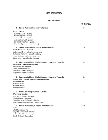 LISTA LAUREATÓW KATEGORIA B NR ZESPOŁU 1. Szkoła Muzyczna I stopnia w Wieliczce 1 Brass – Sekstet - Kamil Ulatowski – trąbka - Wiktor Popiołek – trąbka - Mateusz Ślimak – trąbka - Mateusz Rachwał – puzon - Gabriela Kwiecińska – puzon - Krzysztof Zygmunt – inst. Perkusyjne 2. Szkoła Muzyczna I-go stopnia w Niedźwiedziu Grizzly Saxophone Quartet Aleksandra Mróz – saksofon sopranowy Bartłomiej Kielusiak – saksofon altowy Paweł Kaciczak – saksofon tenorowy Dawid Lupa – saksofon barytonowy 18 3. Społeczna Publiczna Szkoła Muzyczna I stopnia w Tymbarku Mezoforte – kwartet skrzypcowy Wiktoria Grzyb- skrzypce Emilia Rząsa - skrzypce Dominika Kuchta - skrzypce Magdalena Pajdzik - skrzypce 20 4. Społeczna Publiczna Szkoła Muzyczna I stopnia w Tymbarku Quatro Cello Tymbark – Kwartet wiolonczelowy Klaudia Sasuła Zuzanna Górka Klaudia Zapalska Martyna Kędroń 21 5. Centre for Young Musician – London CYM String Quartet Leon Oliver Human - skrzypce Kamile Gowan - skrzypce Emmeline Rose McDonald - altówka Susannah Francesca Roman – wiolonczela 22 6. Szkoła Muzyczna I-go stopnia w Niedźwiedziu Smile Julia Skowronek - flet Krzysztof Skowronek - klarnet Maksymilian Klimek - fortepian Jakub Kaciczak - kontrabas 26 7. Powiatowa Szkoła Muzyczna I st. w Dywitach Trio fortepianowe PSM Dywity Zuzanna Zielińska – skrzypce Alan Dżbik – flet Filip Borowik – fortepian 52 8. Państwowa Szkoła Muzyczna I i II st. w Zielonej Górze Violin Guys Trio Mikołaj Górny – skrzypce Witold Kamiński – skrzypce Mikołaj Woźniak – fortepian 57 9. Społeczna Publiczna Szkoła Muzyczna I stopnia w Tymbarku Trio Piano Natalia Kokoszka – fortepian Dominika Kuchta – skrzypce Klaudia Sasuła – wiolonczela 63 10. Szkoła Muzyczna I stopnia w Dobczycach Duet Kamila Burnos – obój Filip Baran – flet 83 11. Państwowa Szkoła Muzyczna I st. im. F. Chopina w Nowym Sączu filia w Krynicy-Zdroju 87 Duet Joachim Drab – skrzypce Jakub Cieśla – fortepian