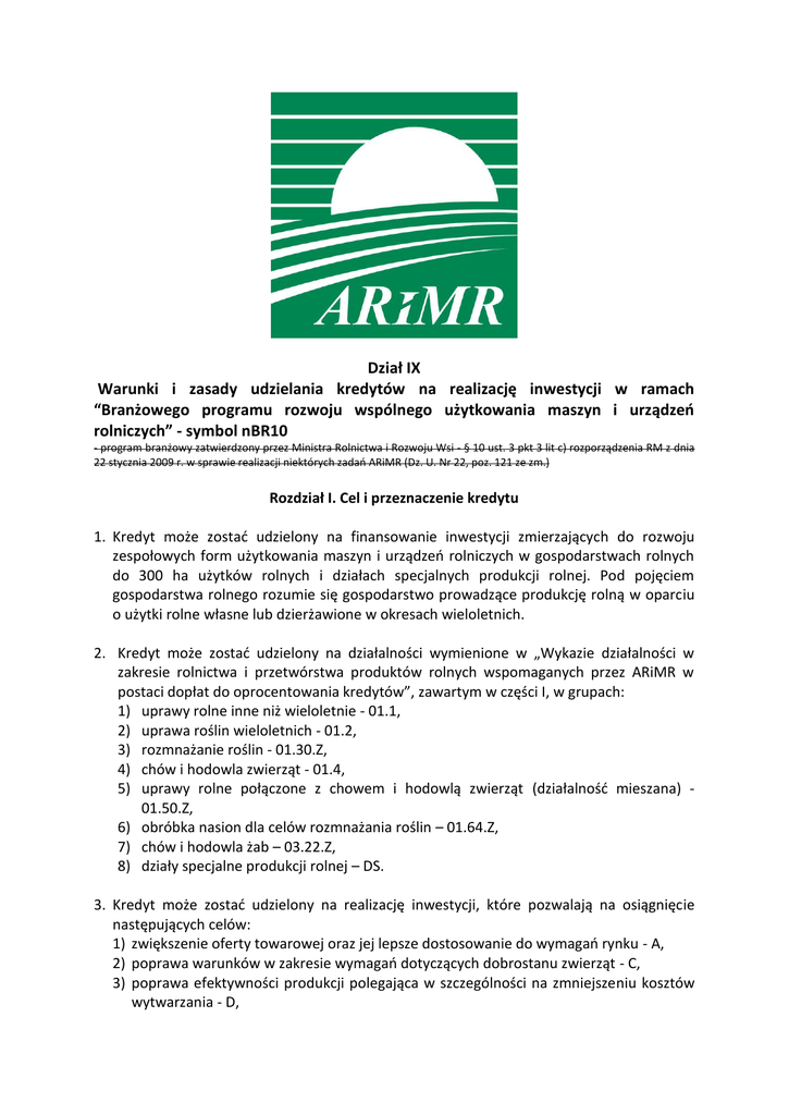 ączni1 do zarządzenia Nr.../2010 Prezesa ARiMR z dnia.......... Dział IX Warunki i zasady udzielania kredytów na realizację inwestycji w ramach “Branżowego programu rozwoju wspólnego użytkowania maszyn i urządzeń rolniczych” - symbol nBR10 - program branżowy zatwierdzony przez Ministra Rolnictwa i Rozwoju Wsi - § 10 ust. 3 pkt 3 lit c) rozporządzenia RM z dnia 22 stycznia 2009 r. w sprawie realizacji niektórych zadań ARiMR (Dz. U. Nr 22, poz. 121 ze zm.) Rozdział I. Cel i przeznaczenie kredytu 1. Kredyt może zostać udzielony na finansowanie inwestycji zmierzających do rozwoju zespołowych form użytkowania maszyn i urządzeń rolniczych w gospodarstwach rolnych do 300 ha użytków rolnych i działach specjalnych produkcji rolnej. Pod pojęciem gospodarstwa rolnego rozumie się gospodarstwo prowadzące produkcję rolną w oparciu o użytki rolne własne lub dzierżawione w okresach wieloletnich. 2. Kredyt może zostać udzielony na działalności wymienione w „Wykazie działalności w zakresie rolnictwa i przetwórstwa produktów rolnych wspomaganych przez ARiMR w postaci dopłat do oprocentowania kredytów”, zawartym w części I, w grupach: 1) uprawy rolne inne niż wieloletnie - 01.1, 2) uprawa roślin wieloletnich - 01.2, 3) rozmnażanie roślin - 01.30.Z, 4) chów i hodowla zwierząt - 01.4, 5) uprawy rolne połączone z chowem i hodowlą zwierząt (działalność mieszana) 01.50.Z, 6) obróbka nasion dla celów rozmnażania roślin – 01.64.Z, 7) chów i hodowla żab – 03.22.Z, 8) działy specjalne produkcji rolnej – DS. 3. Kredyt może zostać udzielony na realizację inwestycji, które pozwalają na osiągnięcie następujących celów: 1) zwiększenie oferty towarowej oraz jej lepsze dostosowanie do wymagań rynku - A, 2) poprawa warunków w zakresie wymagań dotyczących dobrostanu zwierząt - C, 3) poprawa efektywności produkcji polegająca w szczególności na zmniejszeniu kosztów wytwarzania - D, 4) utrzymanie lub poprawa warunków w zakresie wymagań dotyczących ochrony środowiska - E, 5) poprawa jakości i promocja produktów rolnych - H, 6) poprawa warunków pracy oraz lepsze wykorzystanie zasobów pracy - O, 7) tworzenie bazy surowcowej upraw roślin energetycznych – P. 4. Kredyt może zostać przeznaczony na sfinansowanie następujących inwestycji: 1) zakup lub instalację maszyn, urządzeń lub wyposażenia służącego do prowadzenia produkcji rolnej, przechowywania, magazynowania, przygotowywania produktów rolnych do sprzedaży, w tym sprzedaży bezpośredniej, obejmujących w szczególności: sprzęt do uprawy, pielęgnacji, ochrony, nawożenia oraz zbioru roślin, ciągniki rolnicze, przyczepy rolnicze, maszyny lub urządzenia do przygotowywania, przechowywania, czyszczenia, sortowania, kalibrowania lub konfekcjonowania produktów rolnych, maszyny lub urządzenia do przygotowywania lub składowania pasz, maszyny lub urządzenia do pojenia zwierząt i zadawania pasz, urządzenia do pozyskiwania lub przechowywania mleka, 2) koszty ogólne, które są bezpośrednio związane z przygotowaniem i realizacją inwestycji i które nie przekraczają 12% kwoty kredytu, obejmujące: a) przygotowanie dokumentacji technicznej inwestycji, b) opłaty za patenty lub licencje, c) koszty nadzoru urbanistycznego, architektonicznego, budowlanego lub konserwatorskiego. 5. Do kosztów zakupu materiałów niezbędnych do realizacji inwestycji, o których mowa w ust. 4 pkt 1), mogą zostać zaliczone koszty ich transportu do miejsca realizacji inwestycji, do wysokości 2% ich wartości. 6. Kredyt może zostać przeznaczony na zakup sprzętu rolniczego do wspólnego użytkowania również między rolnikiem i następcą, o ile posiadają oni odrębne gospodarstwa rolne lub działy specjalne produkcji rolnej. Rozdział II. Podmioty mogące ubiegać się o kredyt 1. O kredyt mogą ubiegać się osoby fizyczne prowadzące działalność wytwórczą w rolnictwie lub działach specjalnych produkcji rolnej, użytkujące zespołowo maszyny i urządzenia rolnicze: 1) posiadające pełną zdolność do czynności prawnych oraz 2) niebędące emerytami i rencistami mającymi ustalone prawo do renty z tytułu niezdolności do pracy. 1a. Jeżeli o kredyt ubiegają się małżonkowie, pomiędzy którymi istnieje wspólność majątkowa, przynajmniej jedno z nich musi spełniać warunki określone w ust. 1 pkt. 2. 2. Wspólnicy spółki cywilnej mogą ubiegać się o kredyt na realizację inwestycji polegających na zespołowym użytkowaniu maszyn i urządzeń rolniczych, pod warunkiem, że są jednocześnie właścicielami lub dzierżawcami w okresach wieloletnich odrębnych gospodarstw rolnych lub działów specjalnych produkcji rolnej. W planie inwestycji uwzględniają oni użytki rolne własne i dzierżawione, w tym użytki rolne wniesione do spółki cywilnej. Rozdział III. Pozostałe warunki 1. Warunki i zasady udzielania kredytów z linii nBR10 stosuje się razem z warunkami i zasadami udzielania kredytów inwestycyjnych na realizację inwestycji w rolnictwie i przetwórstwie produktów rolnych oraz na zakup akcji lub udziałów – część wspólna, określonymi w dziale I. 2. Pod pojęciem zespołowego użytkowania maszyn i urządzeń rolniczych należy rozumieć wspólne użytkowanie maszyn i urządzeń rolniczych w rozmiarach i terminach ustalonych w zawartej na piśmie pomiędzy osobami fizycznymi umowie cywilno-prawnej. 3. Umowa, o której mowa w ust. 2, powinna w szczególności określać: przedmiot wspólnego użytkowania, udziały we współwłasności, czas trwania umowy, rozmiary i terminy wykonywanych prac, zasady rozliczania kosztów eksploatacji sprzętu oraz zobowiązanie, że zakupiony przy udziale kredytu sprzęt wykorzystywany będzie wyłącznie dla potrzeb osób zawierających umowę. 4. Podmioty ubiegające się o kredyt zobowiązane są do: 1) wspólnego wystąpienia z wnioskiem o kredyt, 2) zakupu maszyn i urządzeń, które będą w