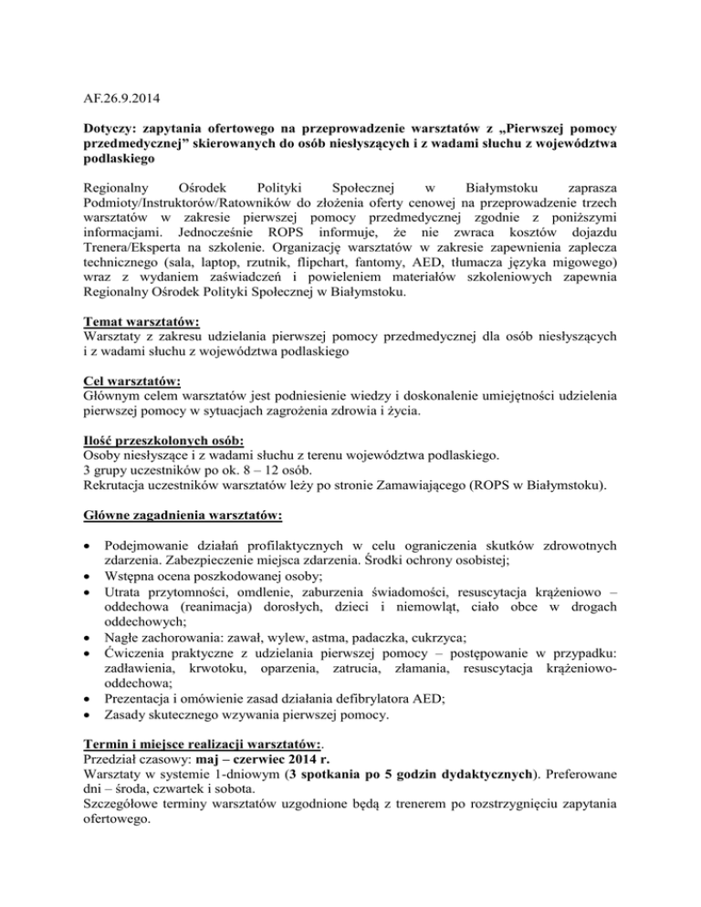 AF.26.9.2014 Dotyczy: zapytania ofertowego na przeprowadzenie warsztatów z „Pierwszej pomocy przedmedycznej” skierowanych do osób niesłyszących i z wadami słuchu z województwa podlaskiego Regionalny Ośrodek Polityki Społecznej w Białymstoku zaprasza Podmioty/Instruktorów/Ratowników do złożenia oferty cenowej na przeprowadzenie trzech warsztatów w zakresie pierwszej pomocy przedmedycznej zgodnie z poniższymi informacjami. Jednocześnie ROPS informuje, że nie zwraca kosztów dojazdu Trenera/Eksperta na szkolenie. Organizację warsztatów w zakresie zapewnienia zaplecza technicznego (sala, laptop, rzutnik, flipchart, fantomy, AED, tłumacza języka migowego) wraz z wydaniem zaświadczeń i powieleniem materiałów szkoleniowych zapewnia Regionalny Ośrodek Polityki Społecznej w Białymstoku. Temat warsztatów: Warsztaty z zakresu udzielania pierwszej pomocy przedmedycznej dla osób niesłyszących i z wadami słuchu z województwa podlaskiego Cel warsztatów: Głównym celem warsztatów jest podniesienie wiedzy i doskonalenie umiejętności udzielenia pierwszej pomocy w sytuacjach zagrożenia zdrowia i życia. Ilość przeszkolonych osób: Osoby niesłyszące i z wadami słuchu z terenu województwa podlaskiego. 3 grupy uczestników po ok. 8 – 12 osób. Rekrutacja uczestników warsztatów leży po stronie Zamawiającego (ROPS w Białymstoku). Główne zagadnienia warsztatów: Podejmowanie działań profilaktycznych w celu ograniczenia skutków zdrowotnych zdarzenia. Zabezpieczenie miejsca zdarzenia. Środki ochrony osobistej; Wstępna ocena poszkodowanej osoby; Utrata przytomności, omdlenie, zaburzenia świadomości, resuscytacja krążeniowo – oddechowa (reanimacja) dorosłych, dzieci i niemowląt, ciało obce w drogach oddechowych; Nagłe zachorowania: zawał, wylew, astma, padaczka, cukrzyca; Ćwiczenia praktyczne z udzielania pierwszej pomocy – postępowanie w przypadku: zadławienia, krwotoku, oparzenia, zatrucia, złamania, resuscytacja krążeniowooddechowa; Prezentacja i omówienie zasad działania defibrylatora AED; Zasady skutecznego wzywania pierwszej pomocy. Termin i miejsce realizacji warsztatów:. Przedział czasowy: maj – czerwiec 2014 r. Warsztaty w systemie 1-dniowym (3 spotkania po 5 godzin dydaktycznych). Preferowane dni – środa, czwartek i sobota. Szczegółowe terminy warsztatów uzgodnione będą z trenerem po rozstrzygnięciu zapytania ofertowego. Warsztaty odbędą się w siedzibie Regionalnego Ośrodka Polityki Społecznej w Białymstoku przy ul. Kombatantów 7. Oferta powinna zawierać: Proponowaną stawkę brutto za godzinę dydaktyczną zajęć; Konspekt (scenariusz) realizacji zajęć warsztatowych; CV trenera, dokumenty potwierdzające posiadane kwalifikacje do prowadzenia zajęć z zakresu pierwszej pomocy przedmedycznej (np.: wykształcenie wyższe medyczne lub dyplom potwierdzający kwalifikacje ratownika medycznego, opis doświadczenia w ww. tematyce warsztatów); Minimum dwie referencje dot. zrealizowania warsztatów ww. tematyce wystawione na trenera, który będzie wykonywał zlecenie, bądź wystawione na trenera, którym podmiot będzie posługiwał się w celu wykonania zlecenia. Referencja powinna zawierać: pozytywną opinię o przeprowadzonych warsztatach; musi być wystawiona przez niezależny podmiot zewnętrzny; musi zawierać informacje dotyczące: daty przeprowadzenia warsztatów, ilości godzin, liczby odbiorców (w przypadku braku ww. informacji niezbędne jest oświadczenie uzupełniające). Referencje, które nie spełnią powyższych warunków będą odrzucone. Referencje różne wystawione przez ten sam podmiot zewnętrzny będą liczone jako jedna referencja. Kryterium wyboru oferty: Kwalifikacje, umiejętności oraz doświadczenie trenera w wyżej wymienionej tematyce; Zindywidualizowana ocena przydatności i kwalifikacji osoby (osób) skierowanych do świadczenia zlecenia/usługi. Adekwatność doświadczenia i posiadanych umiejętności do proponowanej stawki cenowej (40% - cena, 60% - pozostałe kryteria oceny). Przedłożenie wszystkich wymaganych w niniejszym zapytaniu ofertowym dokumentów. Zasady przyznania punktów: 1. Za cenę najniższą oferta otrzyma 40 %. Natomiast wartość procentowa pozostałych cen ofert będzie obliczana na podstawie wzoru: gdzie: P – procenty przyznane Oferentowi za cenę Cn – najniższa zaoferowana cena Cob – cena zaoferowana w ofercie badanej. 2. Za pozostałe kryteria oceny oferent może otrzymać maksymalnie 60% w podziale: 30% za kwalifikacje merytoryczne oraz 30% za doświadczenie. a) Kwalifikacje trenera oceniane będą na podstawie złożonych kopii świadectw, dyplomów i innych zaświadczeń, potwierdzających ukończenie poszczególnych form szkoleniowych. Oferent może otrzymać maksymalnie 30%. b) Doświadczenie trenera oceniane będzie na podstawie złożonego CV, opisu doświadczenia: Za staż pracy trenera w zakresie, którego dotyczy zapytanie ofertowe: Od 2 lat do 5 lat – 4%, Od 6 lat do 10 lat – 7%, Powyżej 10 lat – 15%, za liczbę zrealizowanych szkoleń przez trenera w zakresie określonym w zapytaniu ofertowym na podstawie przedstawionych referencji: od 1 do 2 referencji – 4%, od 3 do 5 referencji – 7%, powyżej 5 referencji – 15%. Zamawiający zastrzega sobie prawo do unieważnienia postepowania w każdym czasie bez podania przyczyny. W związku z powyższym uprzejmie prosimy o przesyłanie ofert wyłącznie drogą elektroniczną na adres e–mail: [email protected] w terminie do dnia 25.04.2014 r. do godz. 11:00. Oferta przesłana drogą mailową zostanie uznana za dostarczoną, w momencie, gdy Zamawiający potwierdzi mailowo Oferentowi fakt jej otrzymania.