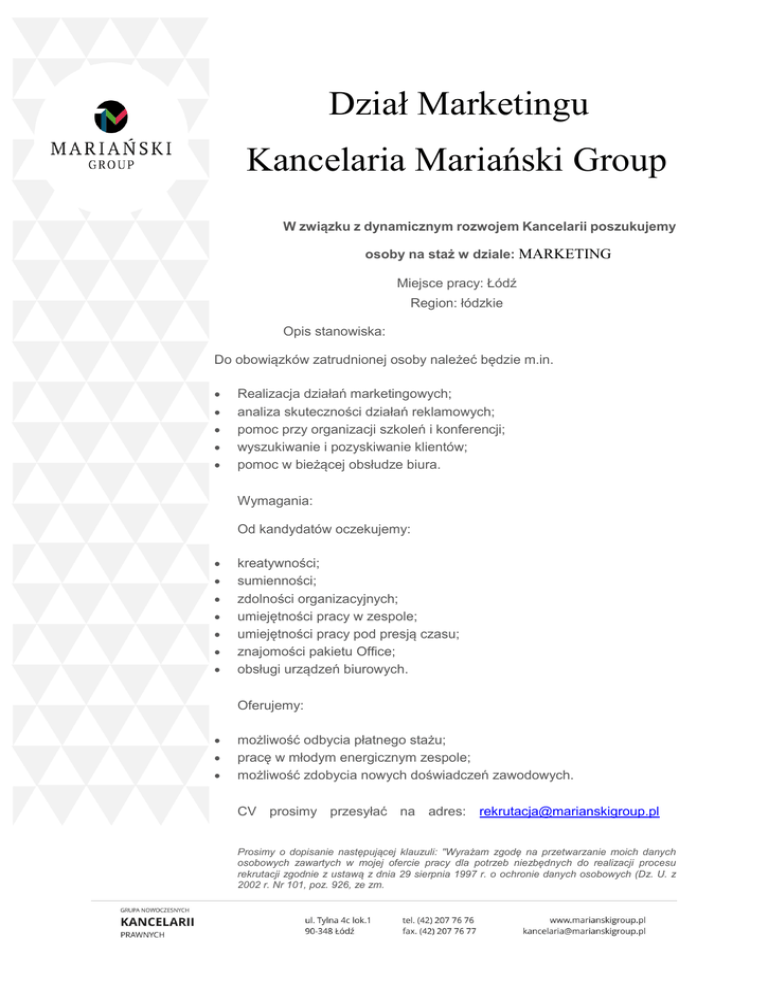 Dział Marketingu Kancelaria Mariański Group W związku z dynamicznym rozwojem Kancelarii poszukujemy osoby na staż w dziale: MARKETING Miejsce pracy: Łódź Region: łódzkie Opis stanowiska: Do obowiązków zatrudnionej osoby należeć będzie m.in. Realizacja działań marketingowych; analiza skuteczności działań reklamowych; pomoc przy organizacji szkoleń i konferencji; wyszukiwanie i pozyskiwanie klientów; pomoc w bieżącej obsłudze biura. Wymagania: Od kandydatów oczekujemy: kreatywności; sumienności; zdolności organizacyjnych; umiejętności pracy w zespole; umiejętności pracy pod presją czasu; znajomości pakietu Office; obsługi urządzeń biurowych. Oferujemy: możliwość odbycia płatnego stażu; pracę w młodym energicznym zespole; możliwość zdobycia nowych doświadczeń zawodowych. CV prosimy przesyłać na adres: [email protected] Prosimy o dopisanie następującej klauzuli: "Wyrażam zgodę na przetwarzanie moich danych osobowych zawartych w mojej ofercie pracy dla potrzeb niezbędnych do realizacji procesu rekrutacji zgodnie z ustawą z dnia 29 sierpnia 1997 r. o ochronie danych osobowych (Dz. U. z 2002 r. Nr 101, poz. 926, ze zm.