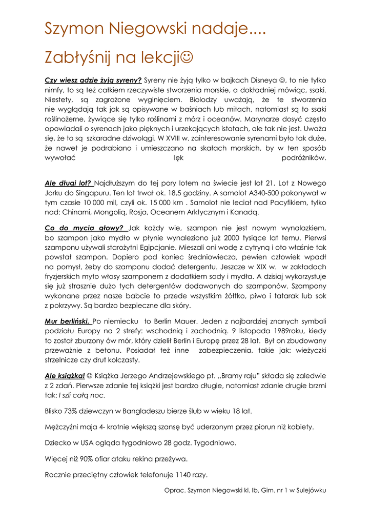 Szymon Niegowski nadaje.... Zabłyśnij na lekcji☺ Czy wiesz gdzie Ŝyją syreny? Syreny nie Ŝyją tylko w bajkach Disneya ☺, to nie tylko nimfy, to są teŜ całkiem rzeczywiste stworzenia morskie, a dokładniej mówiąc, ssaki. Niestety, są zagroŜone wyginięciem. Biolodzy uwaŜają, Ŝe te stworzenia nie wyglądają tak jak są opisywane w baśniach lub mitach, natomiast są to ssaki roślinoŜerne, Ŝywiące się tylko roślinami z mórz i oceanów. Marynarze dosyć często opowiadali o syrenach jako pięknych i urzekających istotach, ale tak nie jest. UwaŜa się, Ŝe to są szkaradne dziwolągi. W XVIII w. zainteresowanie syrenami było tak duŜe, Ŝe nawet je podrabiano i umieszczano na skałach morskich, by w ten sposób wywołać lęk podróŜników. Ale długi lot? NajdłuŜszym do tej pory lotem na świecie jest lot 21. Lot z Nowego Jorku do Singapuru. Ten lot trwał ok. 18,5 godziny. A samolot A340-500 pokonywał w tym czasie 10 000 mil, czyli ok. 15 000 km . Samolot nie leciał nad Pacyfikiem, tylko nad: Chinami, Mongolią, Rosja, Oceanem Arktycznym i Kanadą. Co do mycia głowy? Jak kaŜdy wie, szampon nie jest nowym wynalazkiem, bo szampon jako mydło w płynie wynaleziono juŜ 2000 tysiące lat temu. Pierwsi szamponu uŜywali staroŜytni Egipcjanie. Mieszali oni wodę z cytryną i oto właśnie tak powstał szampon. Dopiero pod koniec średniowiecza, pewien człowiek wpadł na pomysł, Ŝeby do szamponu dodać detergentu. Jeszcze w XIX w. w zakładach fryzjerskich myto włosy szamponem z dodatkiem sody i mydła. A dzisiaj wykorzystuje się juŜ strasznie duŜo tych detergentów dodawanych do szamponów. Szampony wykonane przez nasze babcie to przede wszystkim Ŝółtko, piwo i tatarak lub sok z pokrzywy. Są bardzo bezpieczne dla skóry. Mur berliński. Po niemiecku to Berlin Mauer. Jeden z najbardziej znanych symboli podziału Europy na 2 strefy: wschodnią i zachodnią. 9 listopada 1989roku, kiedy to został zburzony ów mór, który dzielił Berlin i Europę przez 28 lat. Był on zbudowany przewaŜnie z betonu. Posiadał teŜ inne zabezpieczenia, takie jak: wieŜyczki strzelnicze czy drut kolczasty. Ale ksiąŜka! ☺ KsiąŜka Jerzego Andrzejewskiego pt. ,,Bramy raju” składa się zaledwie z 2 zdań. Pierwsze zdanie tej ksiąŜki jest bardzo długie, natomiast zdanie drugie brzmi tak: I szli całą noc. Blisko 73% dziewczyn w Bangladeszu bierze ślub w wieku 18 lat. MęŜczyźni maja 4- krotnie większą szansę być uderzonym przez piorun niŜ kobiety. Dziecko w USA ogląda tygodniowo 28 godz. Tygodniowo. Więcej niŜ 90% ofiar ataku rekina przeŜywa. Rocznie przeciętny człowiek telefonuje 1140 razy. Oprac. Szymon Niegowski kl. Ib, Gim. nr 1 w Sulejówku